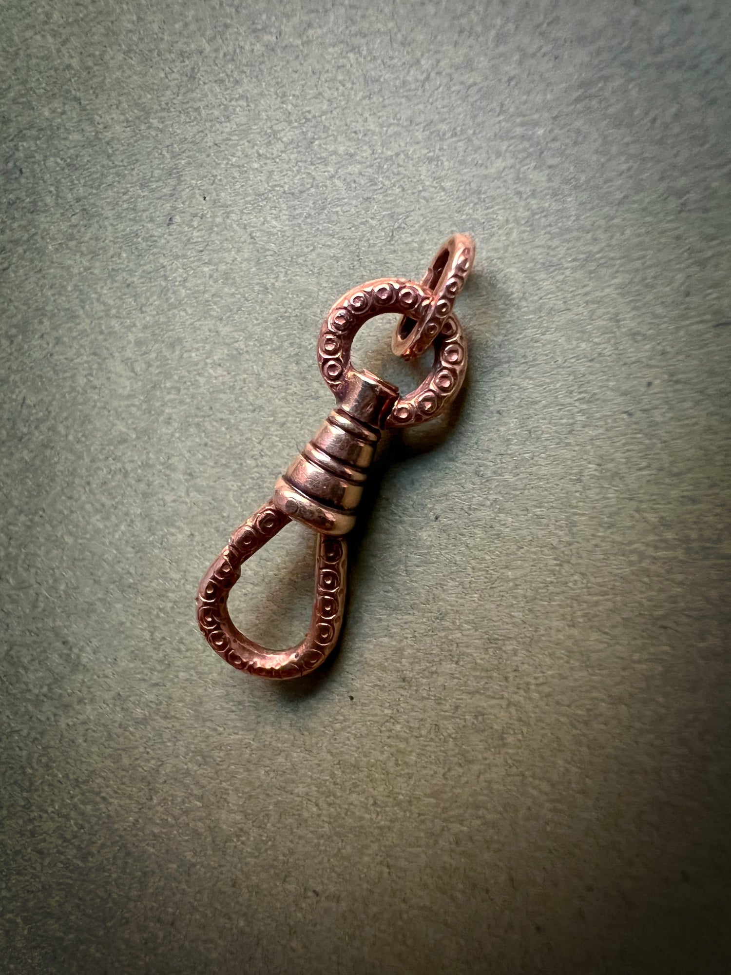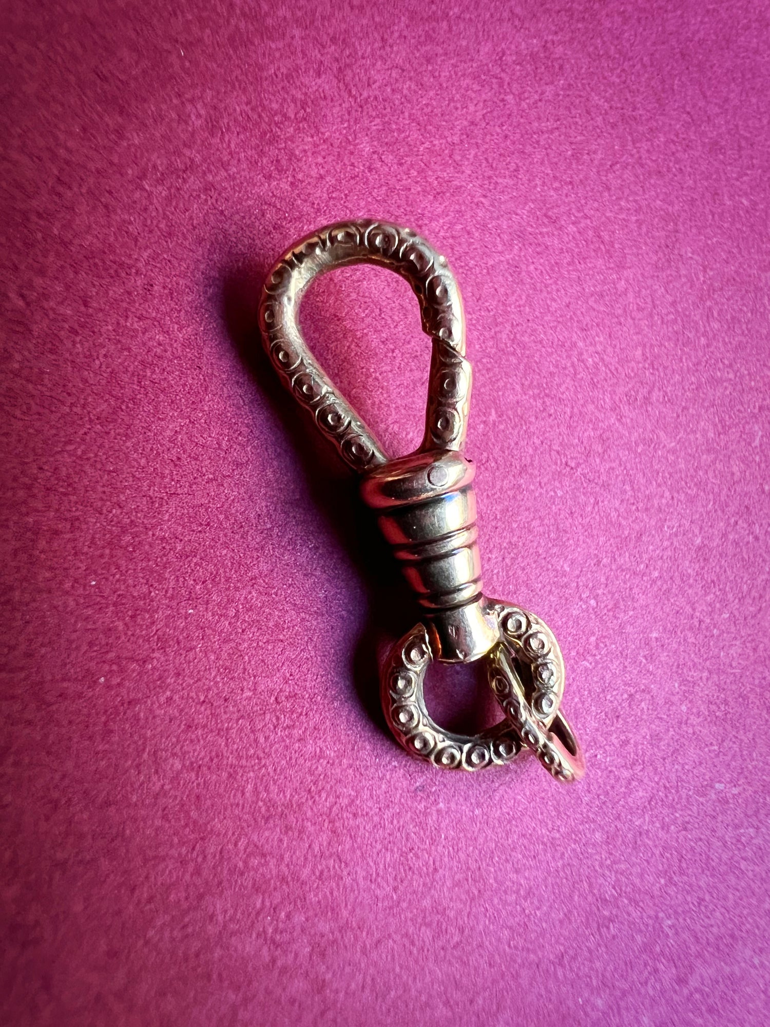 What makes this dog clip special is the gorgeous chased circular pattern over the entire piece, and on the matching jump ring.
