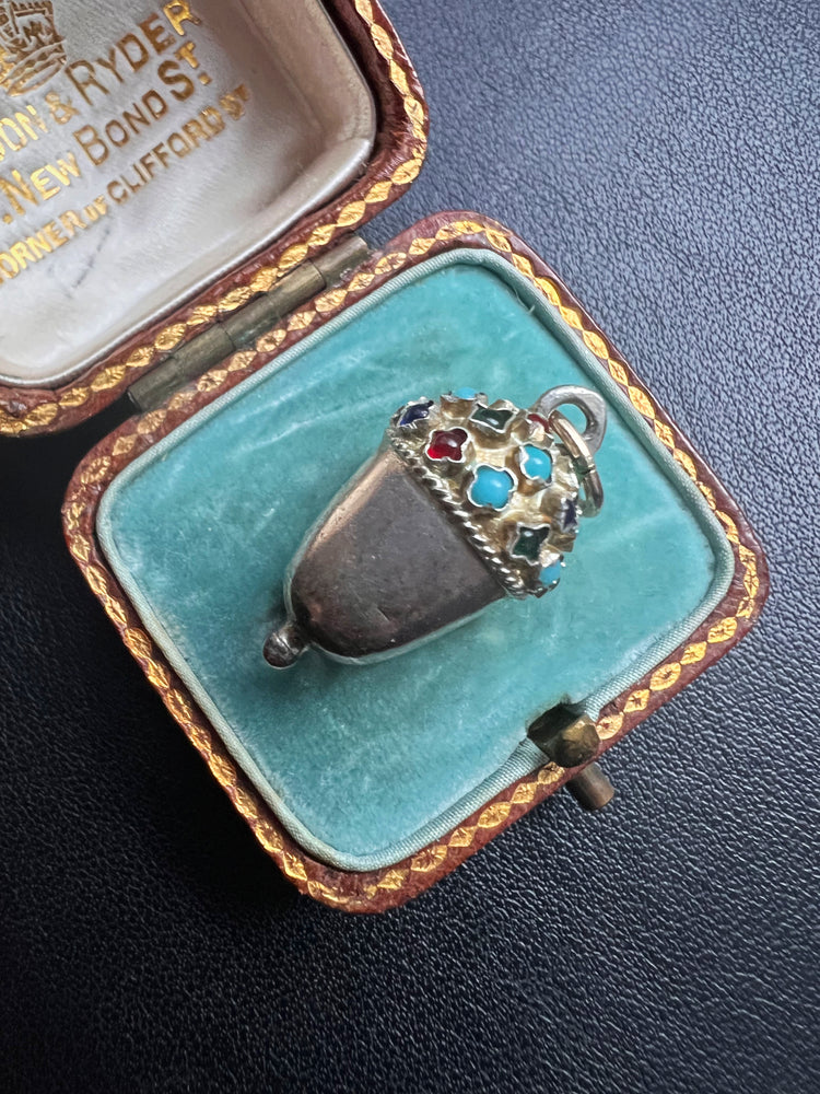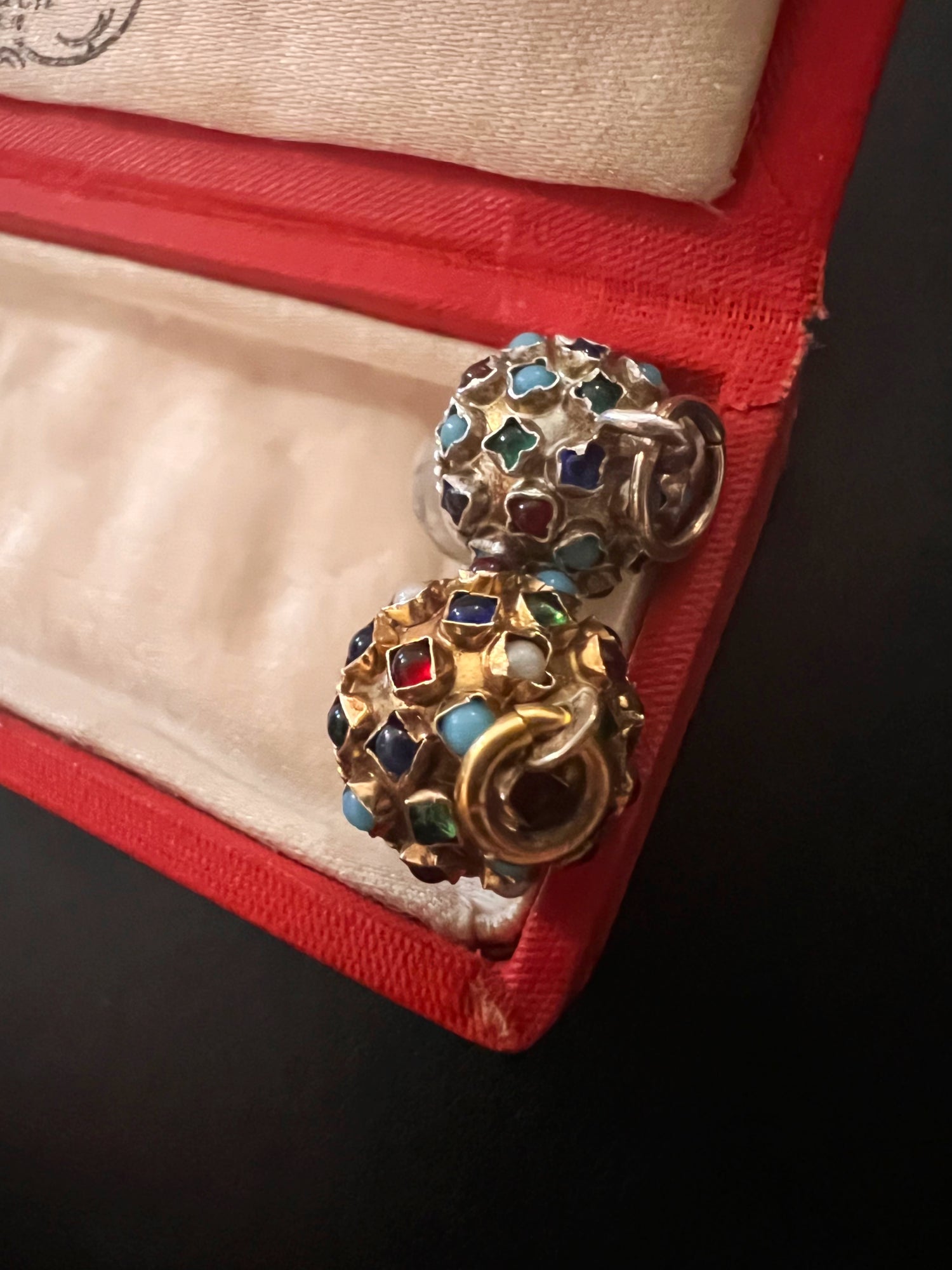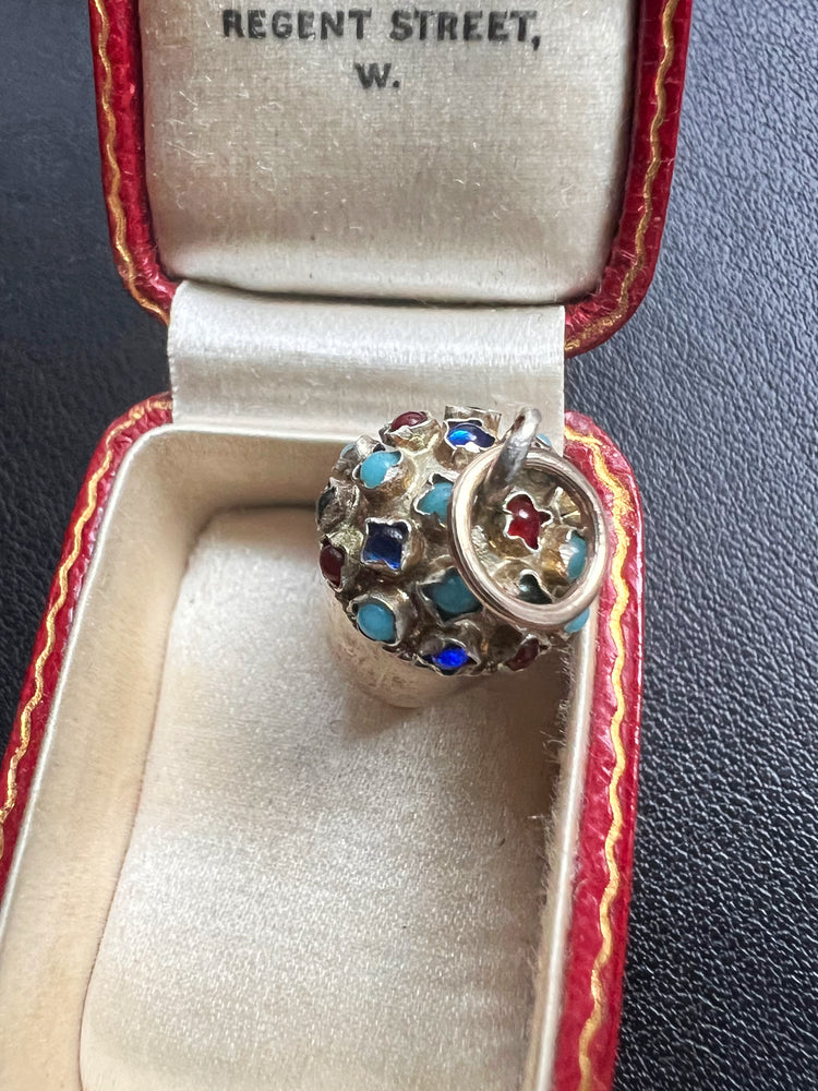 The Sputnik style top is set with an array of different stones including turquoise, sapphire and paste.