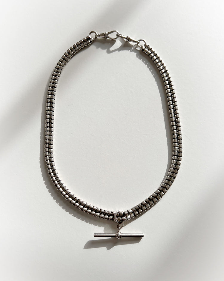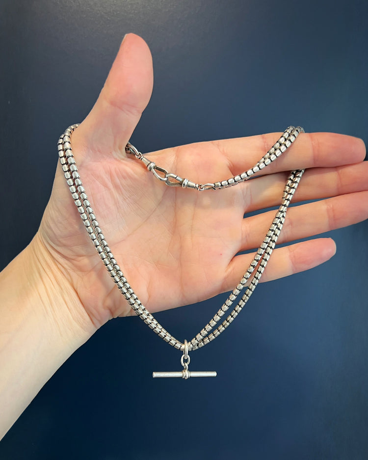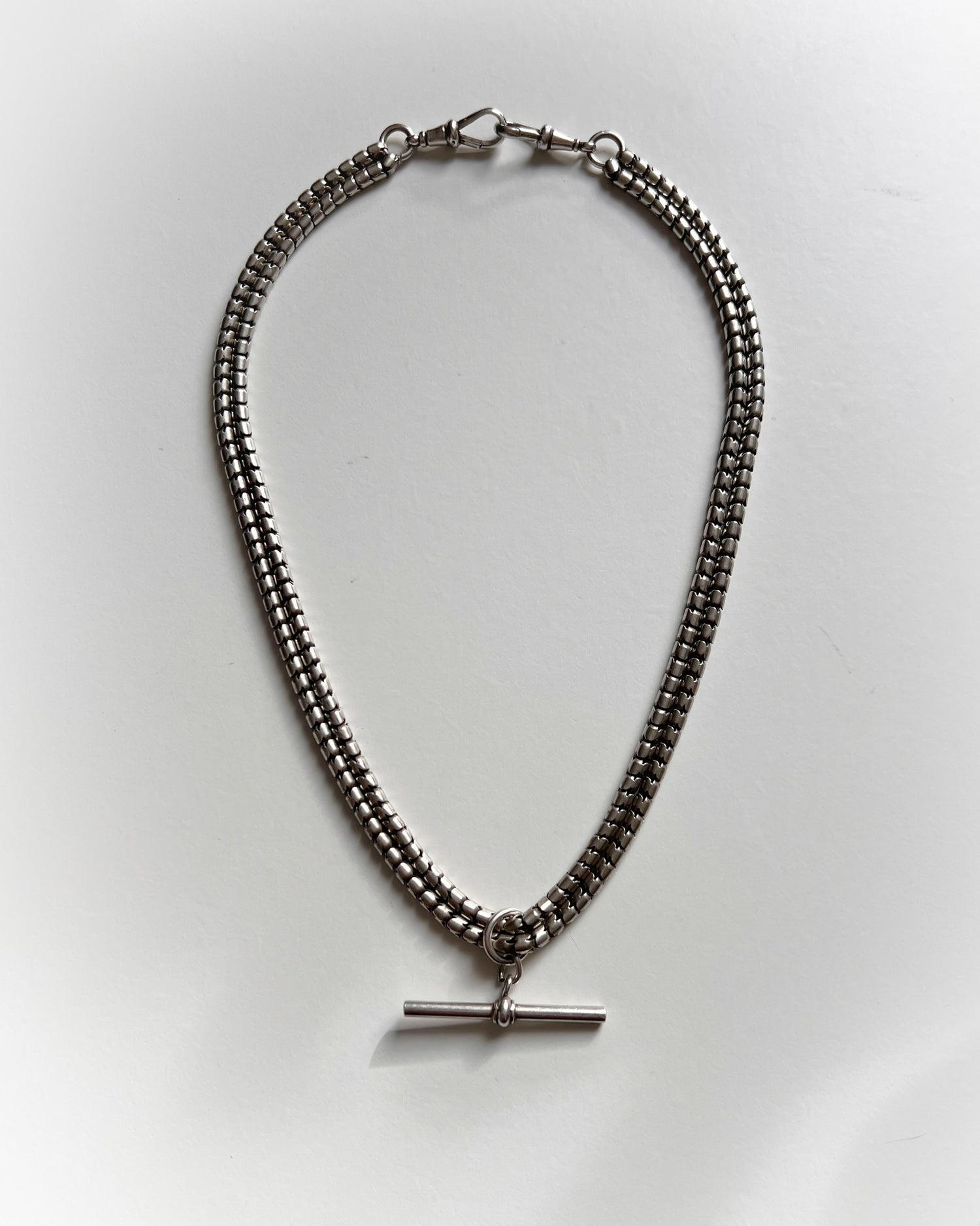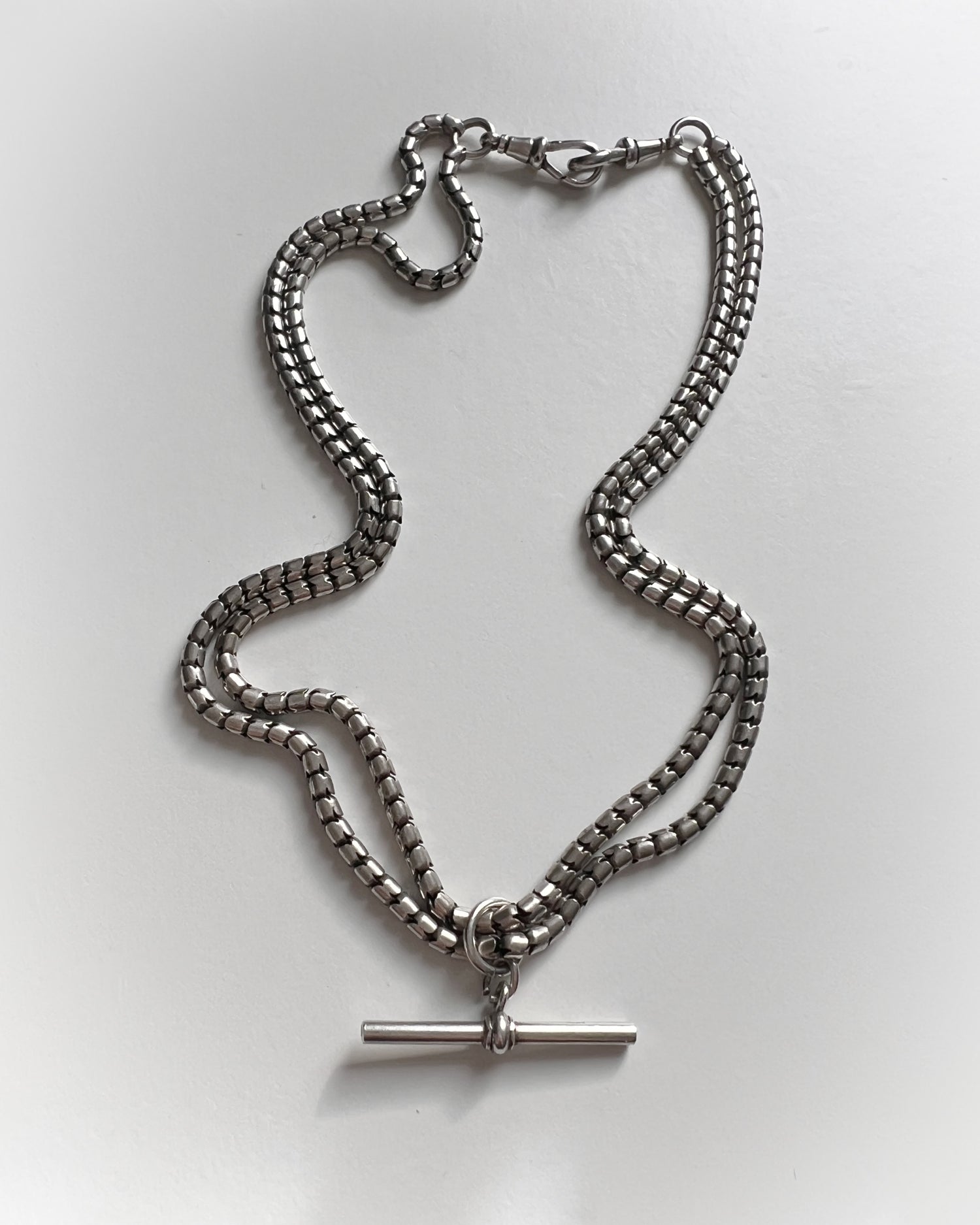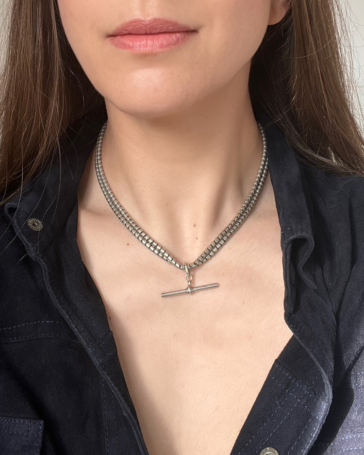 The t-bar isn’t fixed so slides up and down the chain, which ensures it always sits in the centre when worn.