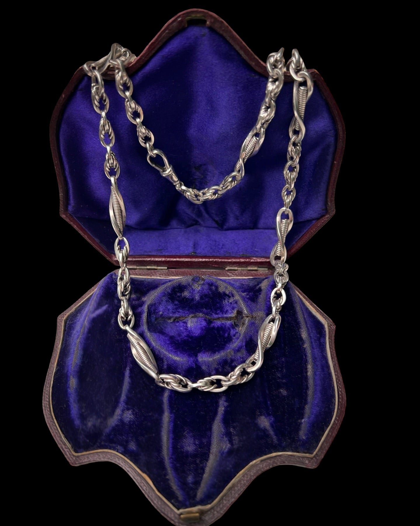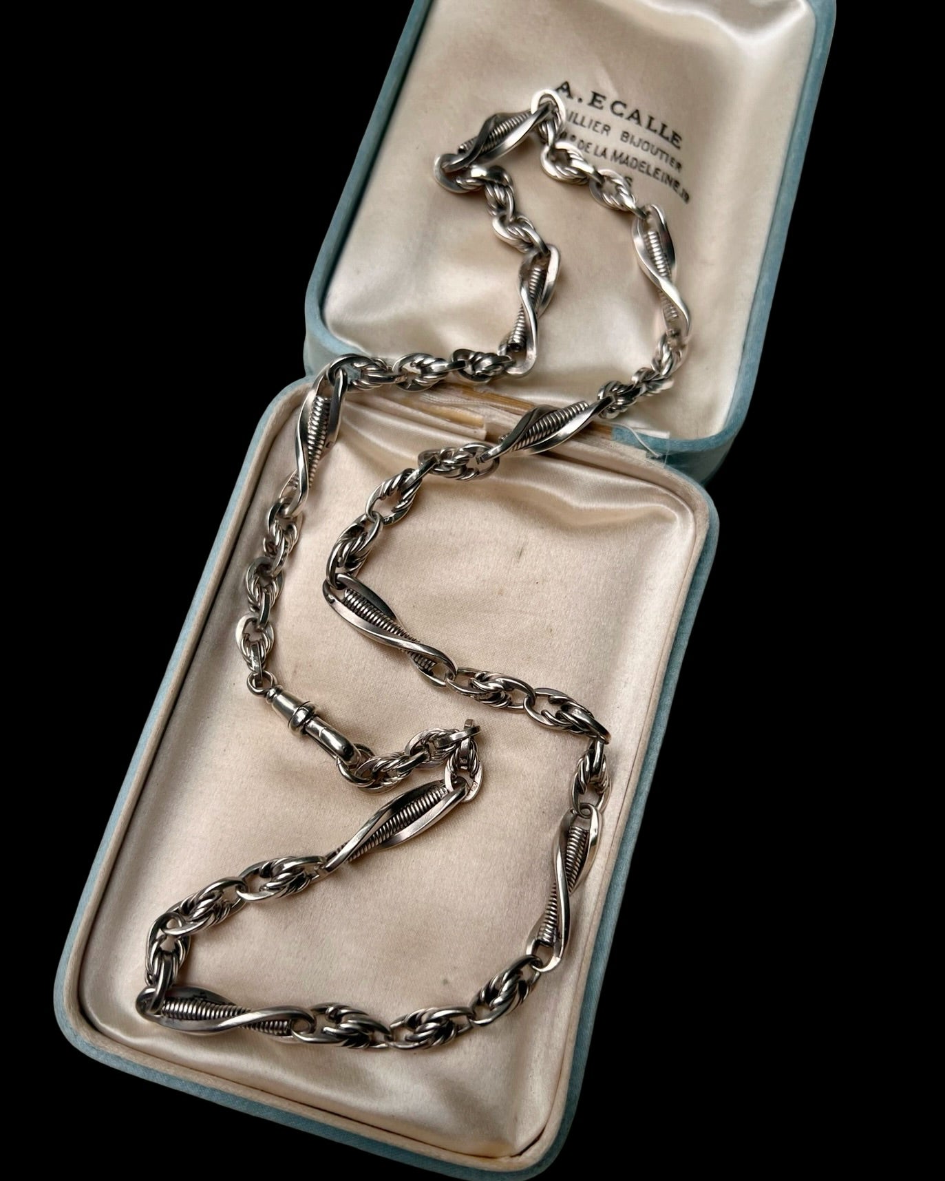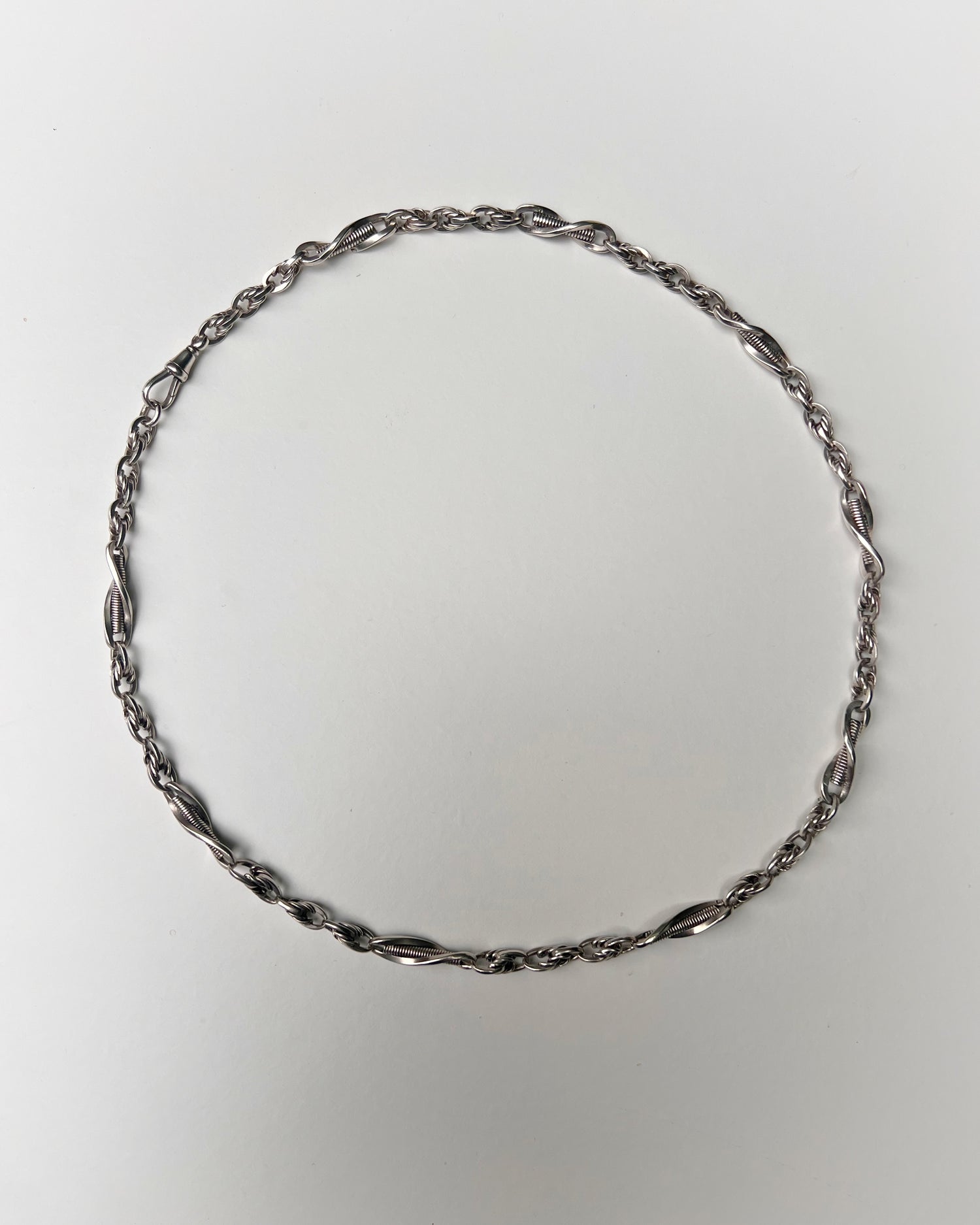 The chain is made of bright sterling silver, with elongated twist links each with a coiled silver centre, interspaced with sections of lovers knot links.