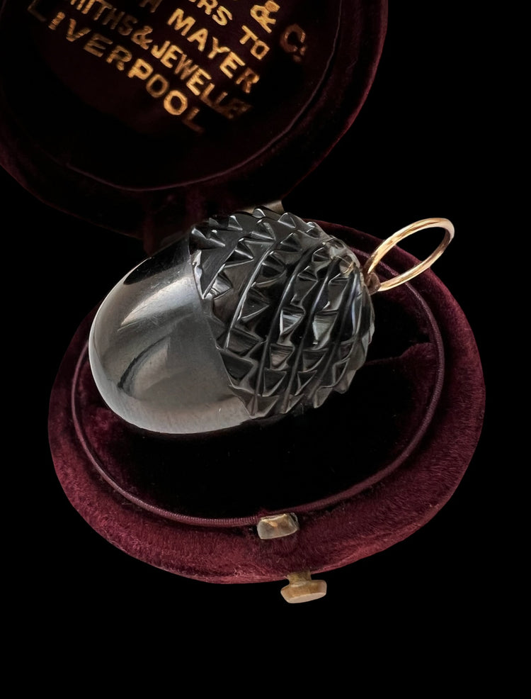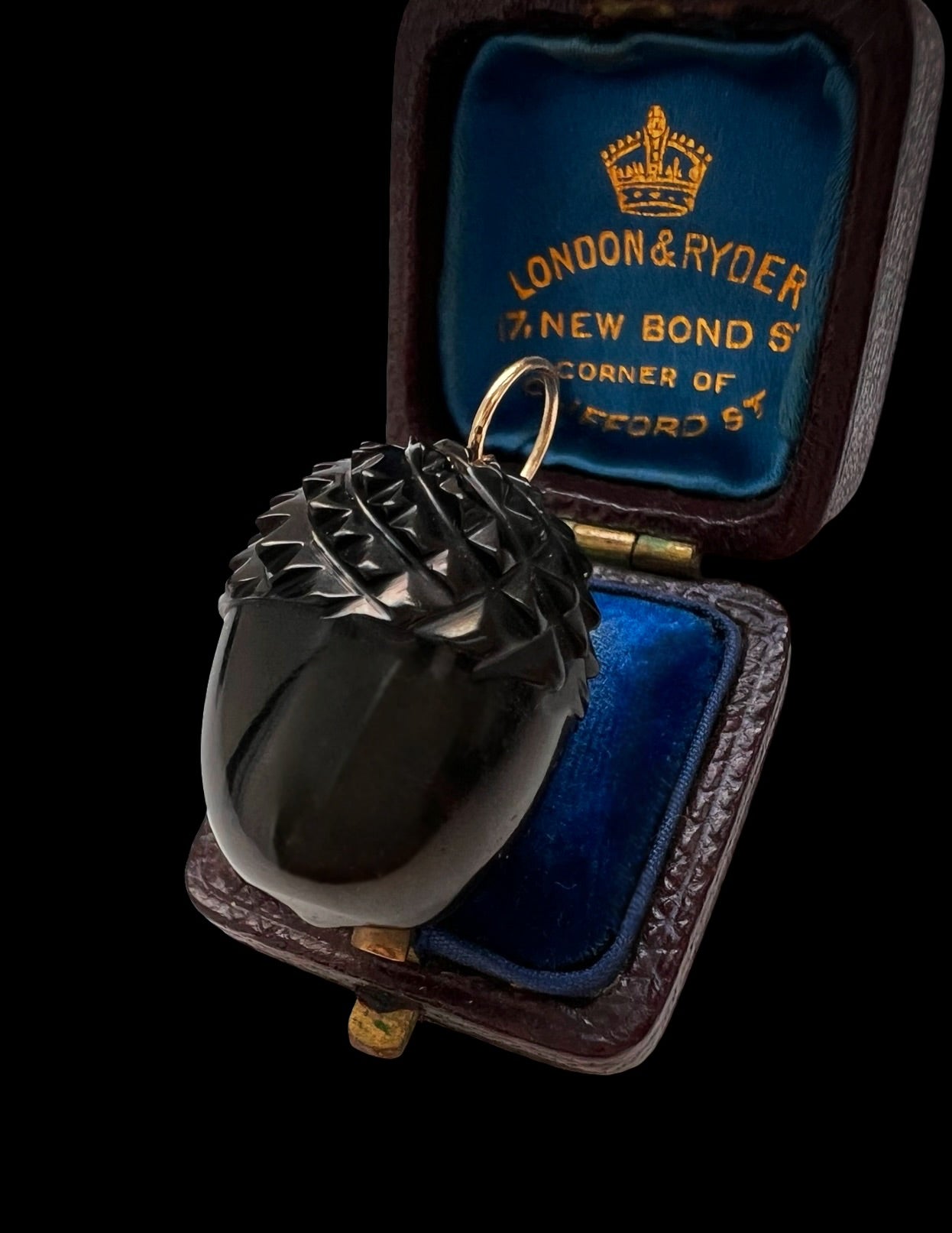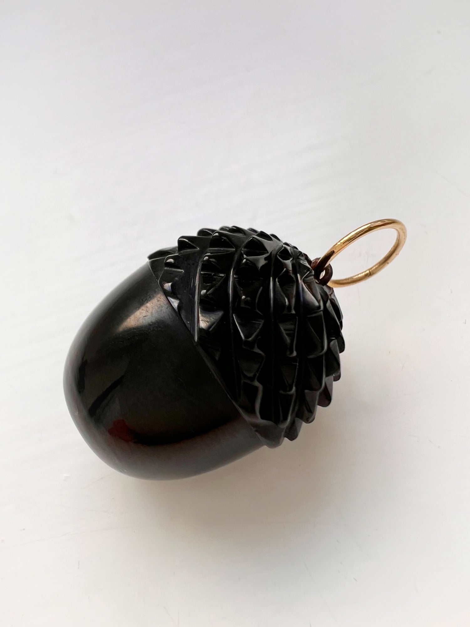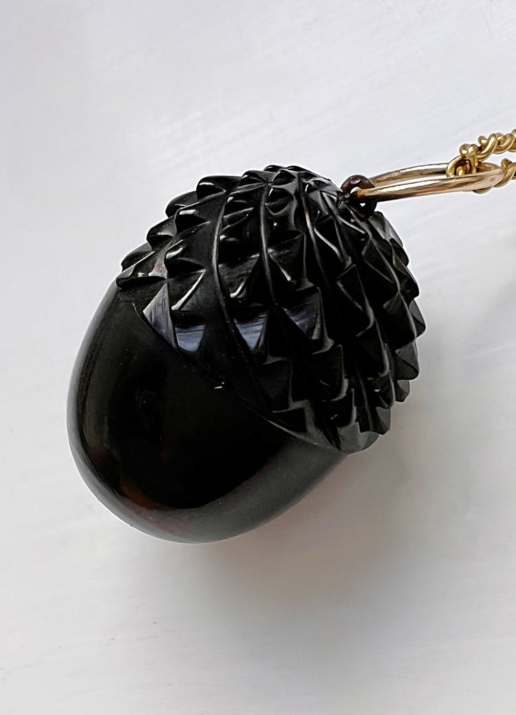 Circa 1880; The plump acorn has triangular carvings at the top to represent the cup and smooth jet for the nut.