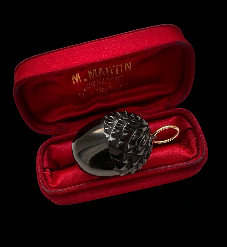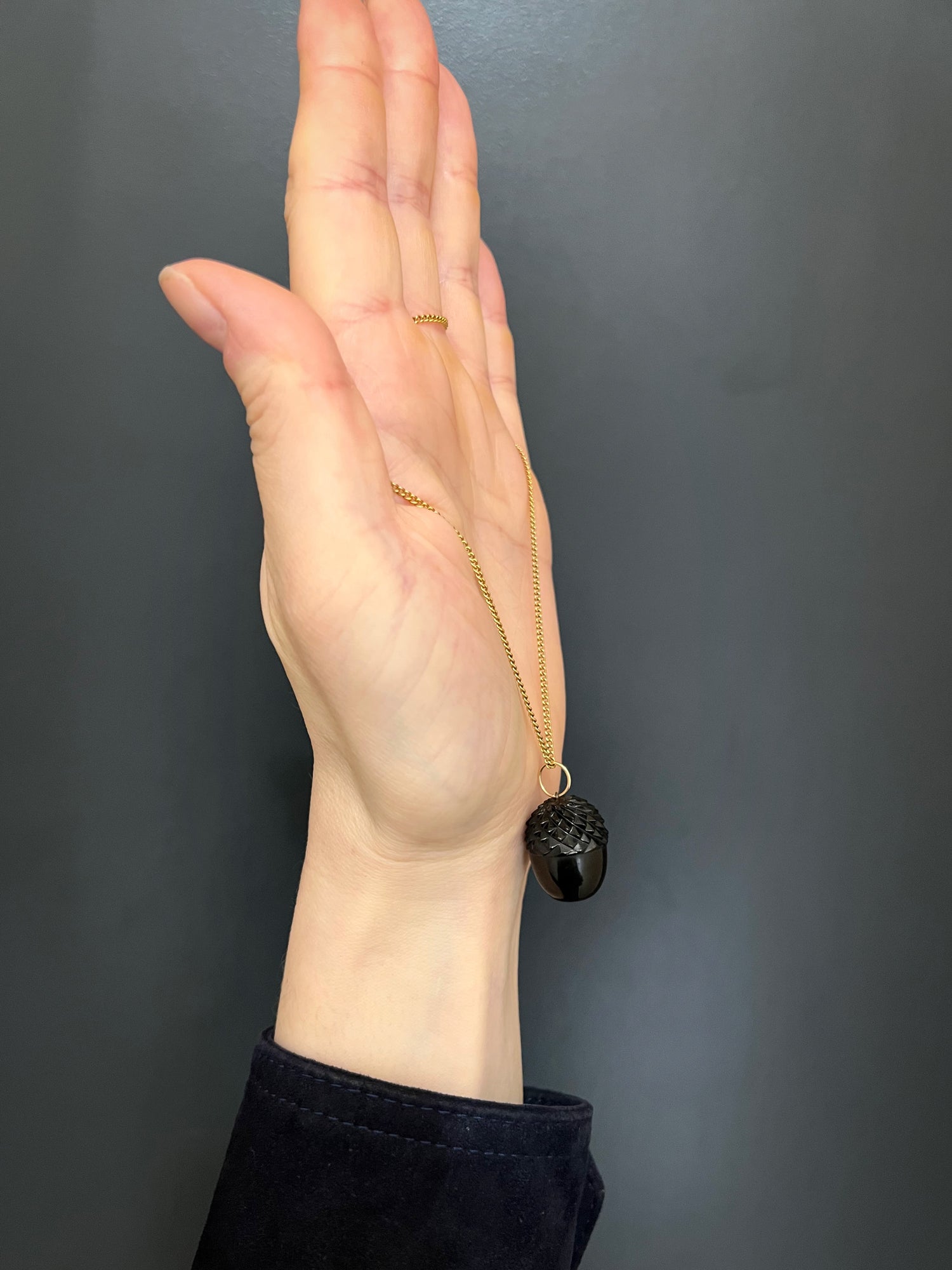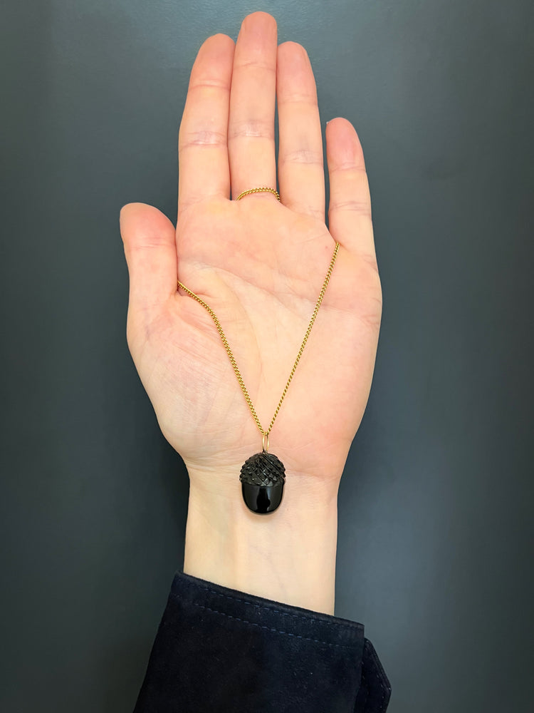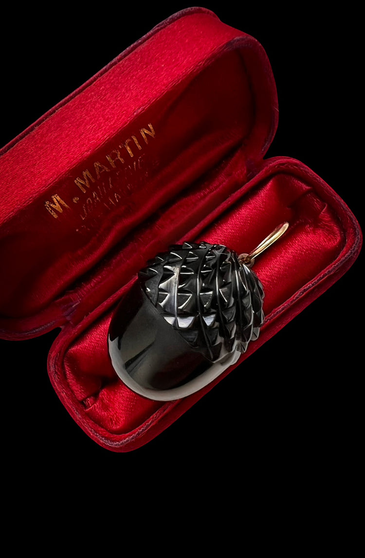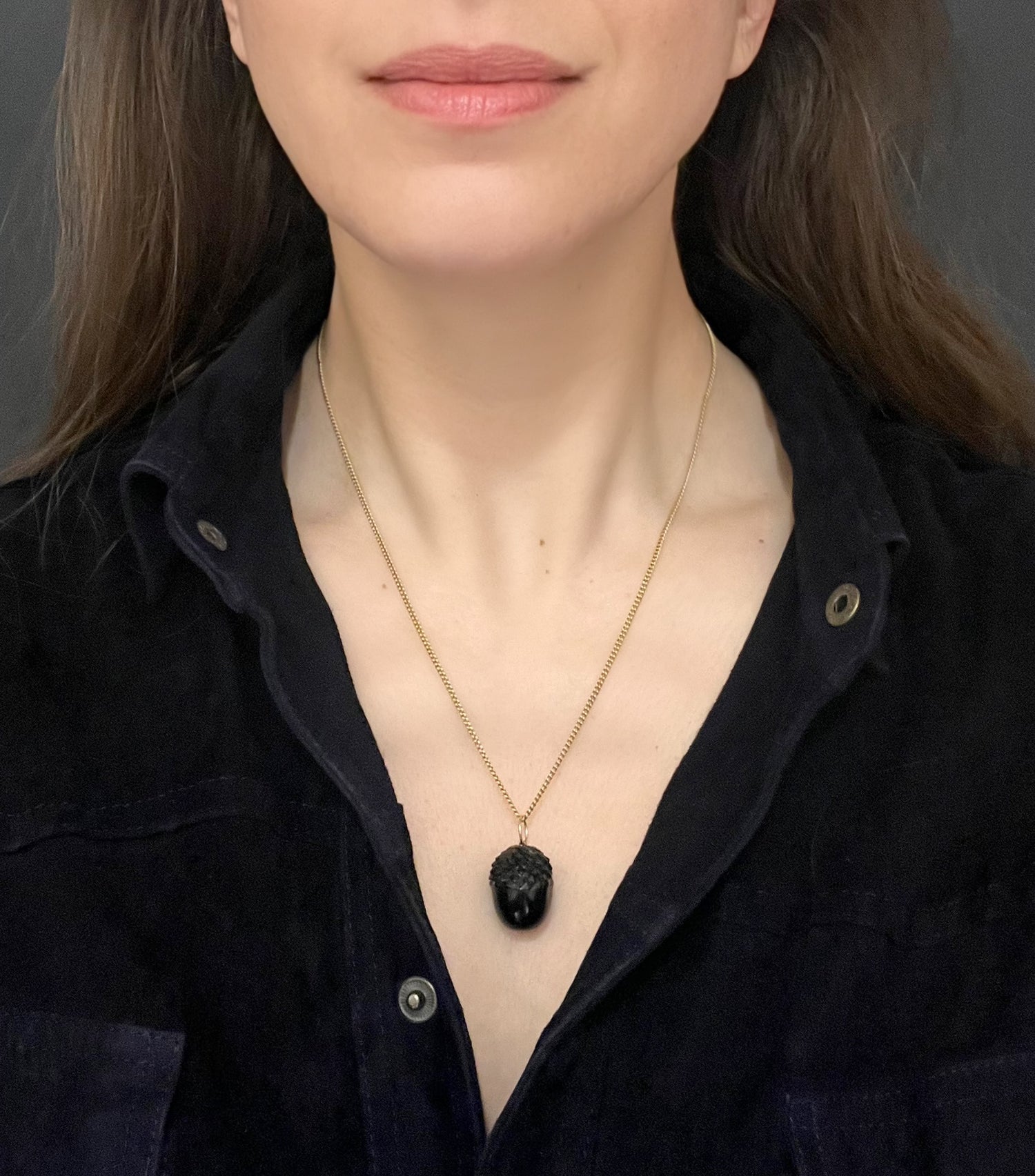 Circa 1880; The plump acorn has triangular carvings at the top to represent the cup and smooth jet for the nut.