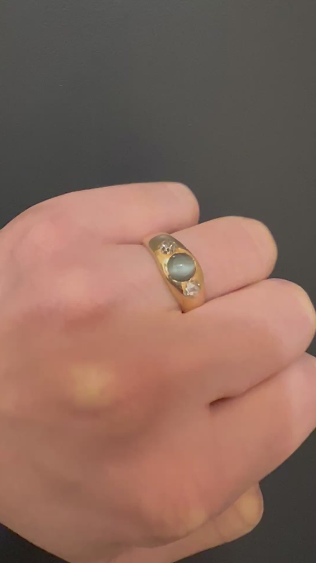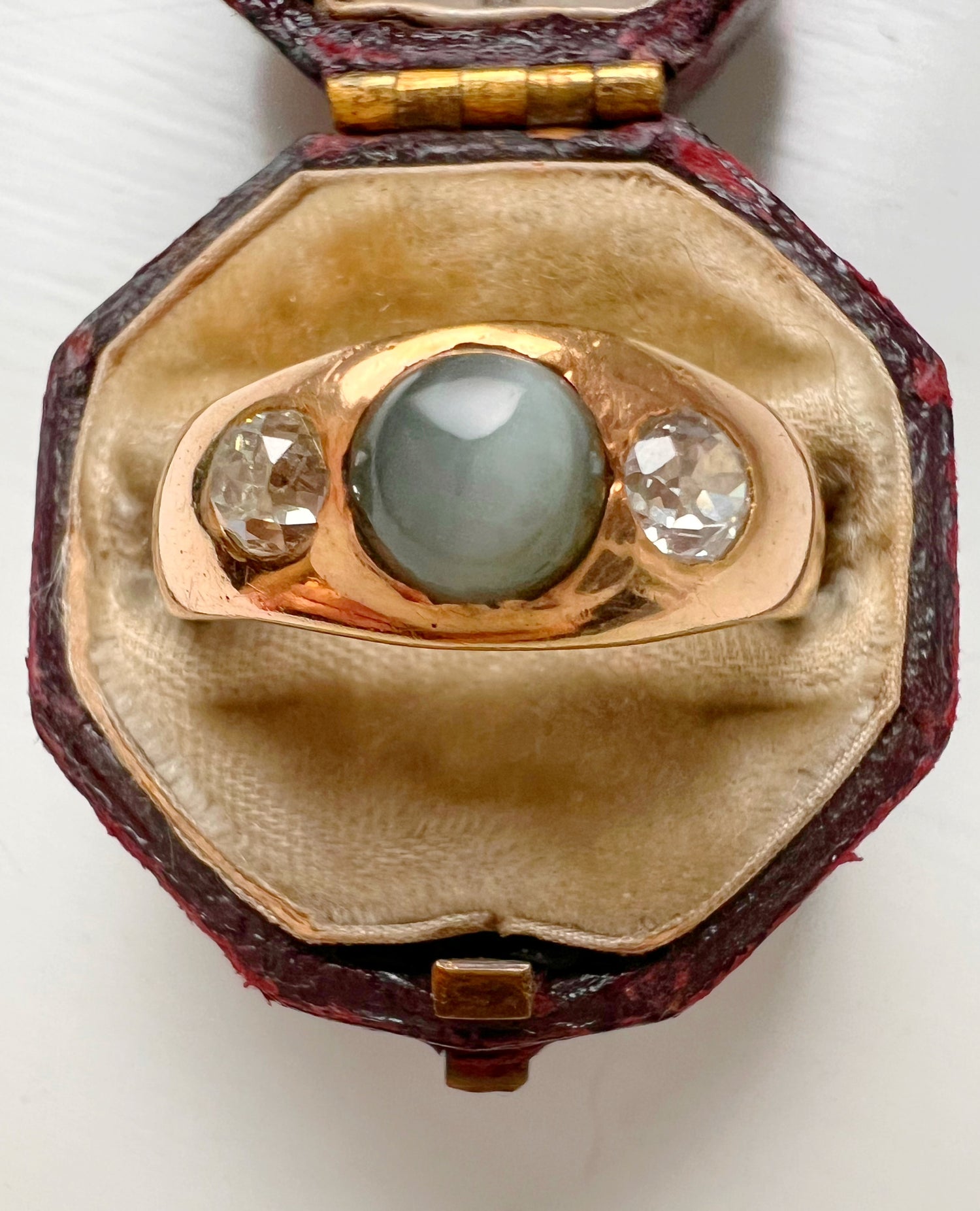 A super chunky 18ct gold gypsy ring set with a large cabochon Chrysoberyl Cats eye, which is flanked by two old cut diamonds.