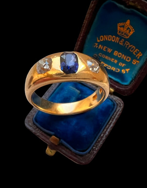 The heavy 18ct gold band is set with a central large cushion cut natural Sapphire, flanked by two chunky old cut diamonds.