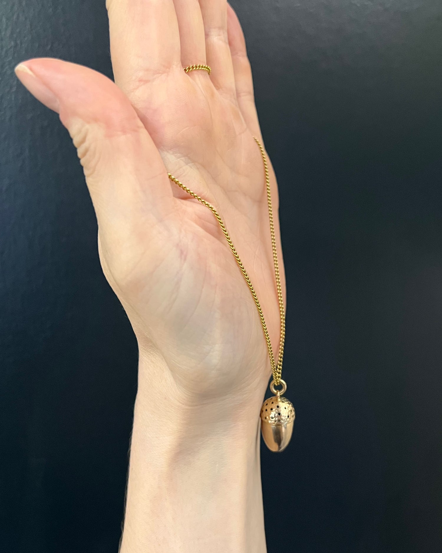 The acorn cup is perforated with tiny holes, and hinges open to reveal a cavity where you could place a keepsake.