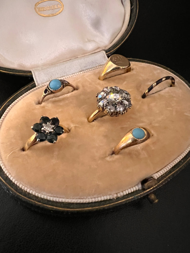 We recommend removing pieces of jewellery before washing hands or showering, as water can damage the antique settings.