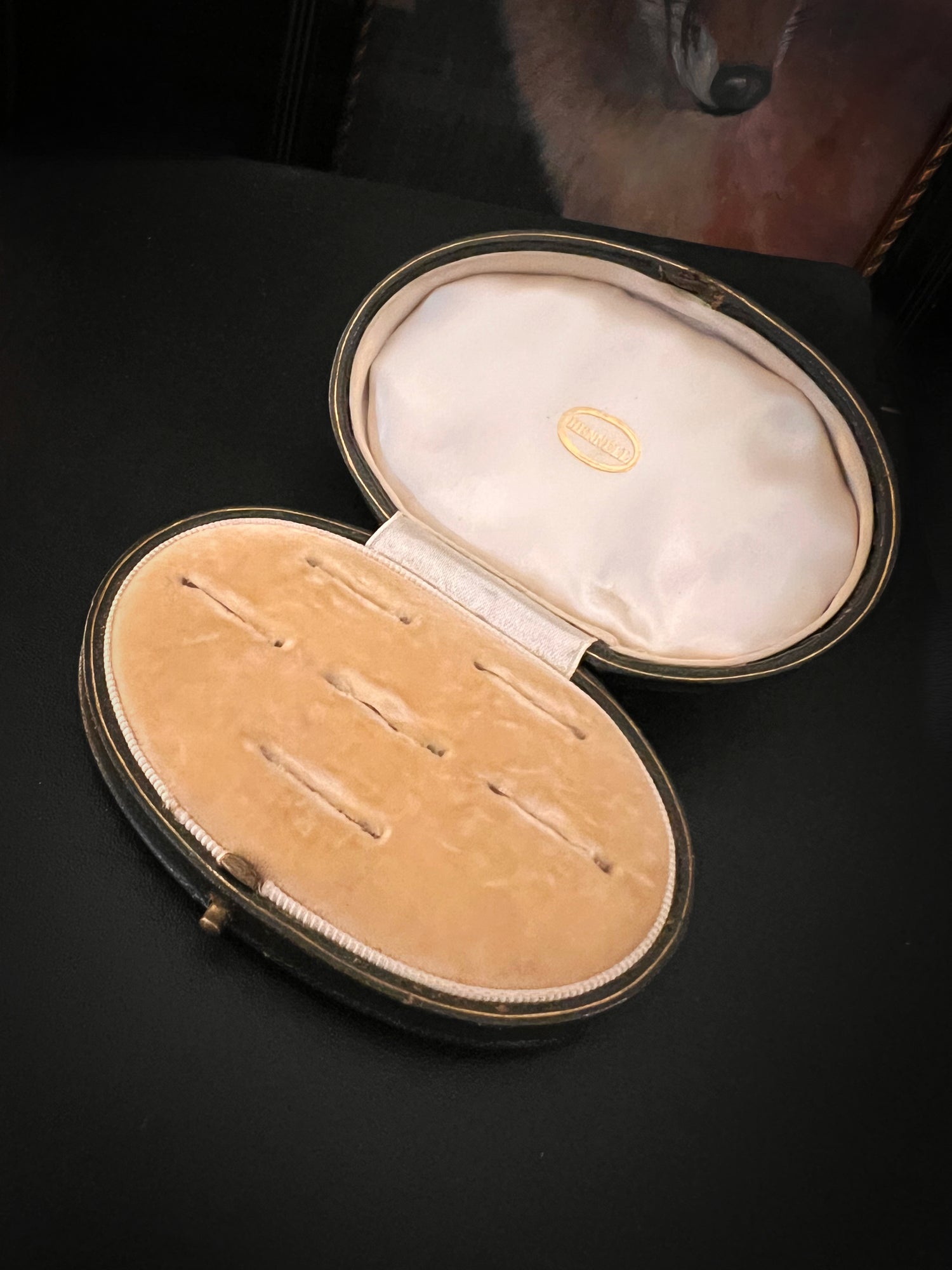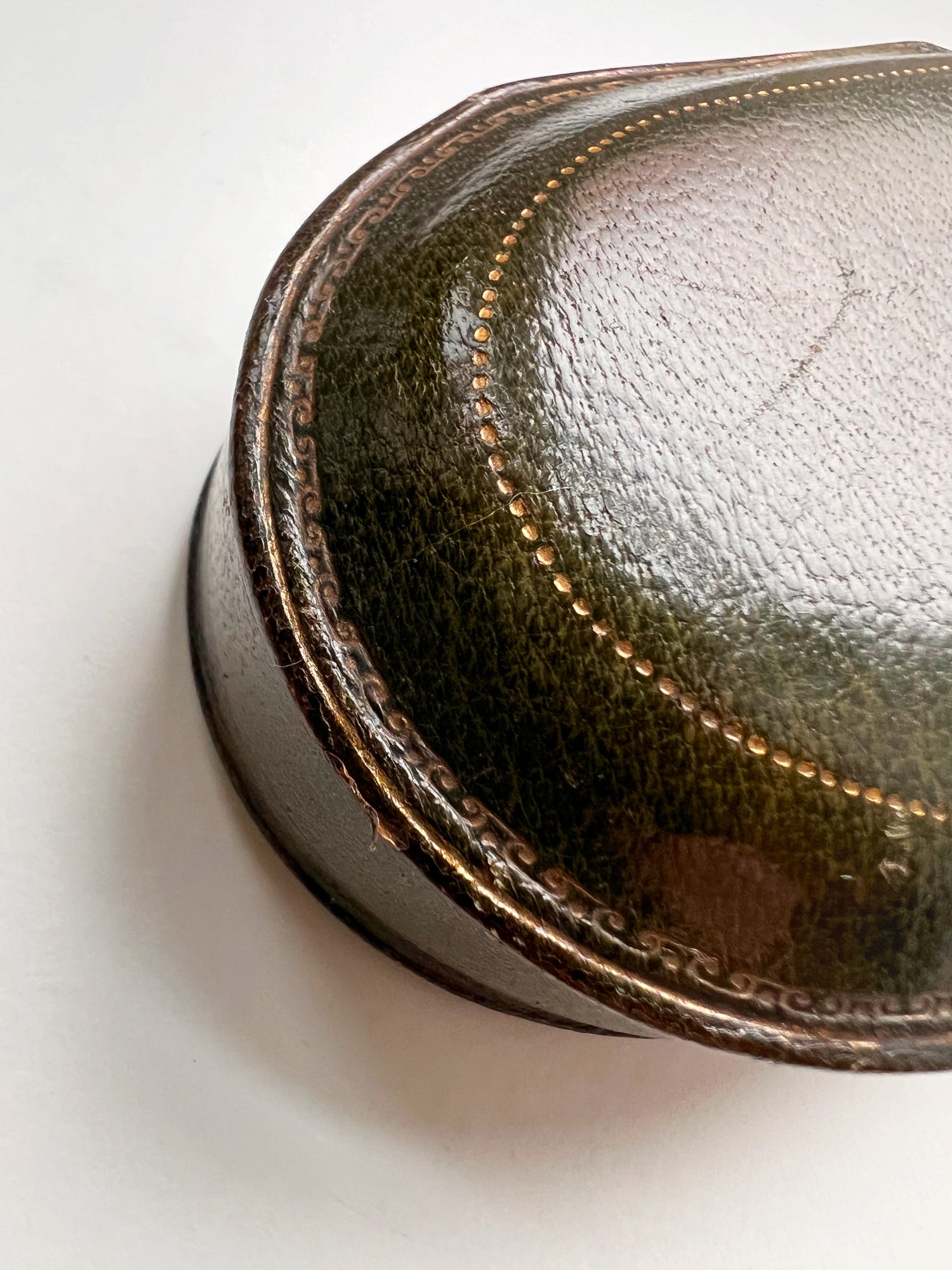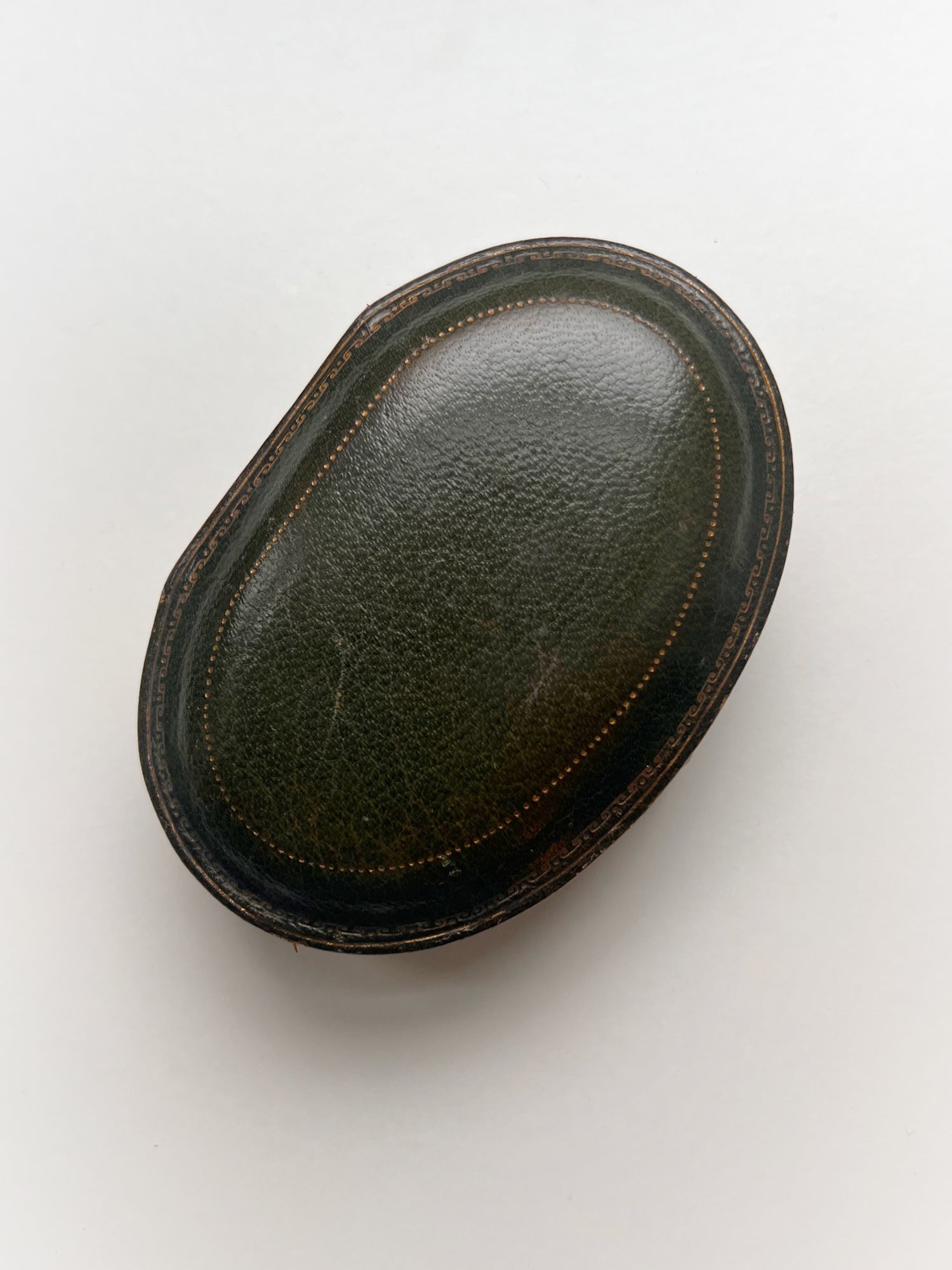 The oval moulded leather box is from the renowned silversmith and jeweller HENNELL.