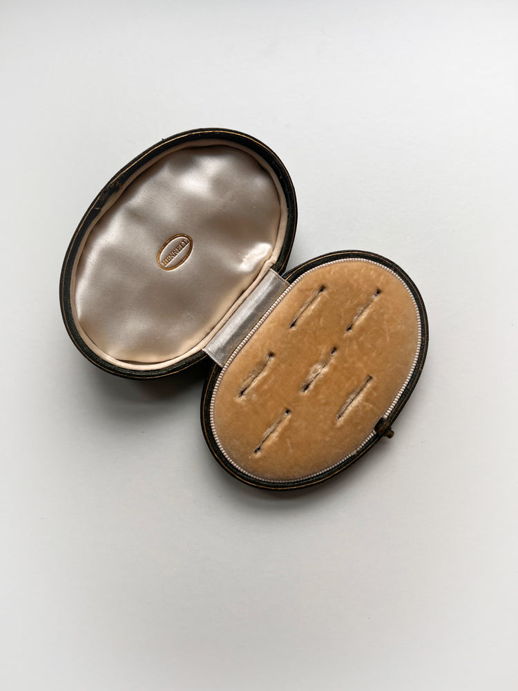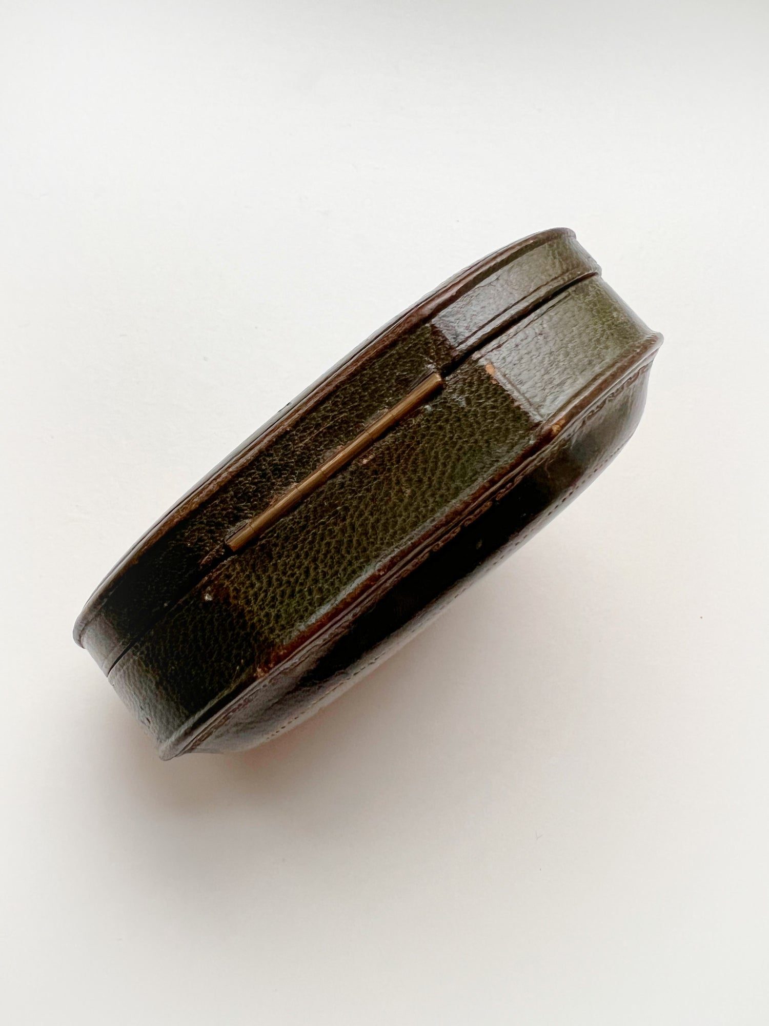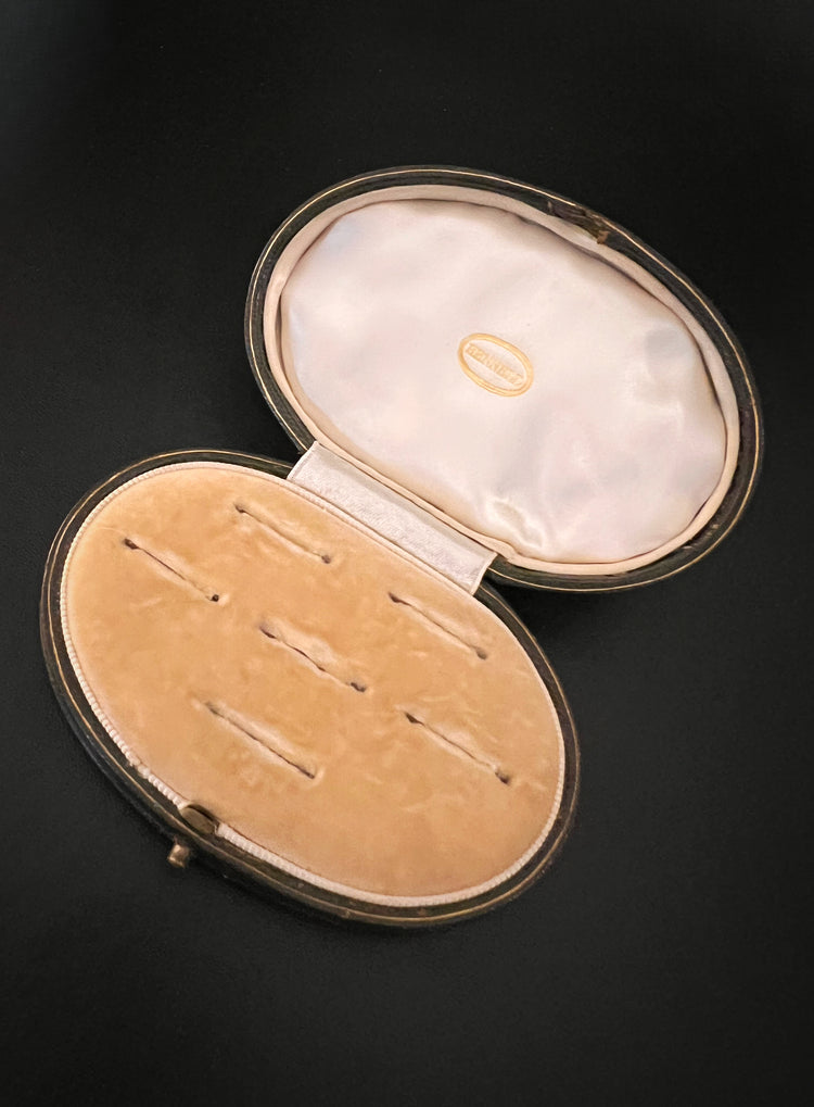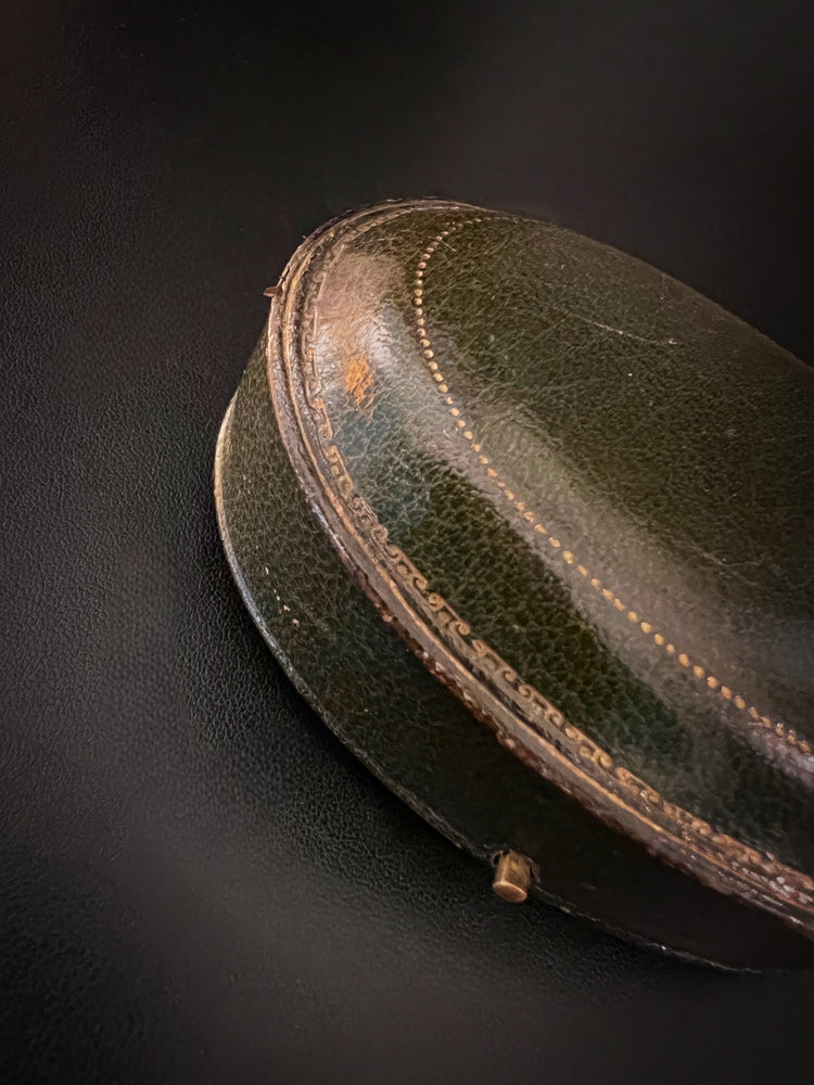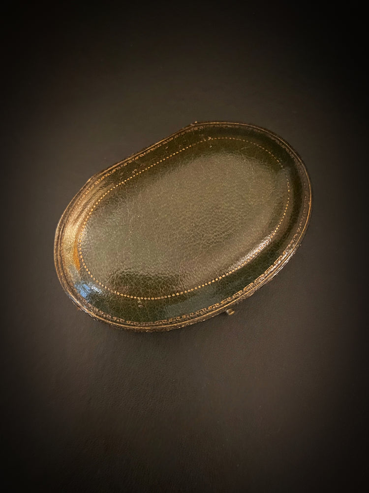 The oval moulded leather box is from the renowned silversmith and jeweller HENNELL.