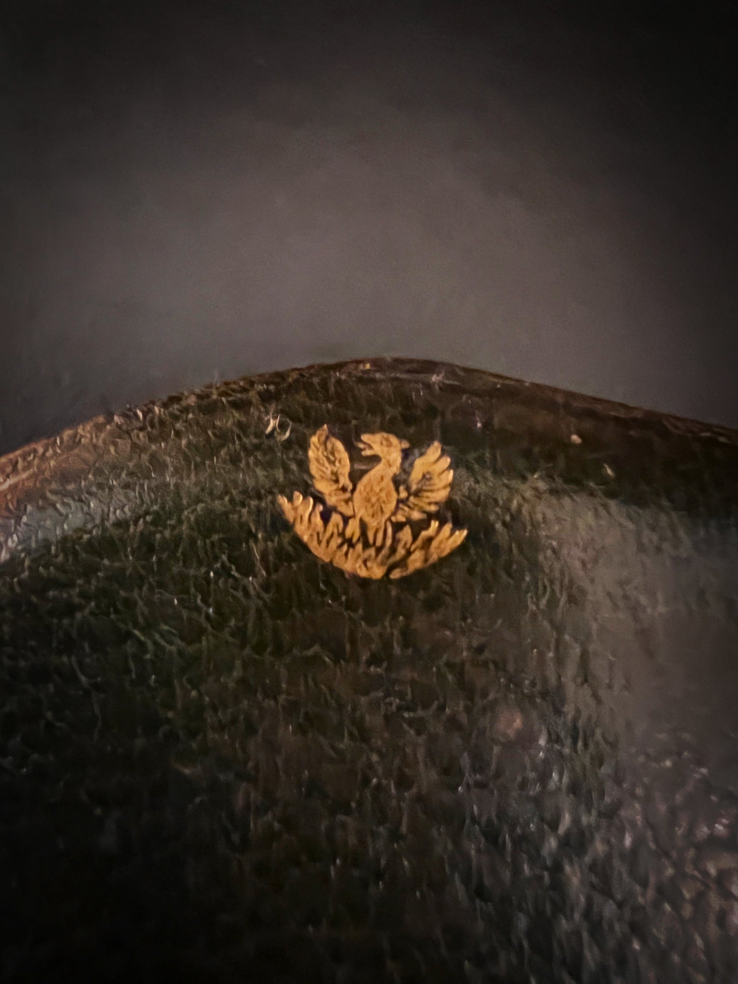The external of the box is in excellent condition with gold tooling around the lid. The base of the box bears a tiny gold winged Griffin.