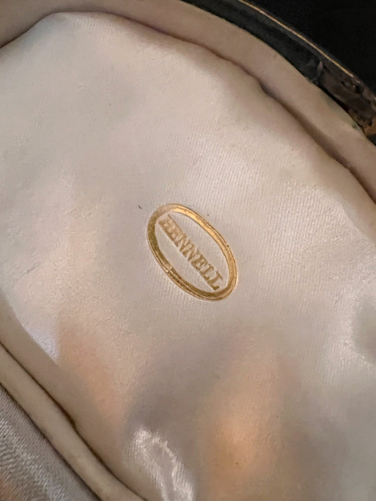 Inside the ring pad is made of cream velvet and a silk lid with a gold Hennell logo.