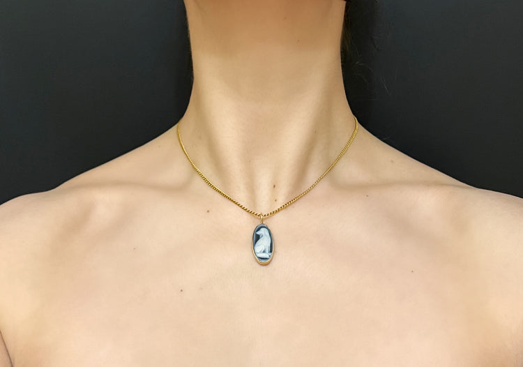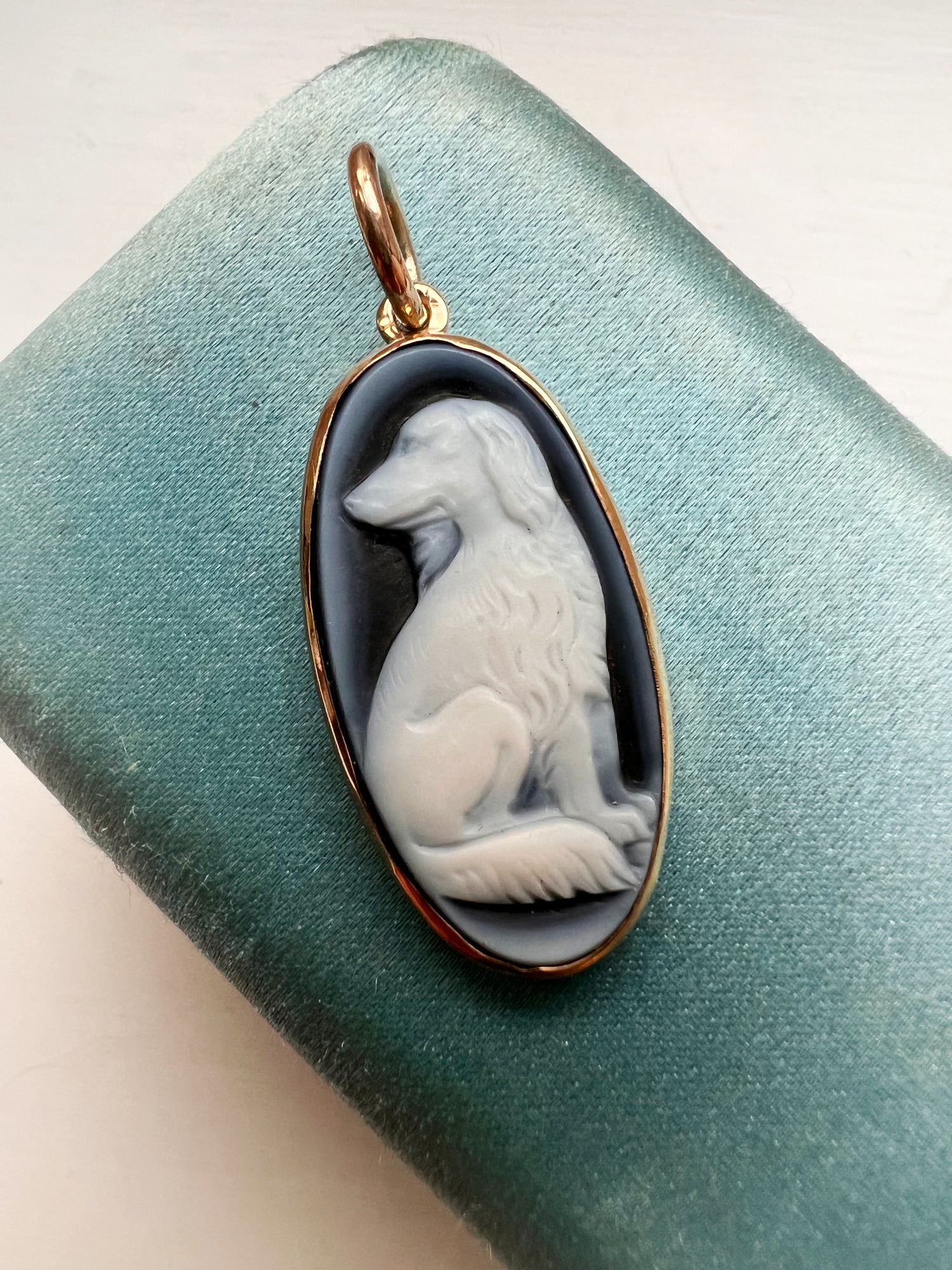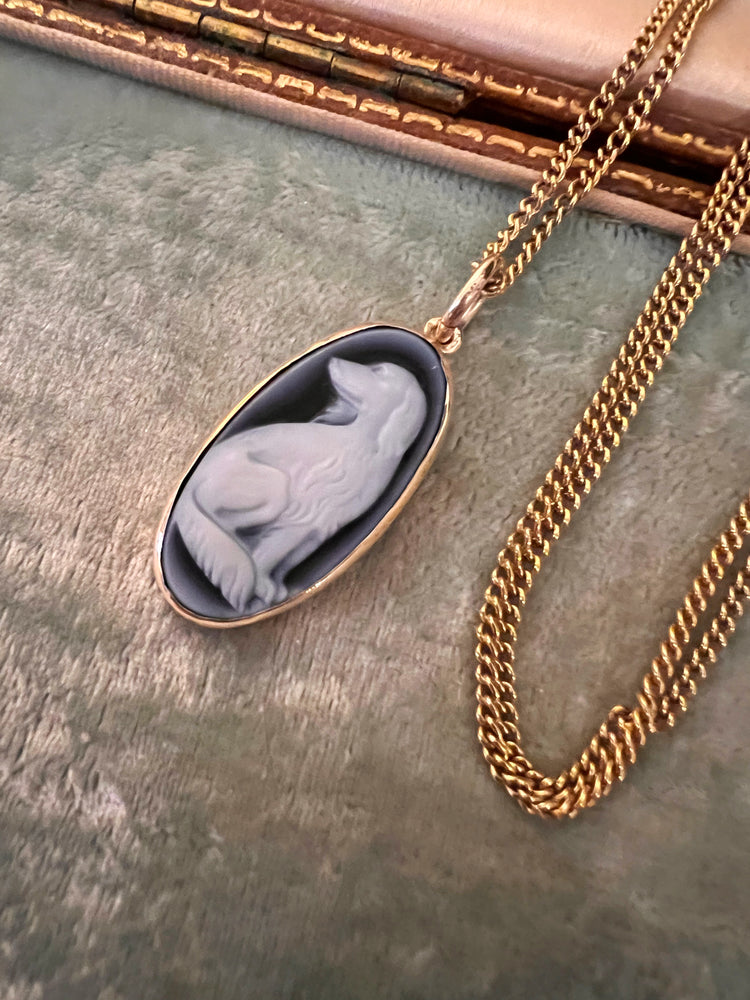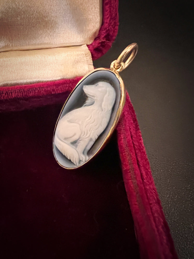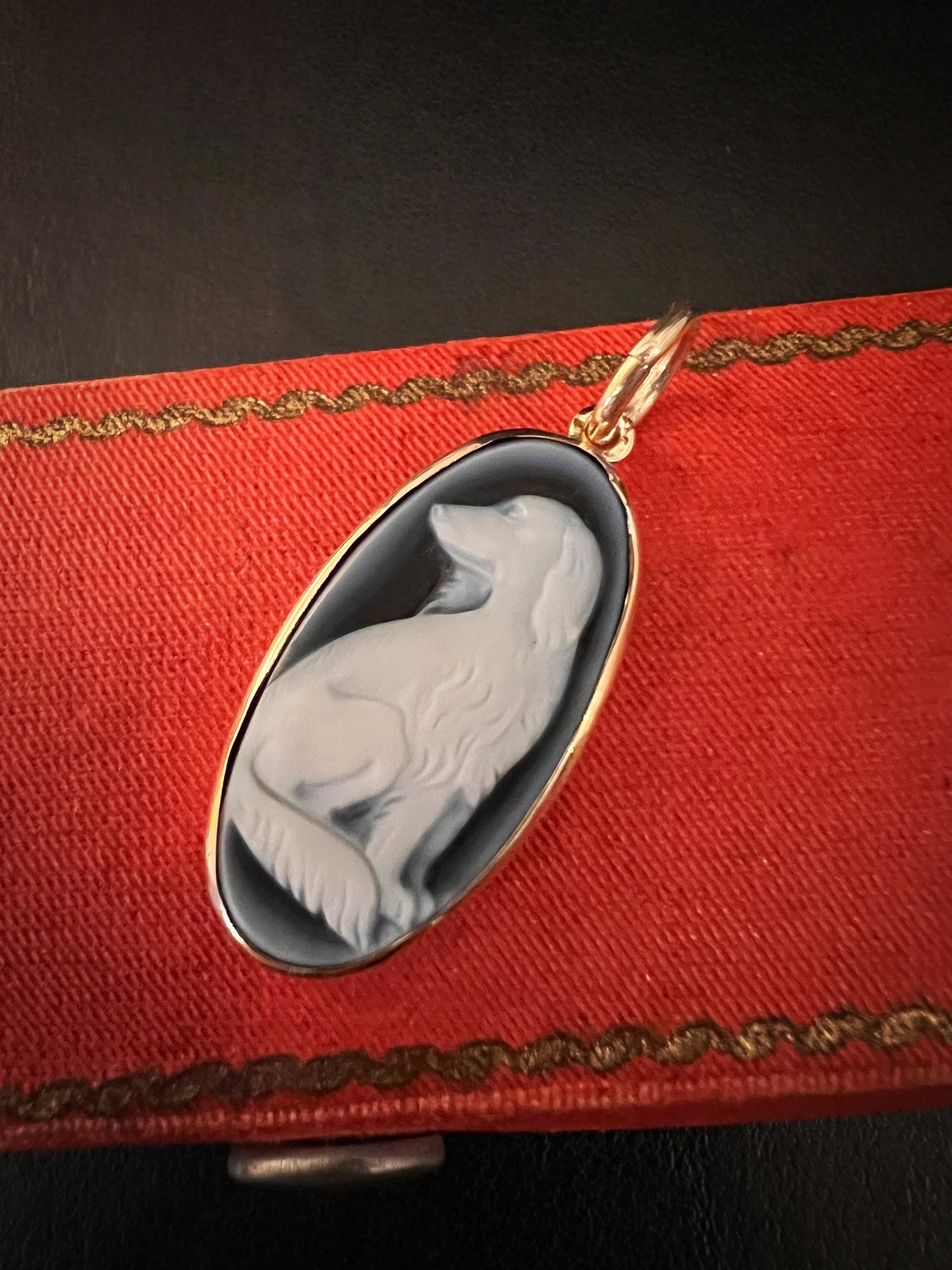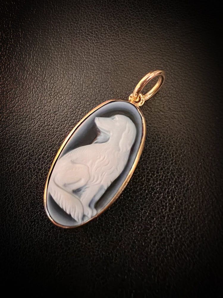 A gorgeous cameo in Onyx depicting a sitting dog! The work is lovely and fine, with the layers revealing blue hues.
