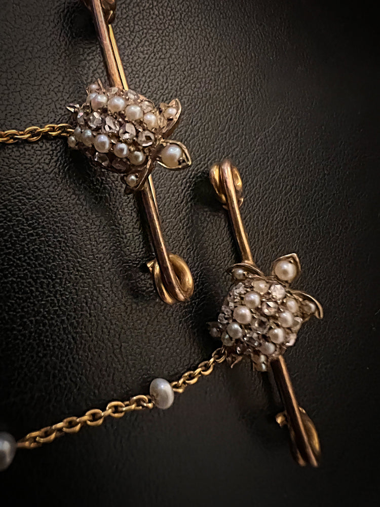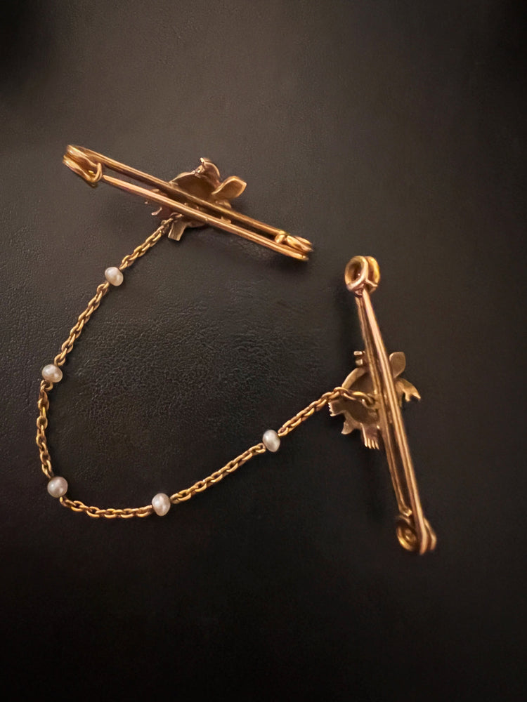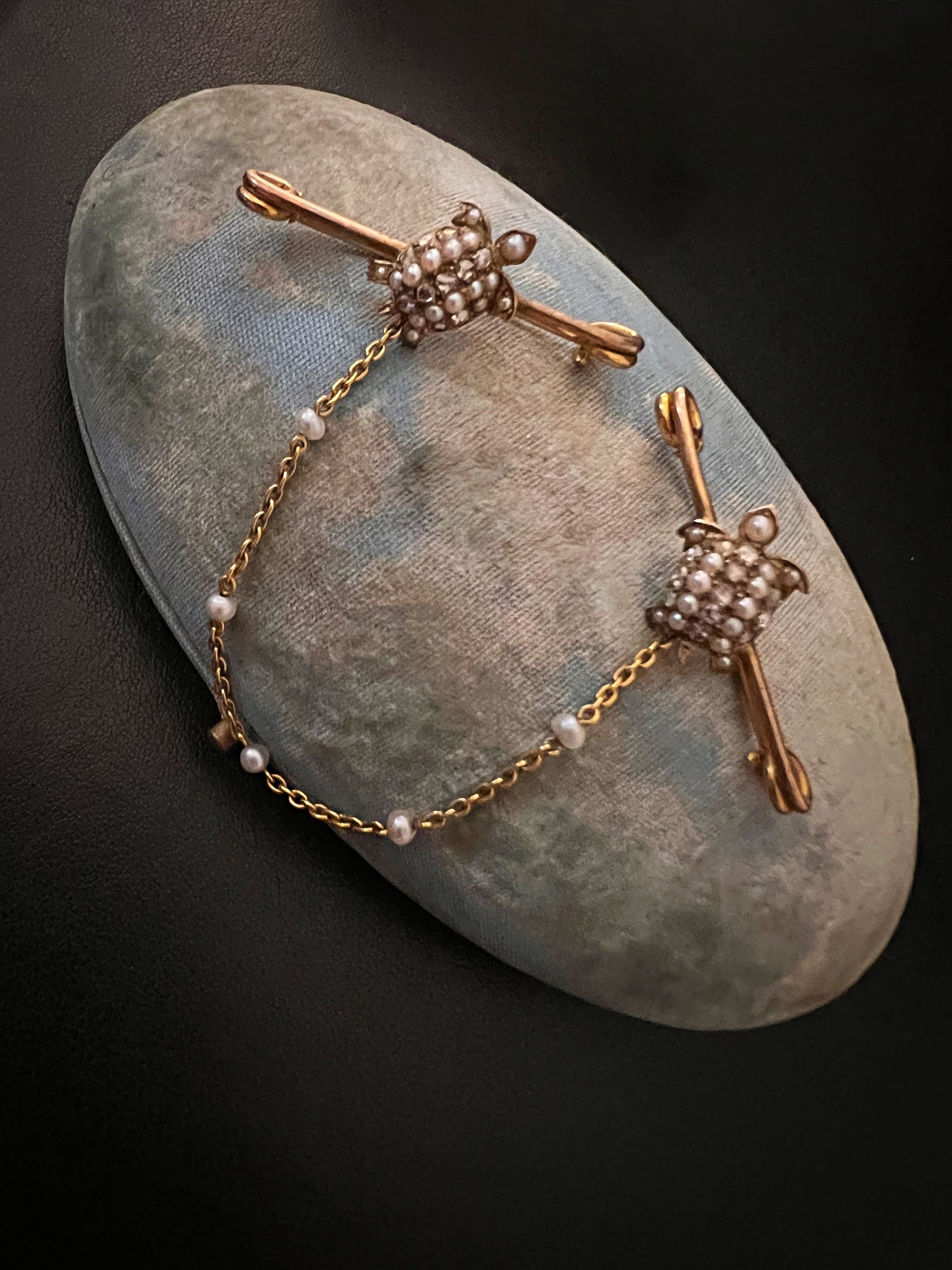 The high carat gold bar pins are joined by an original fine belcher chain with intermittent pearls.