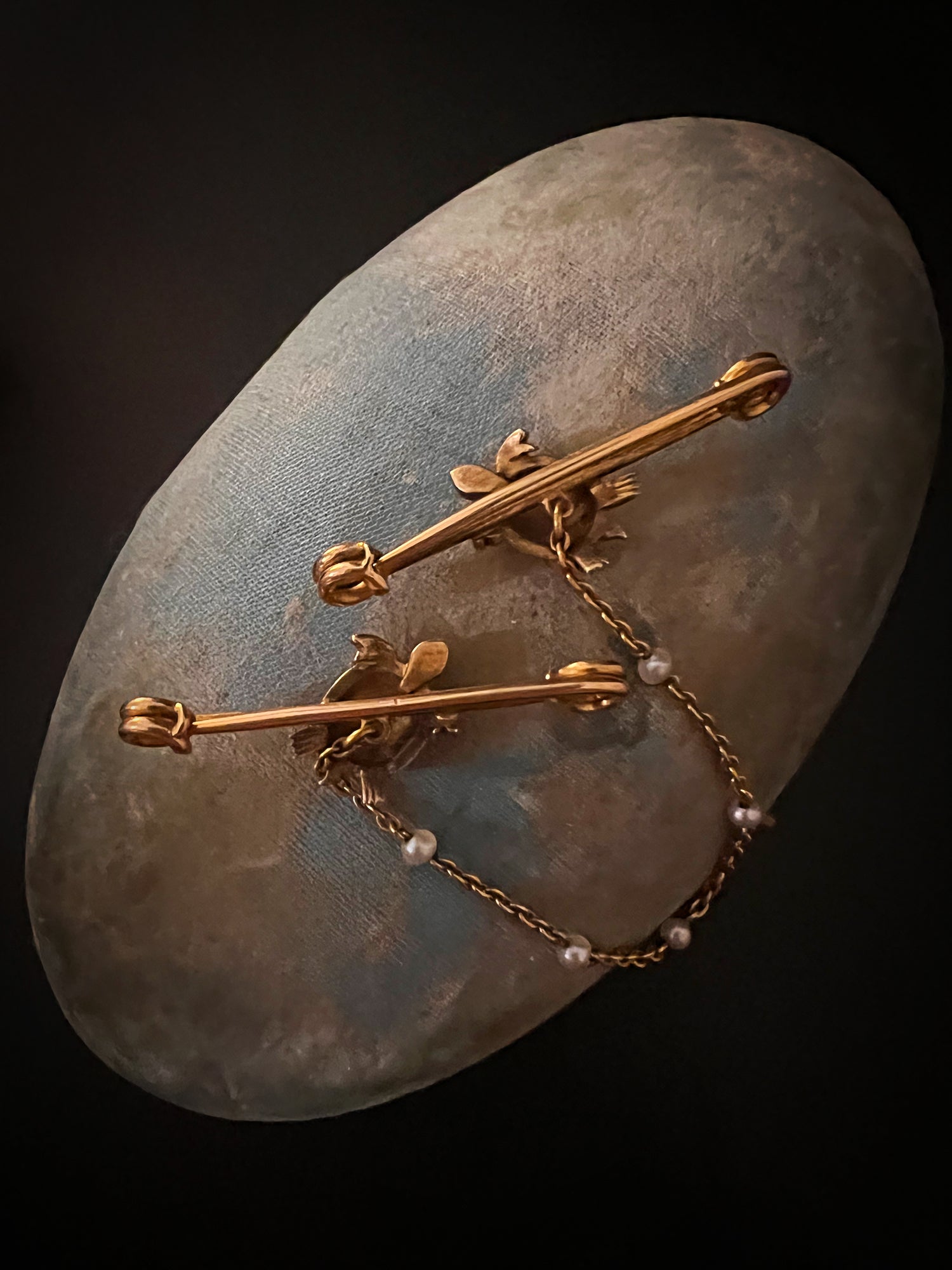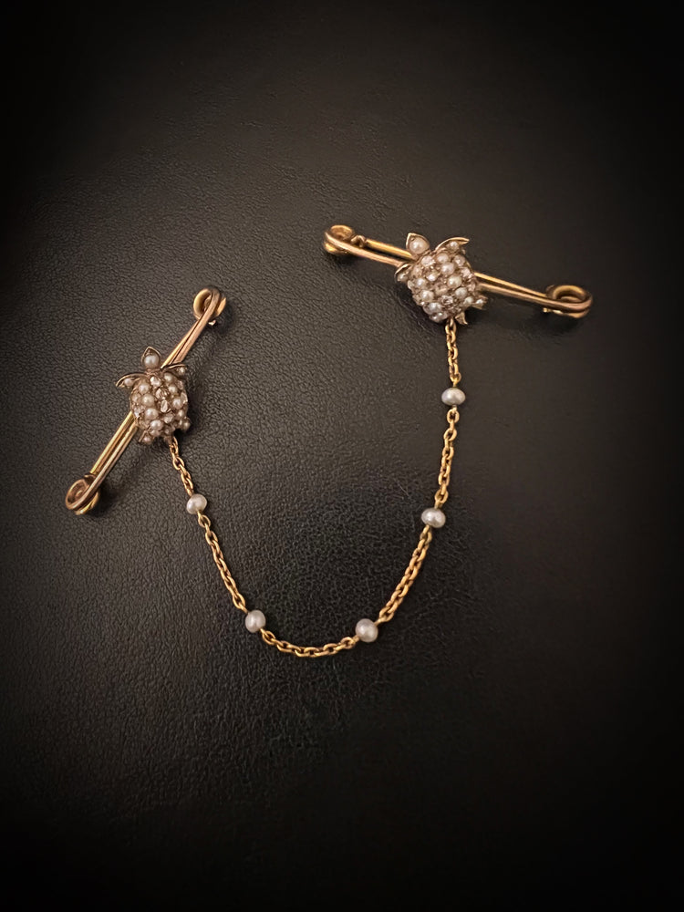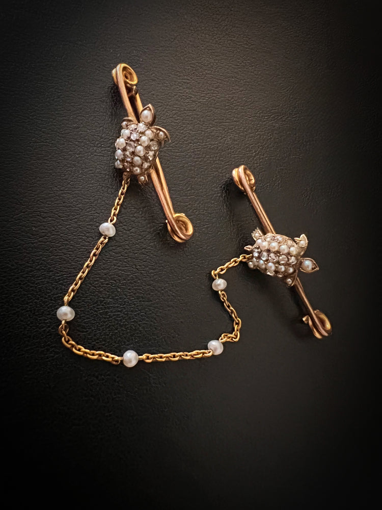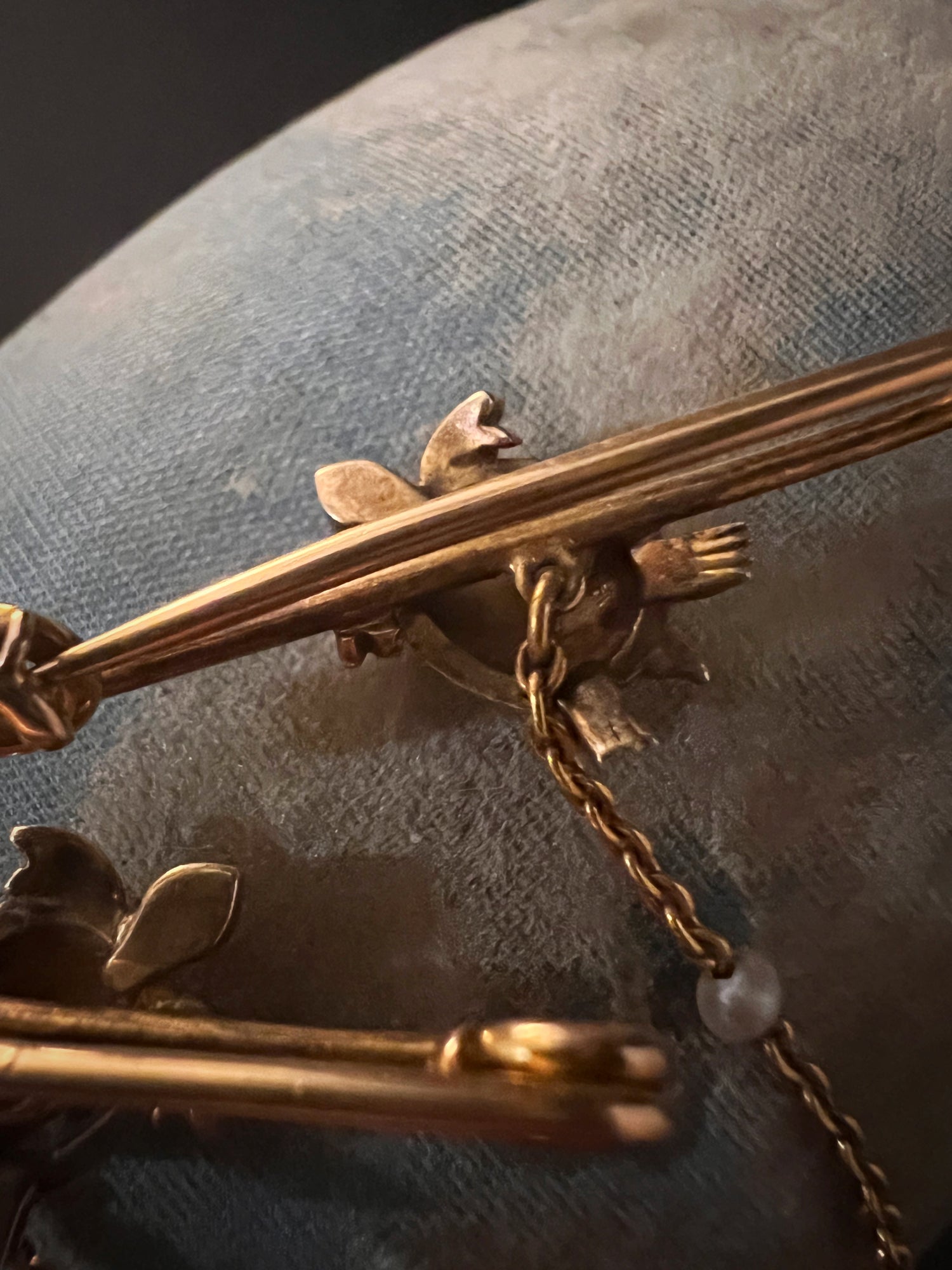 The high carat gold bar pins are joined by an original fine belcher chain with intermittent pearls.