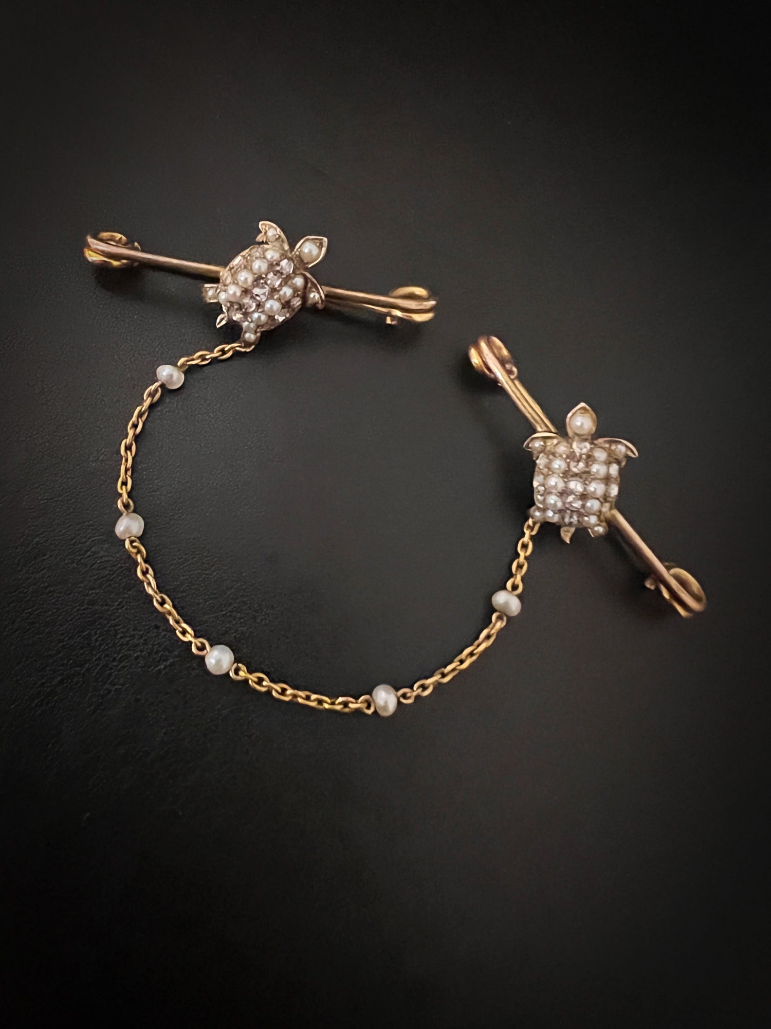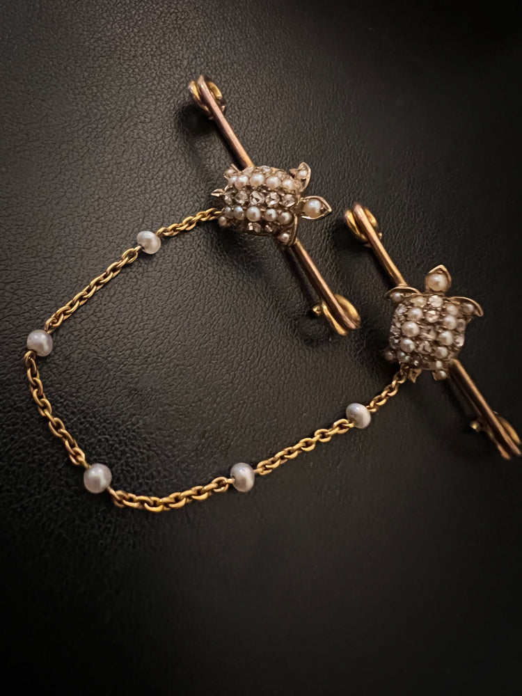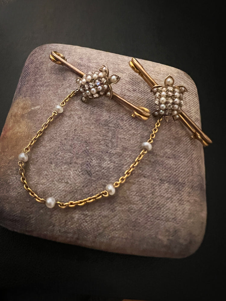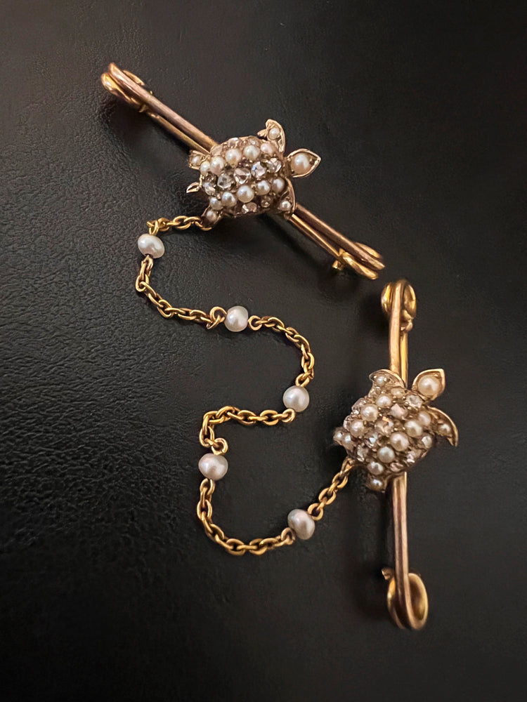 DOUBLE DIAMOND & PEARL TORTOISE BAR BROOCH SET