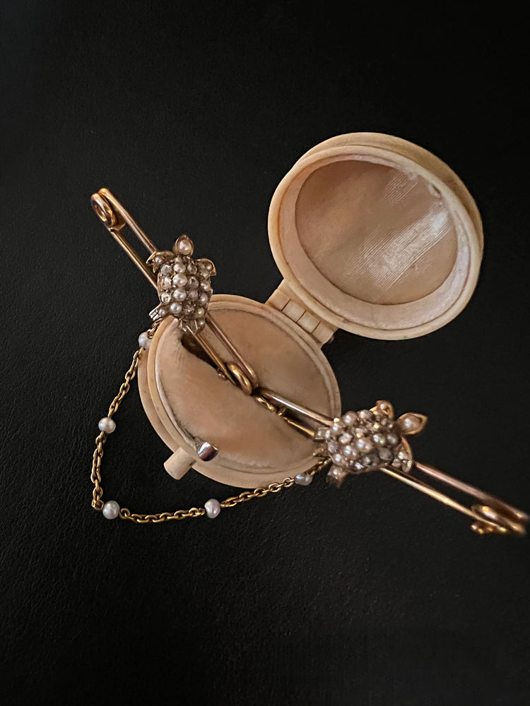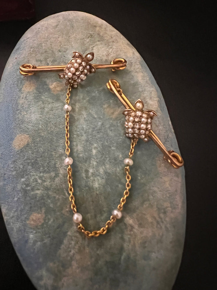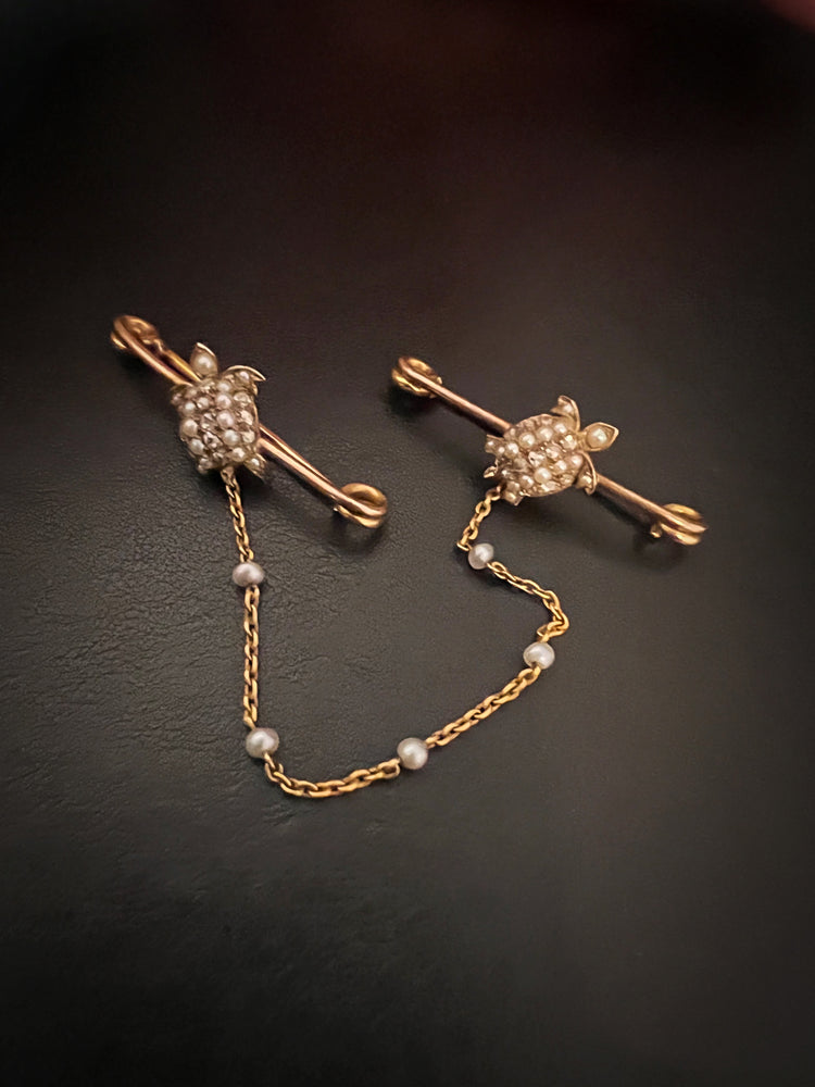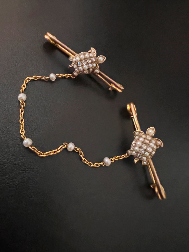 DOUBLE DIAMOND & PEARL TORTOISE BAR BROOCH SET