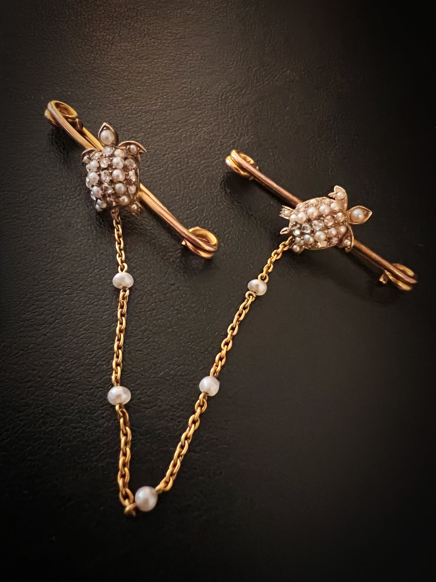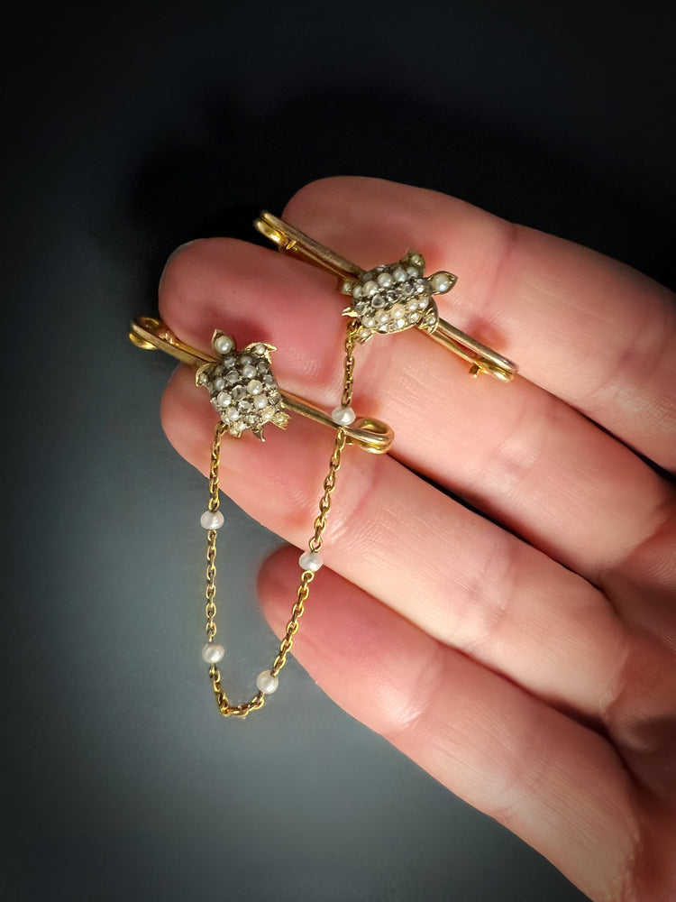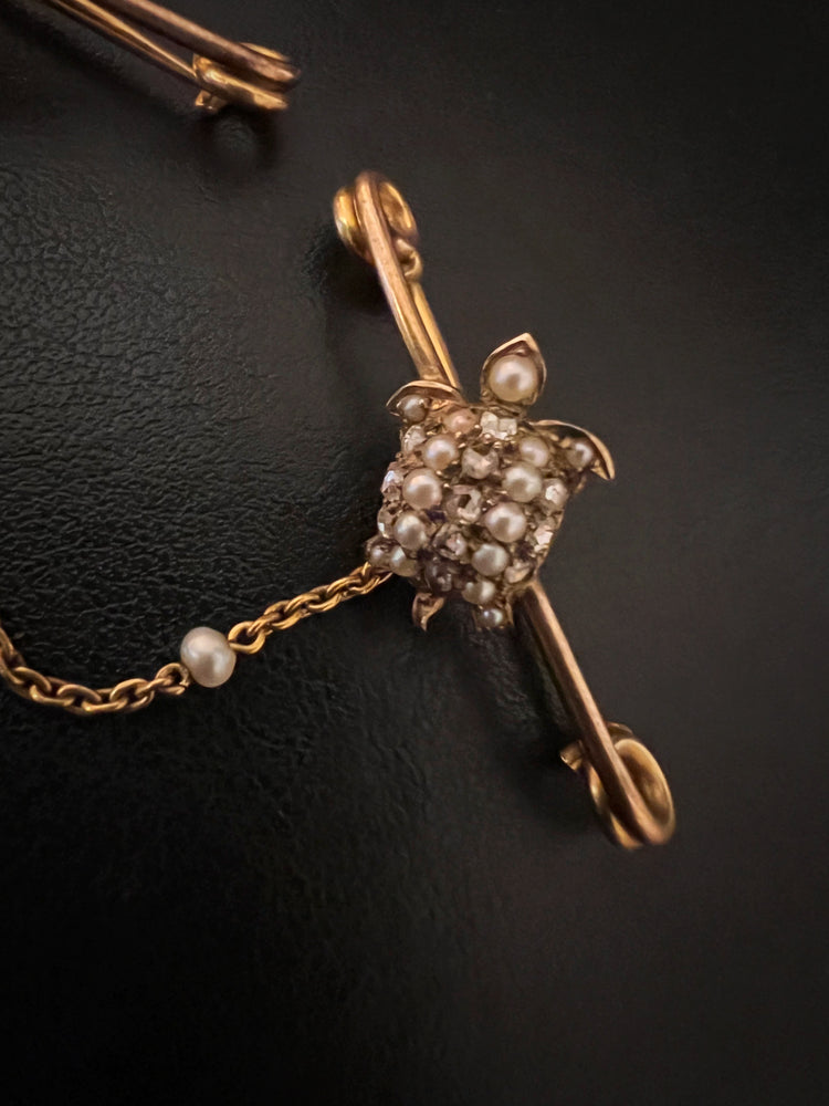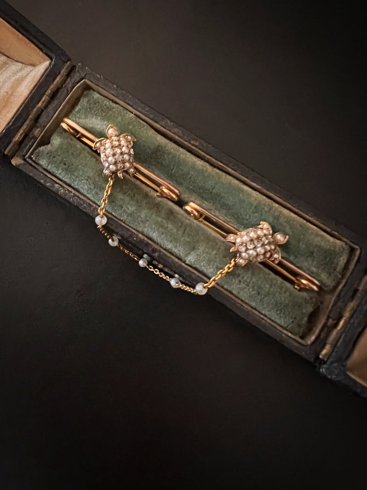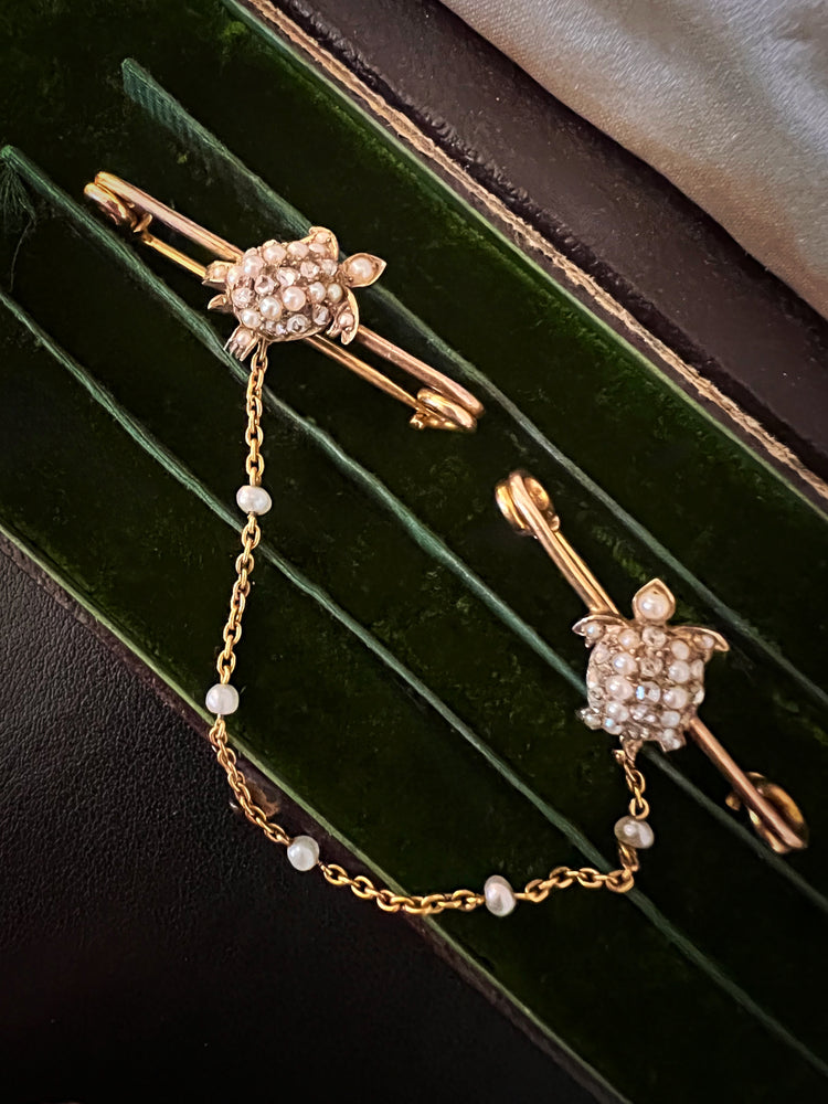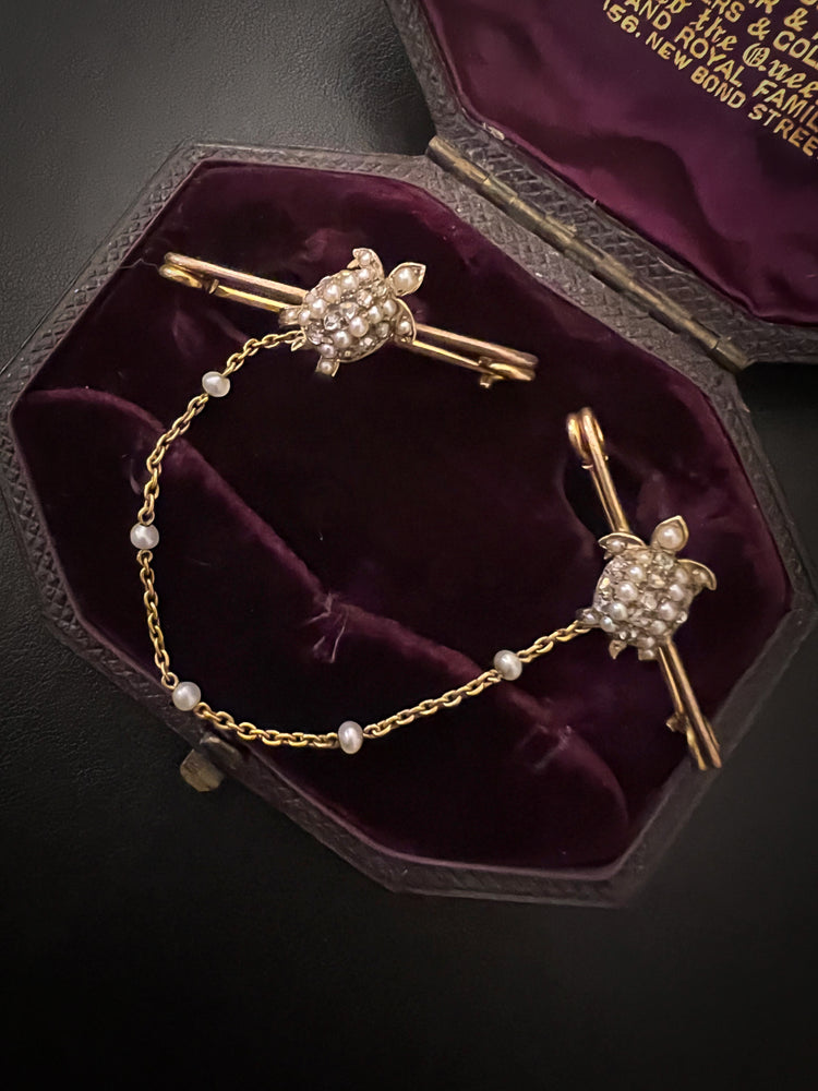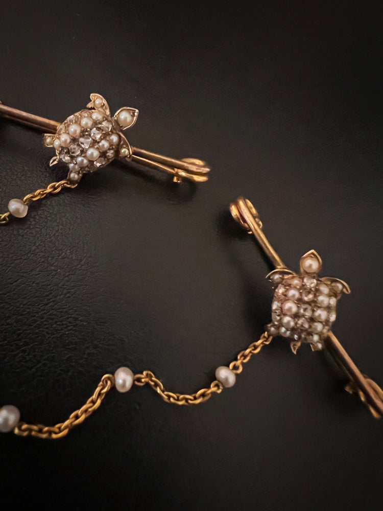 A delightful Victorian double bar brooch set with two diamond and pearl set tortoises!