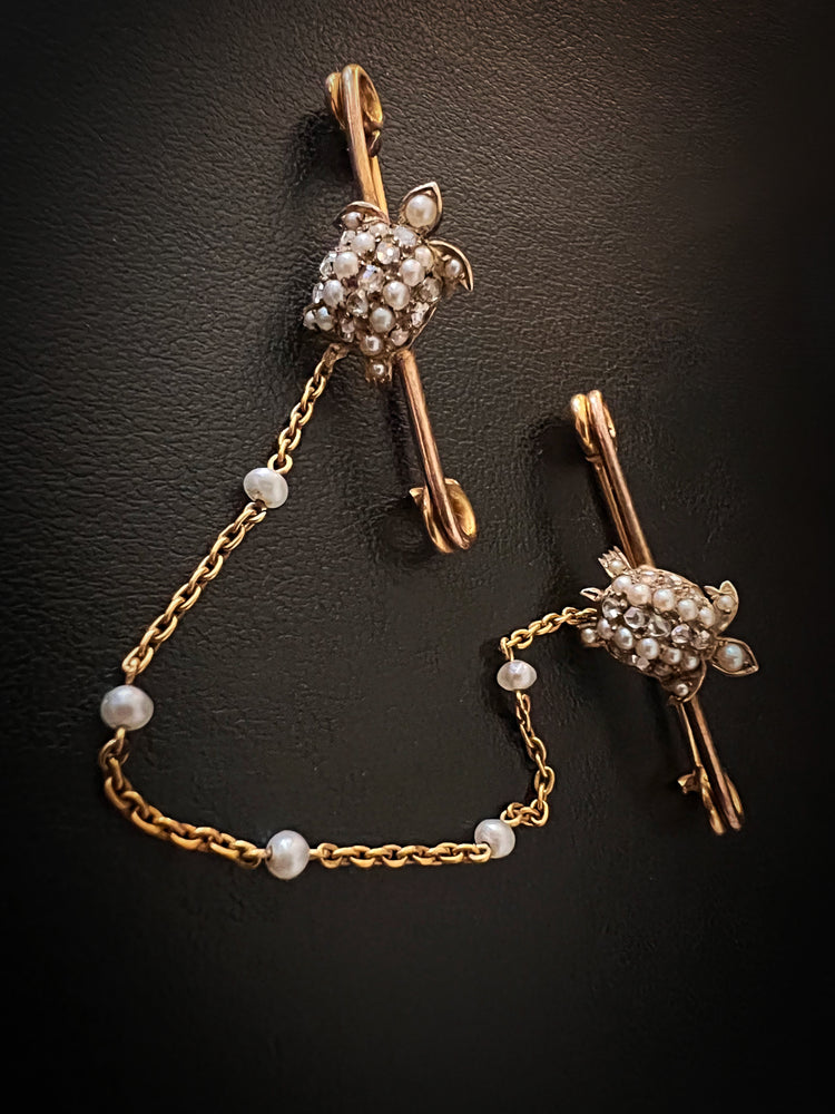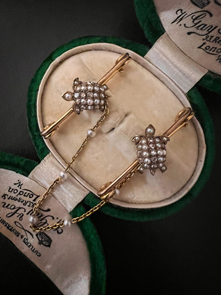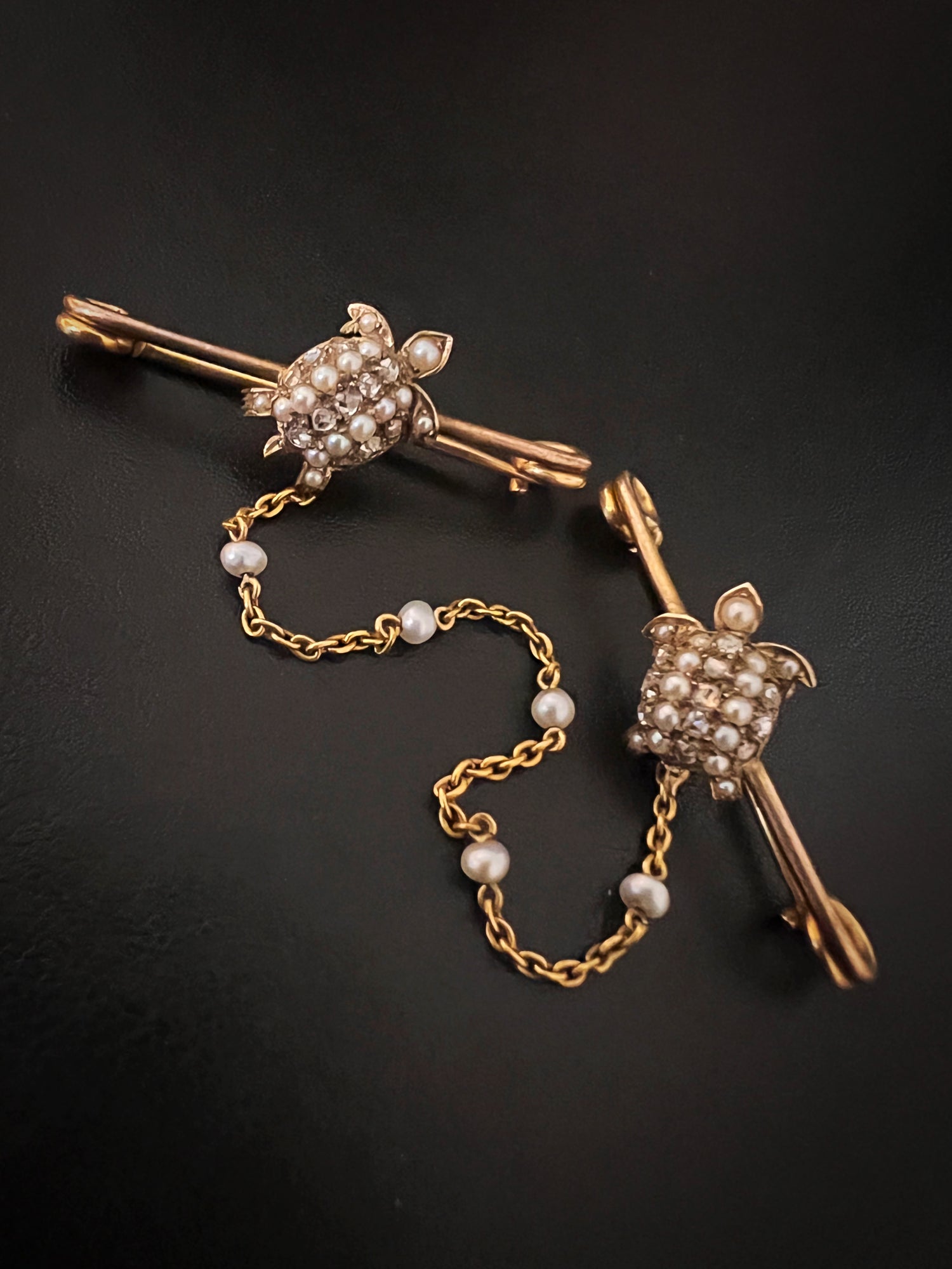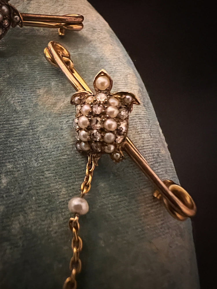 The tortoises are so charming; made of high carat gold, they are set with beautiful rose cut diamonds and pearls.