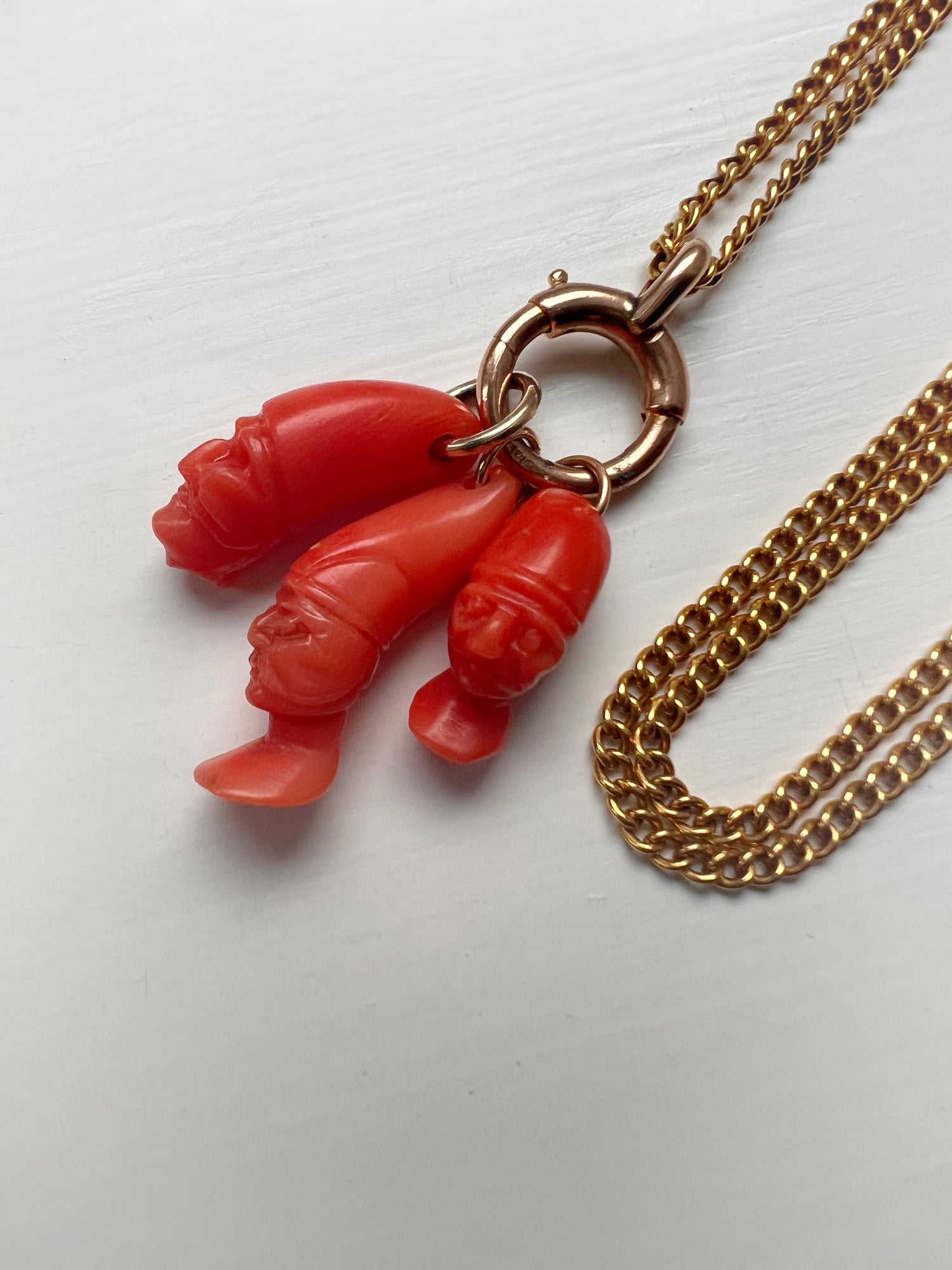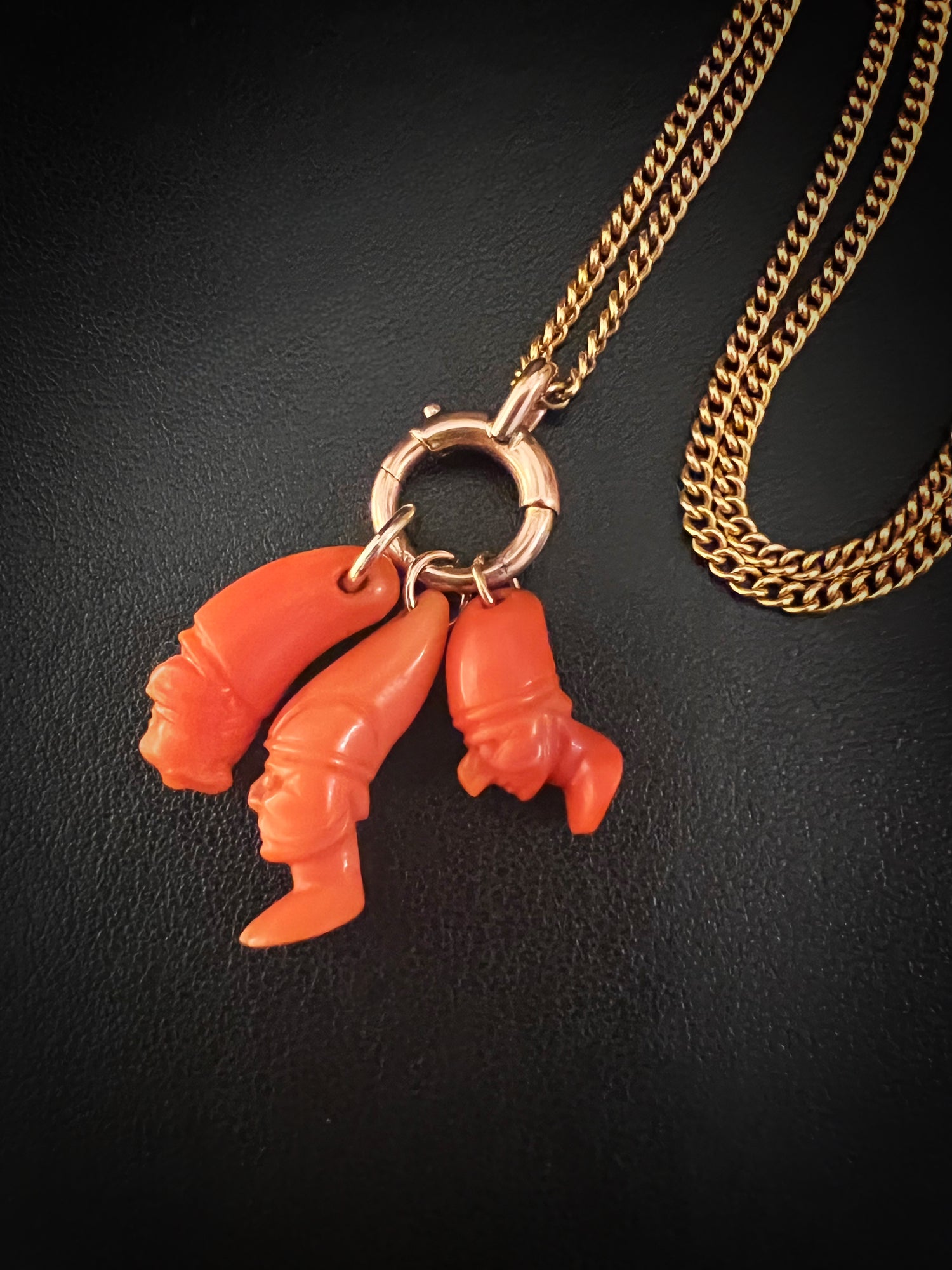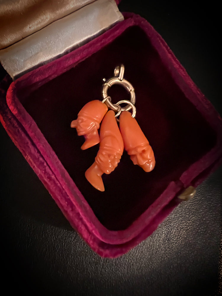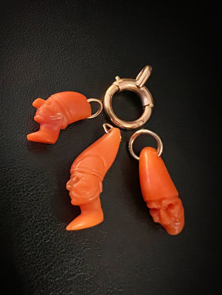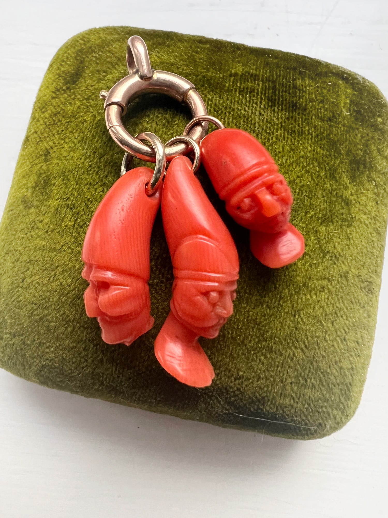 Three early 19th century Italian Punchinello pendants carved from coral, with a 9ct gold solid bolt ring bail.