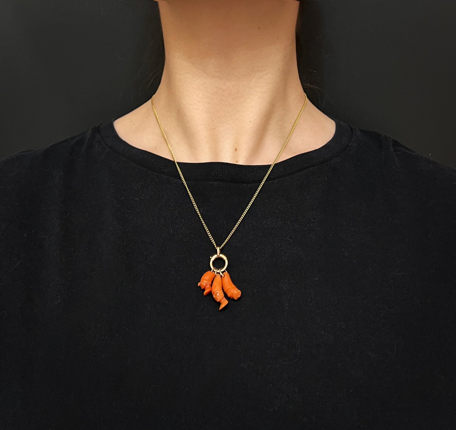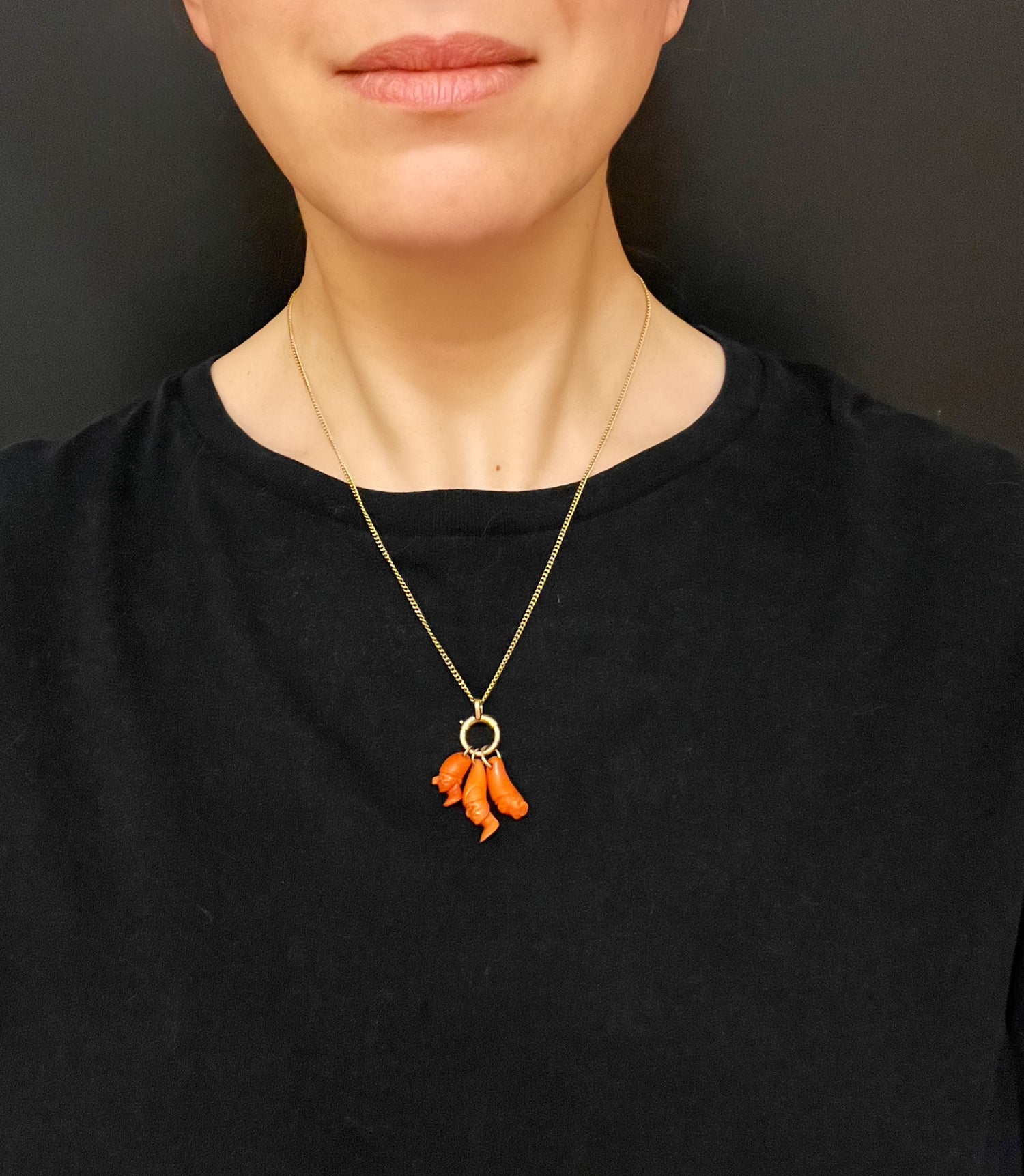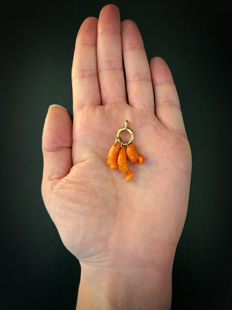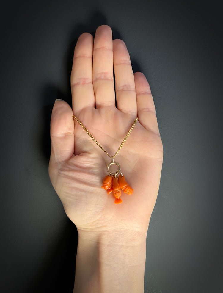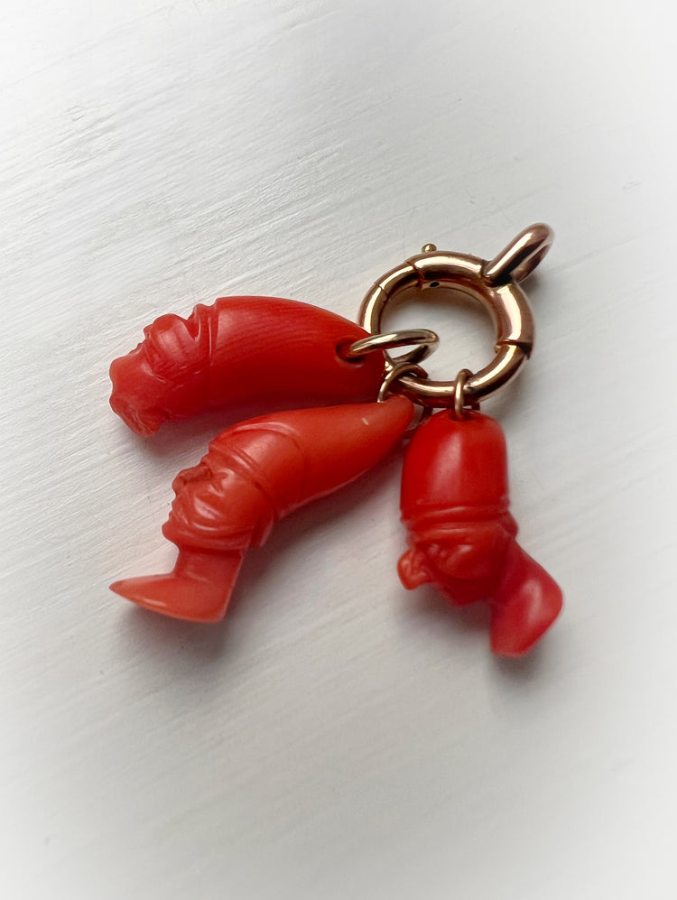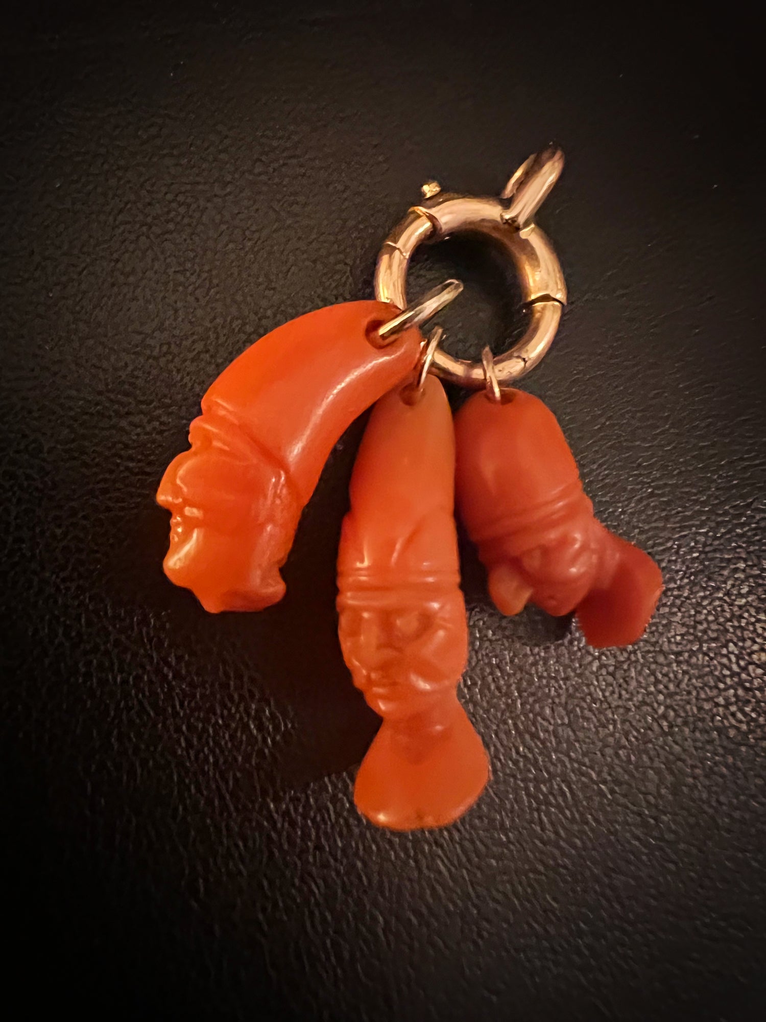 Three early 19th century Italian Punchinello pendants carved from coral, with a 9ct gold solid bolt ring bail.