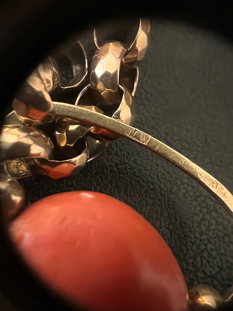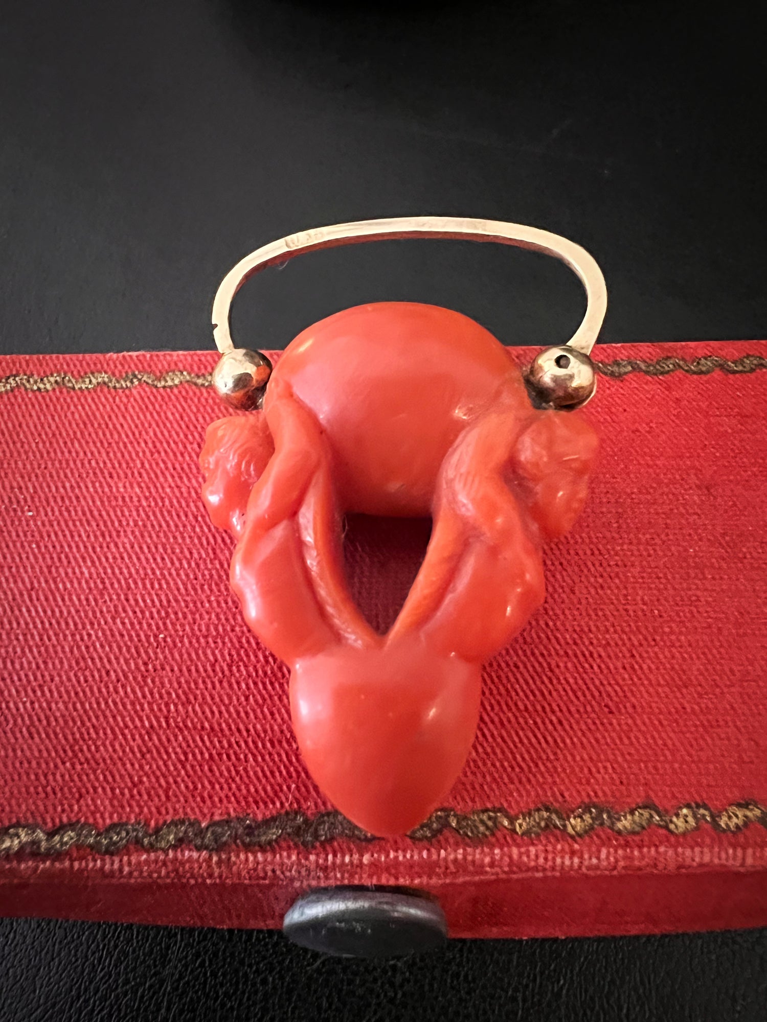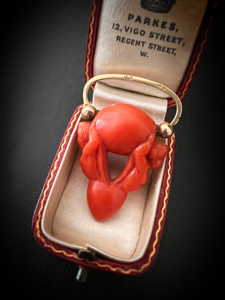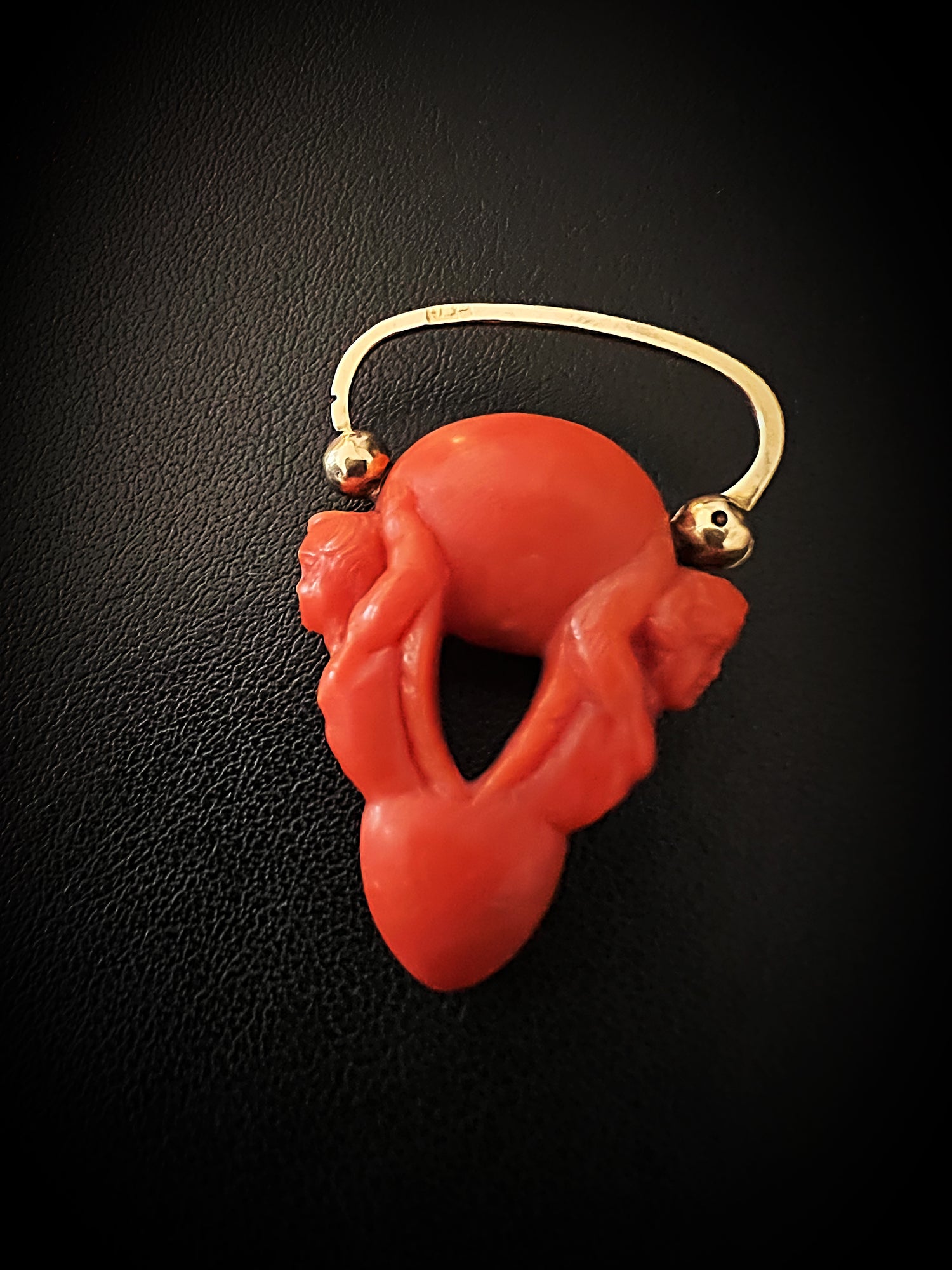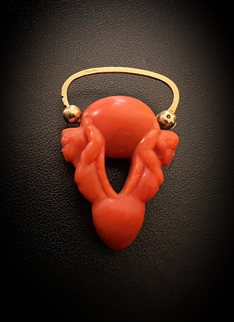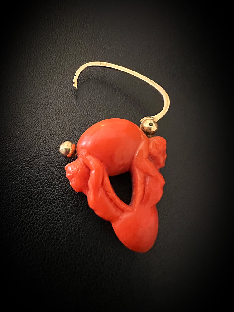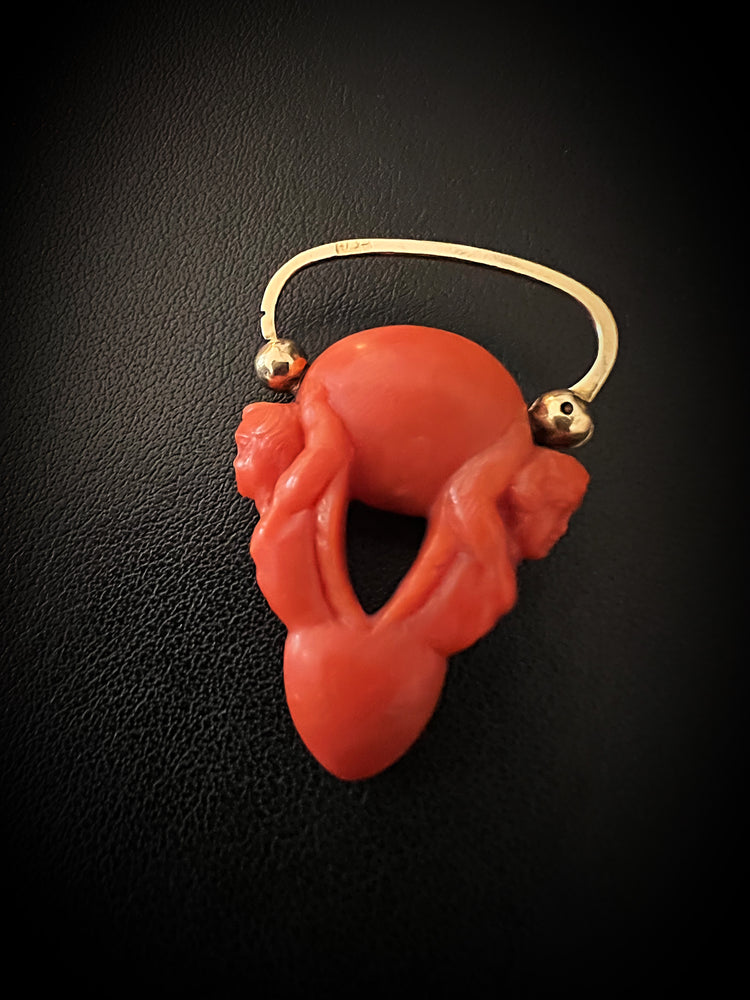 The coral has been beautifully carved into two cherubs with folded wings, they appear to rise from a heart and raise a boulder together.