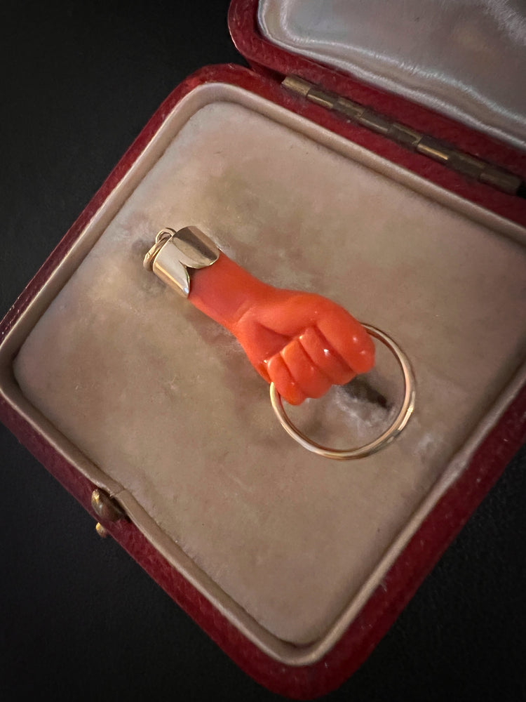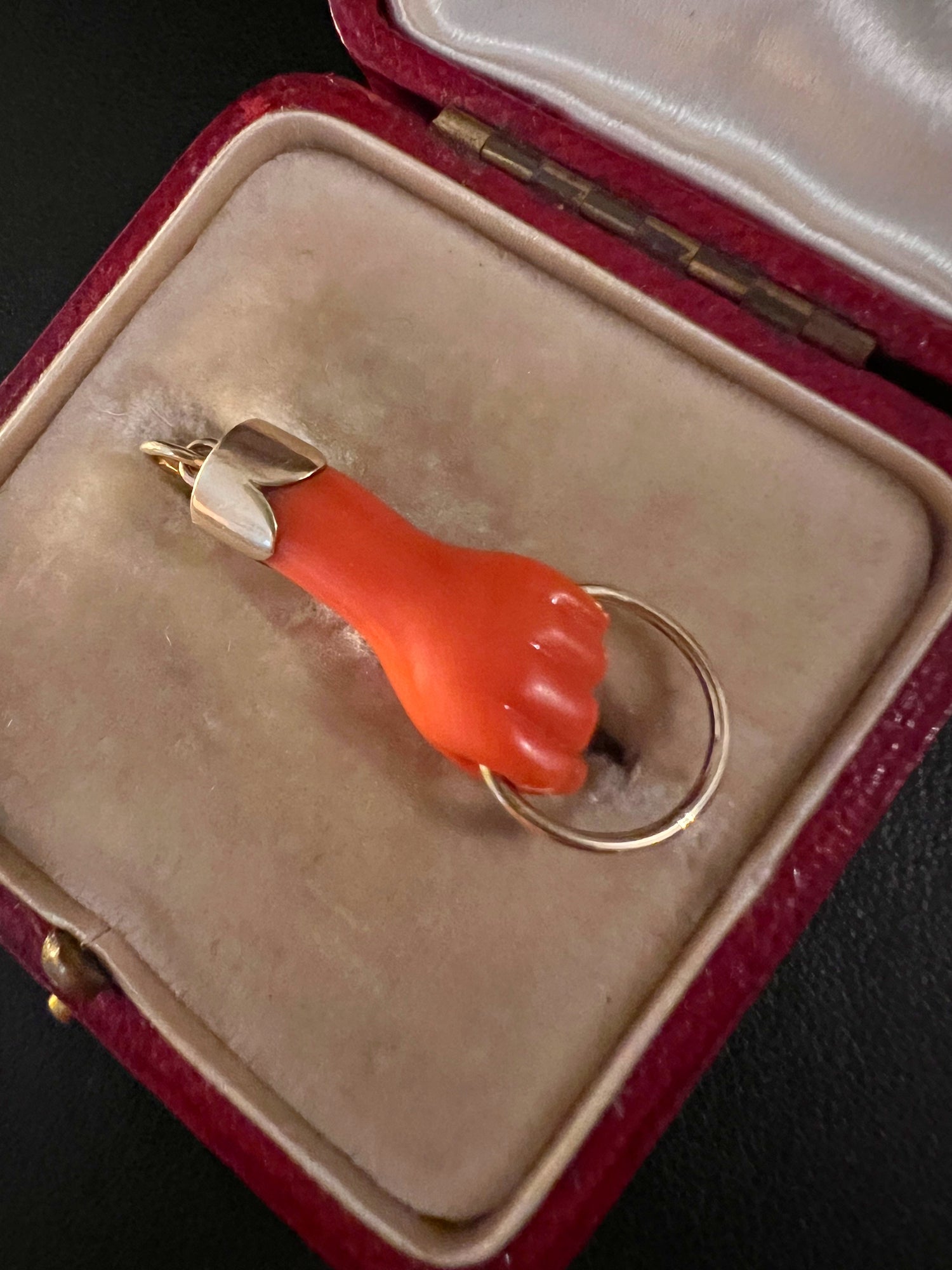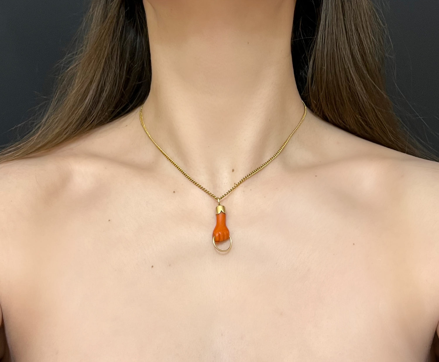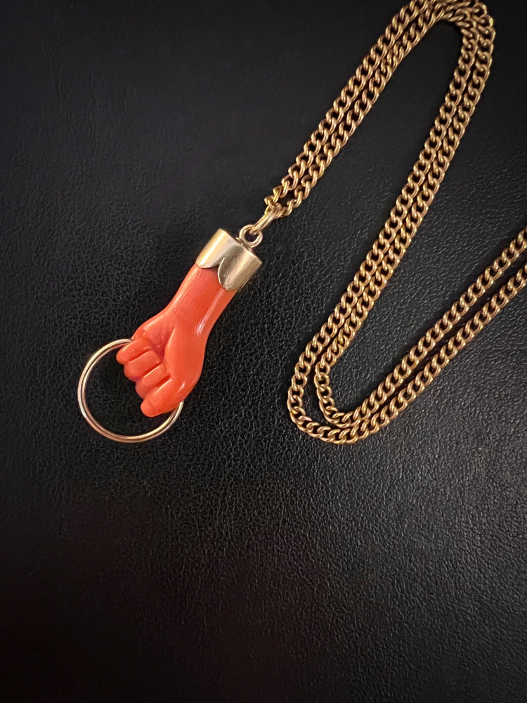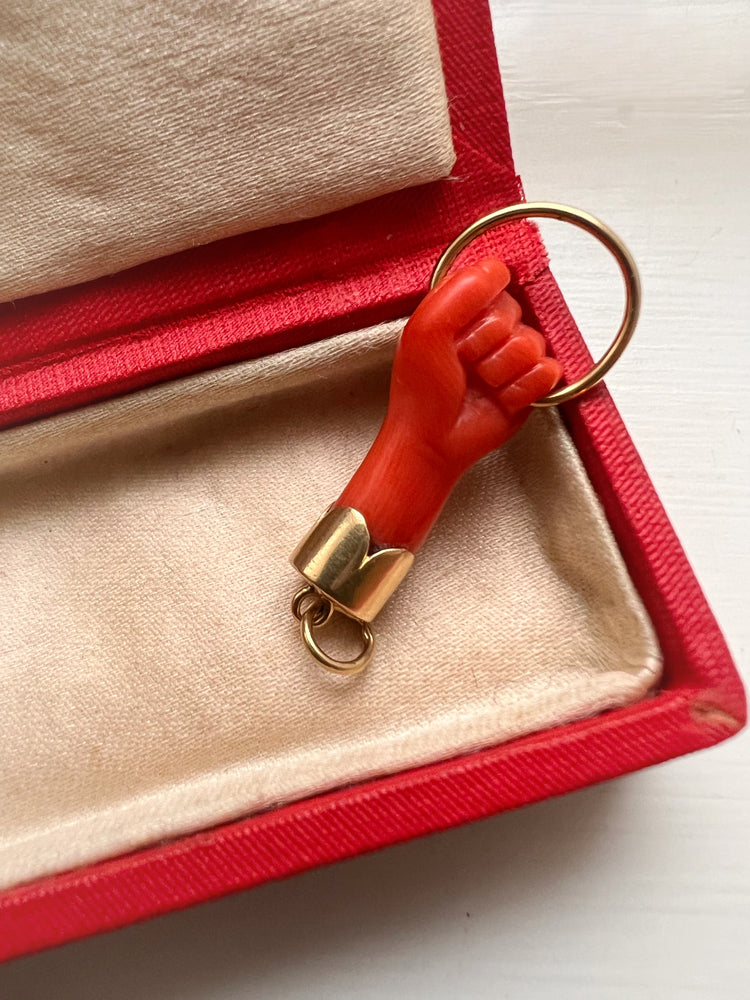 19TH CENTURY CORAL & 18CT GOLD HAND PENDANT