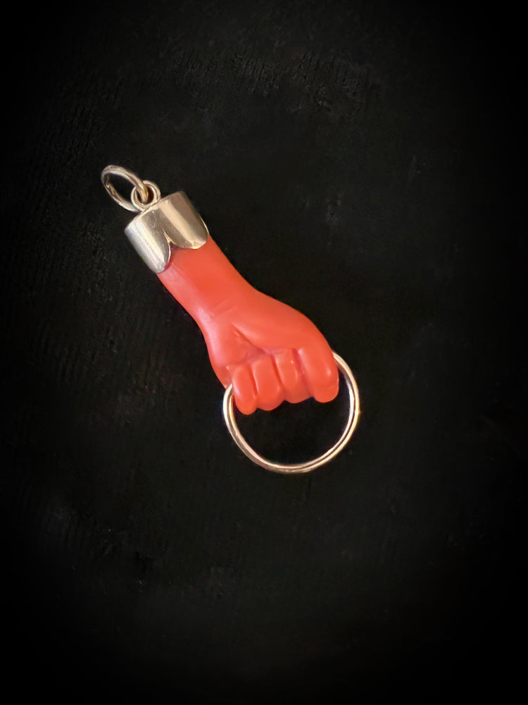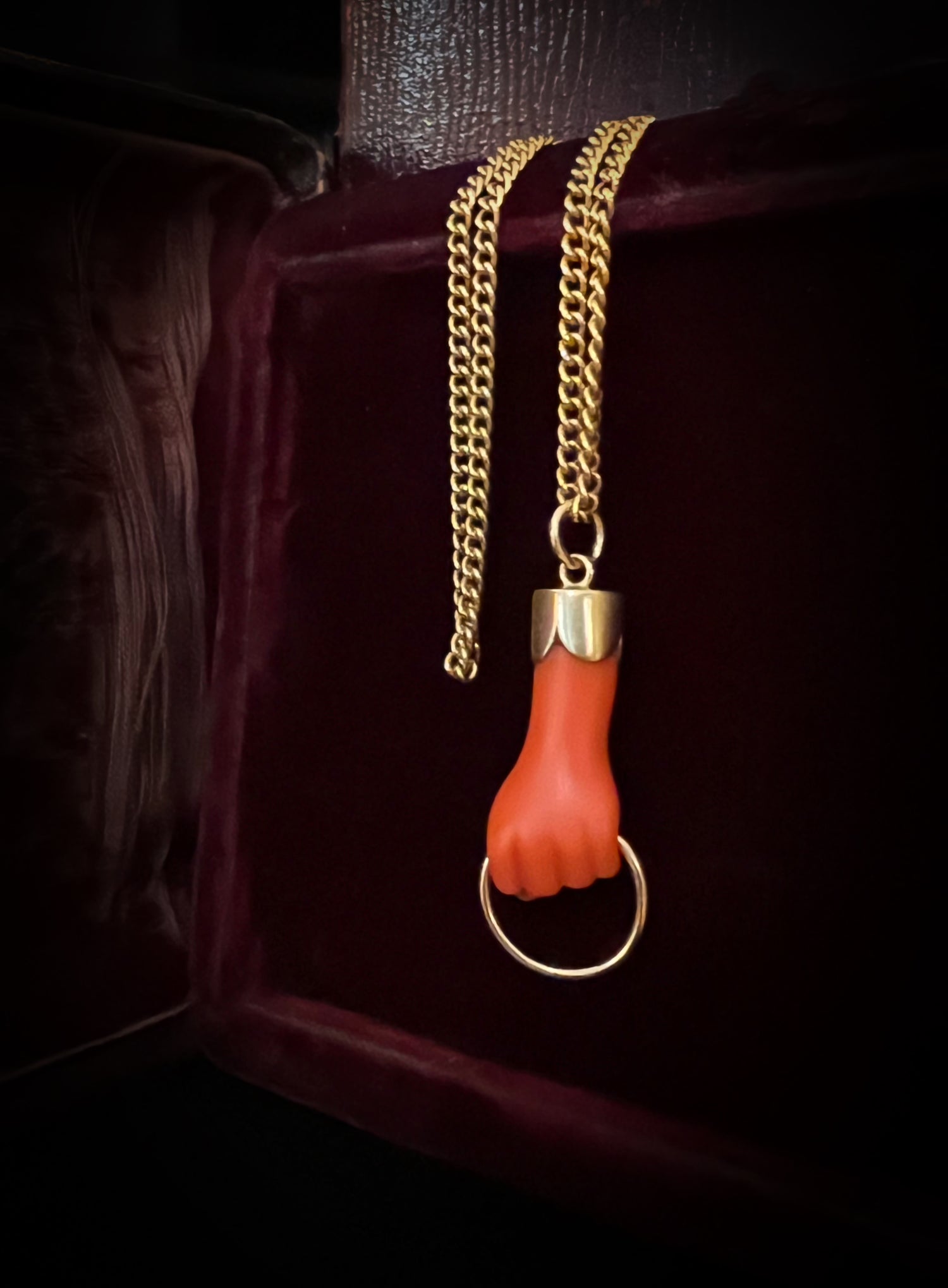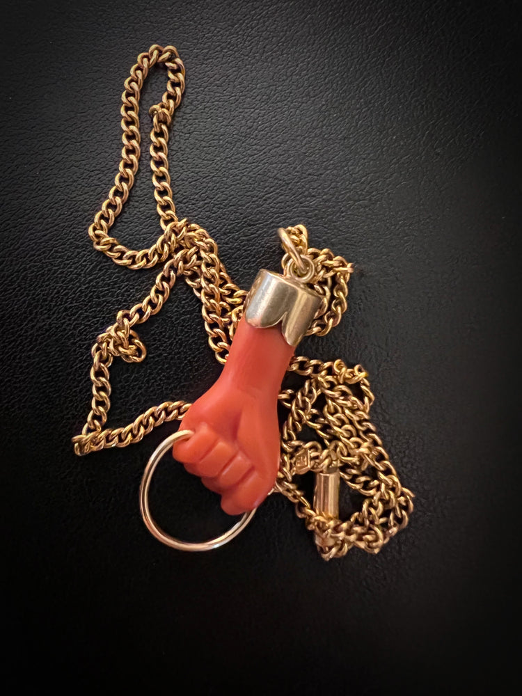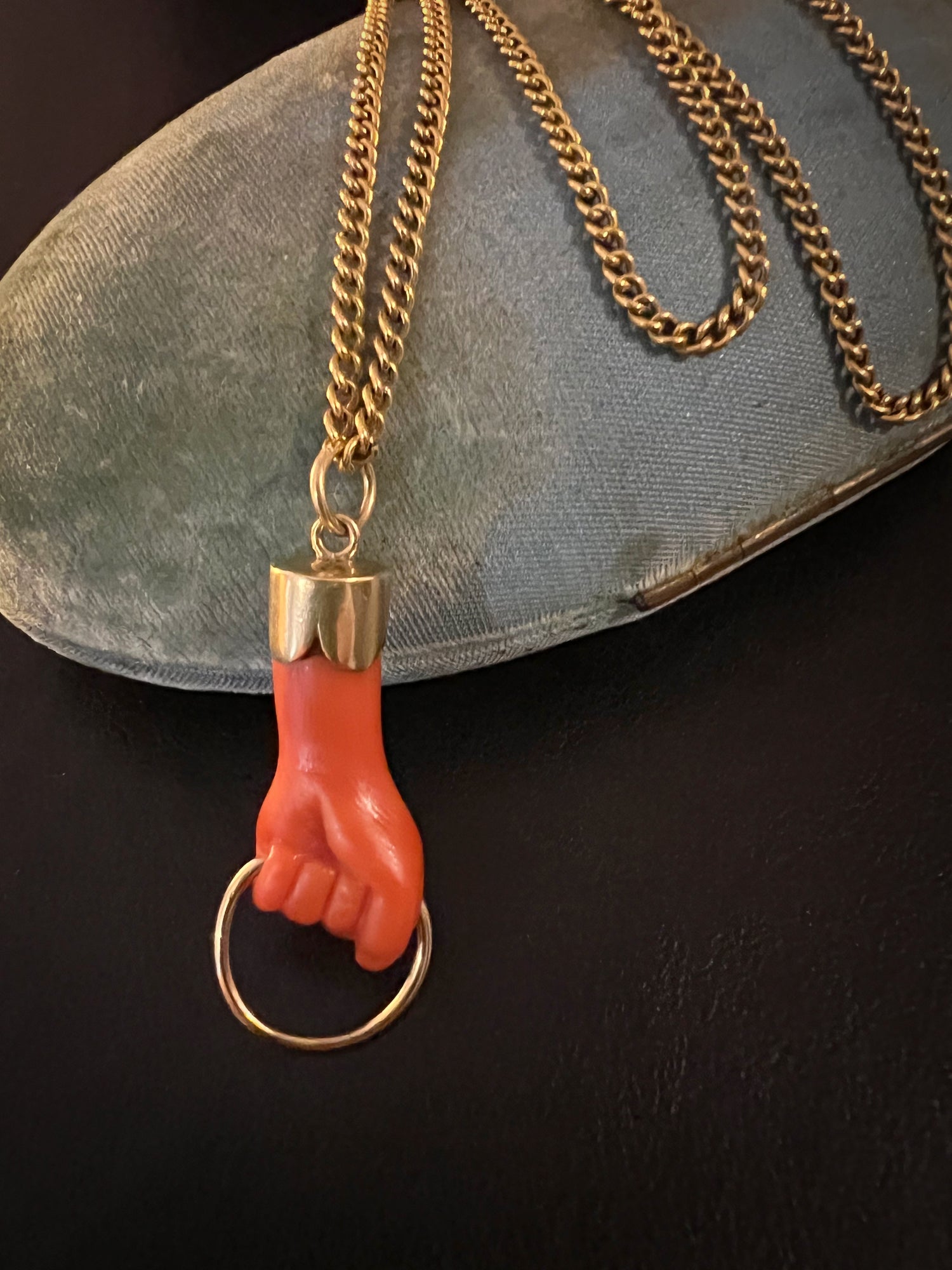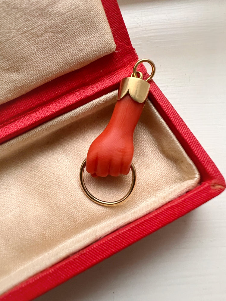19TH CENTURY CORAL & 18CT GOLD HAND PENDANT