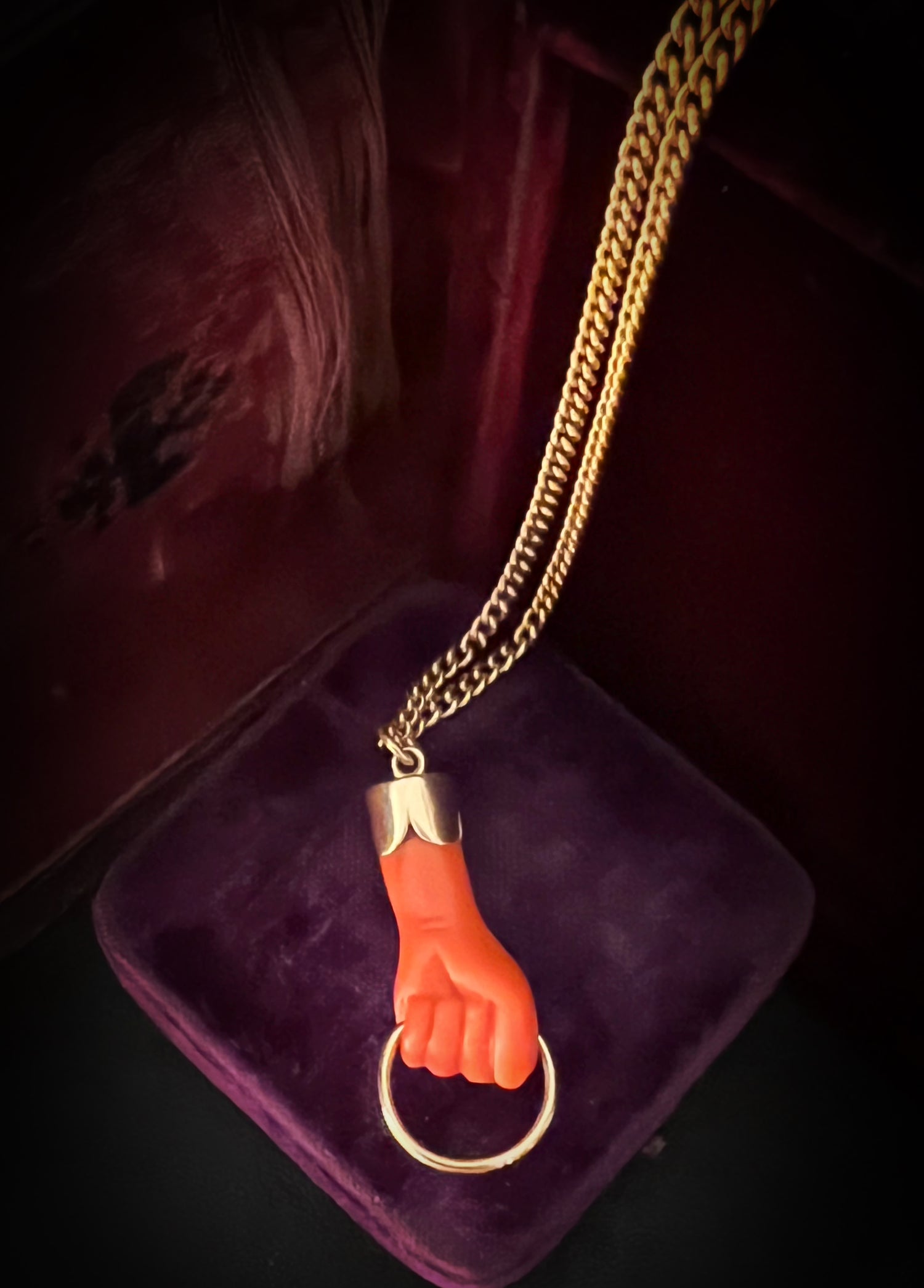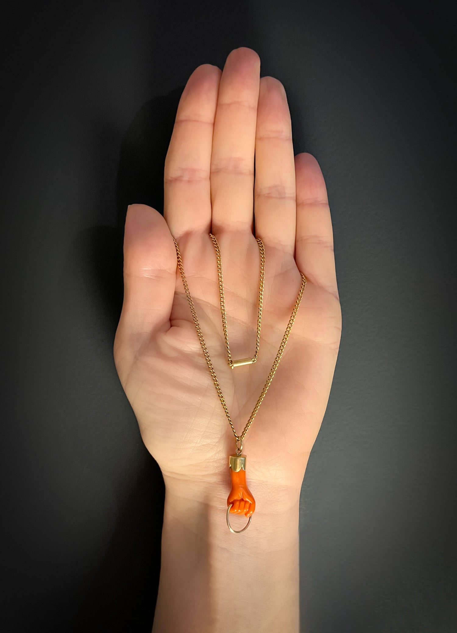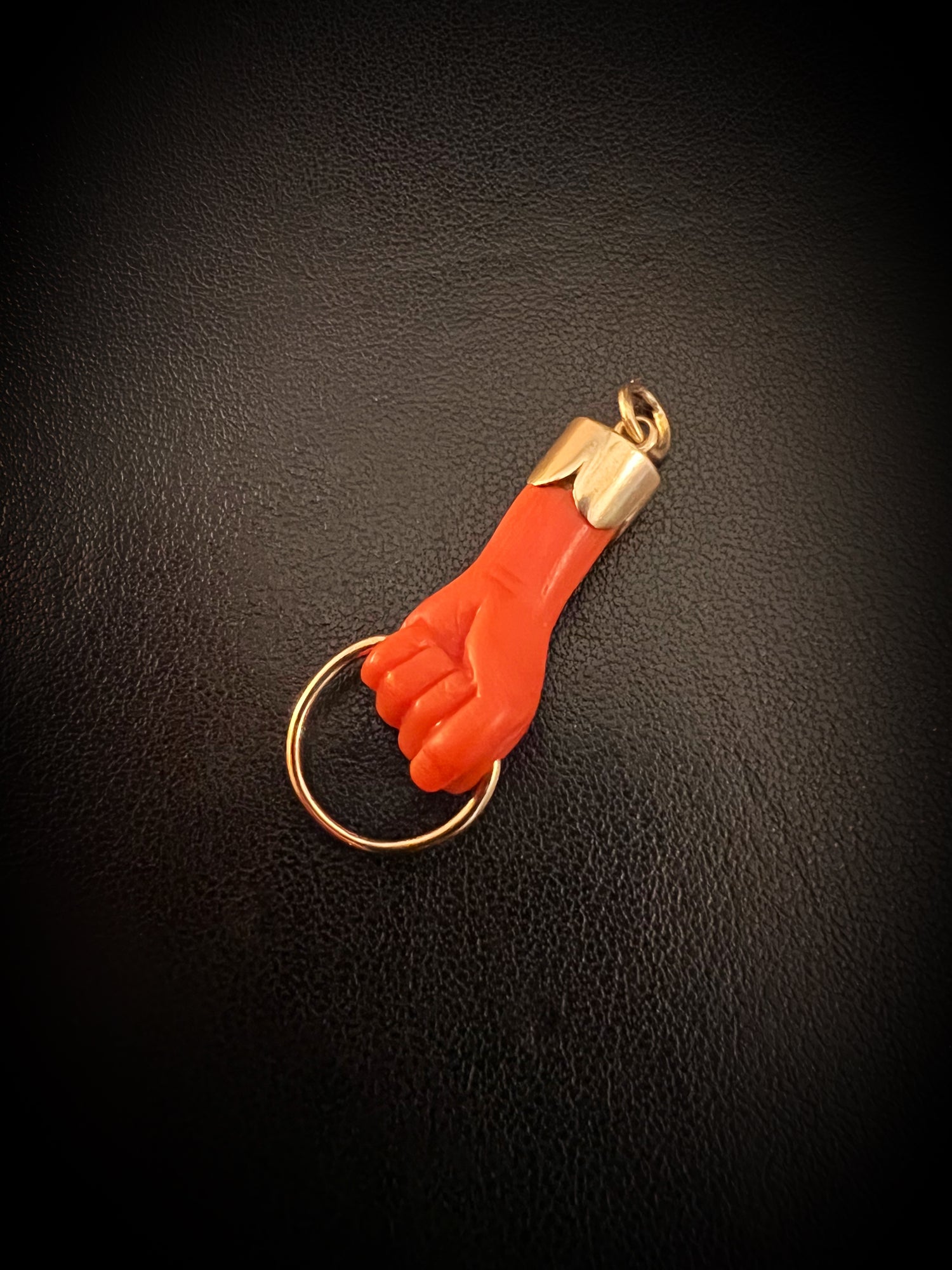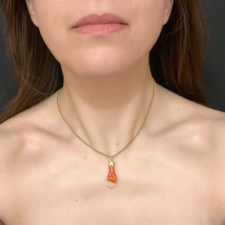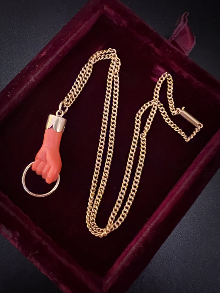 19TH CENTURY CORAL & 18CT GOLD HAND PENDANT