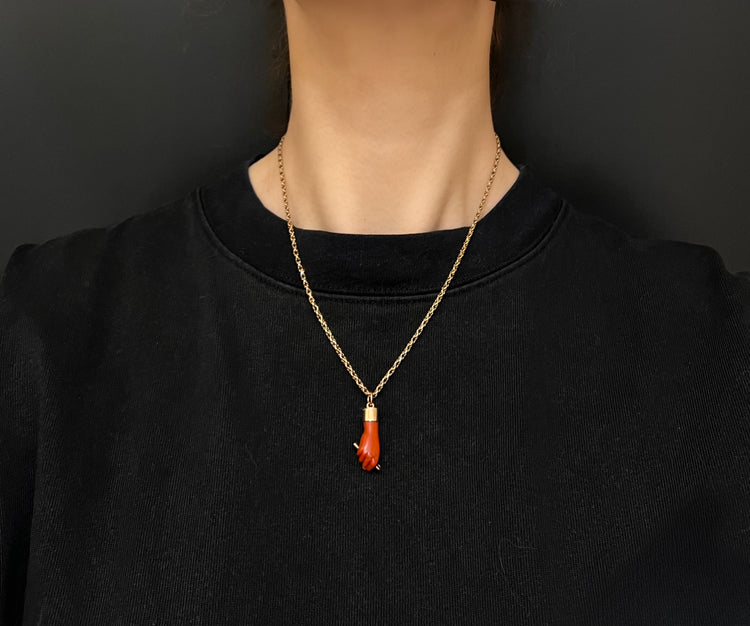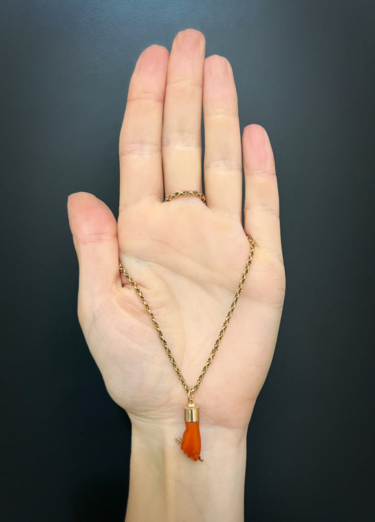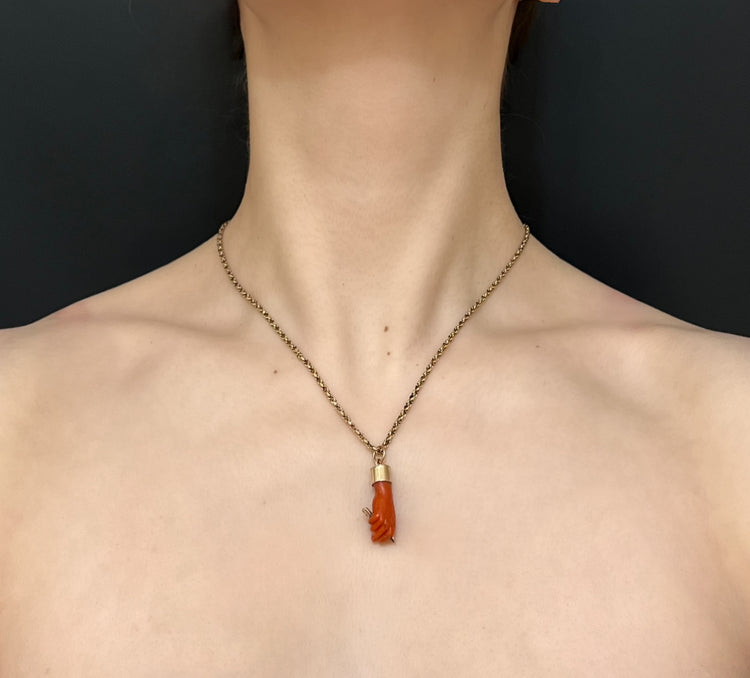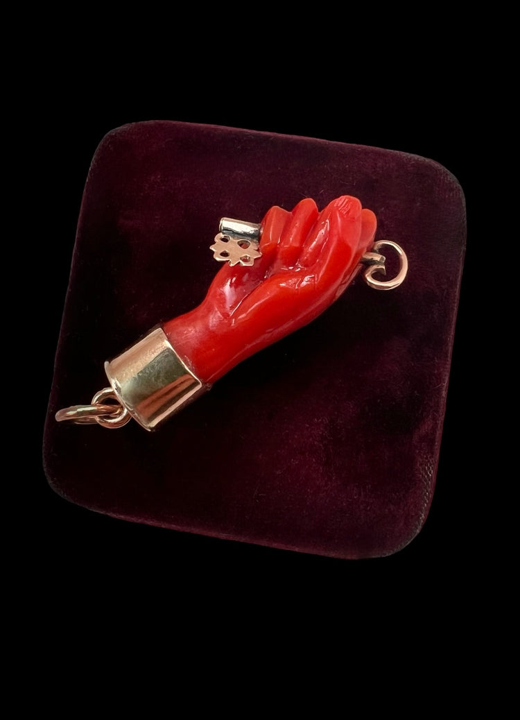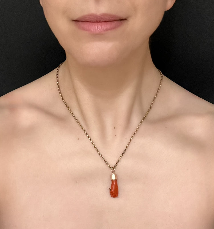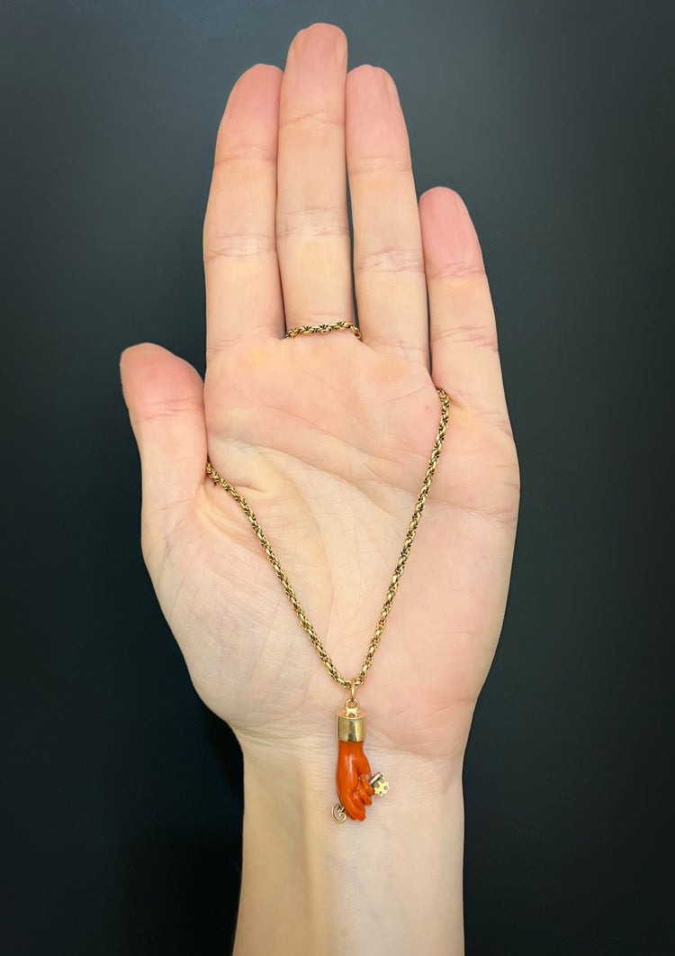 This is a super cool early 19th century carved coral figa hand pendant.