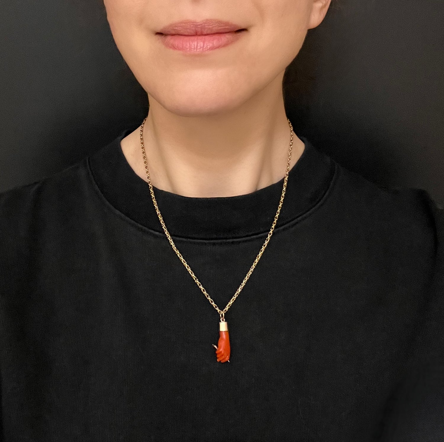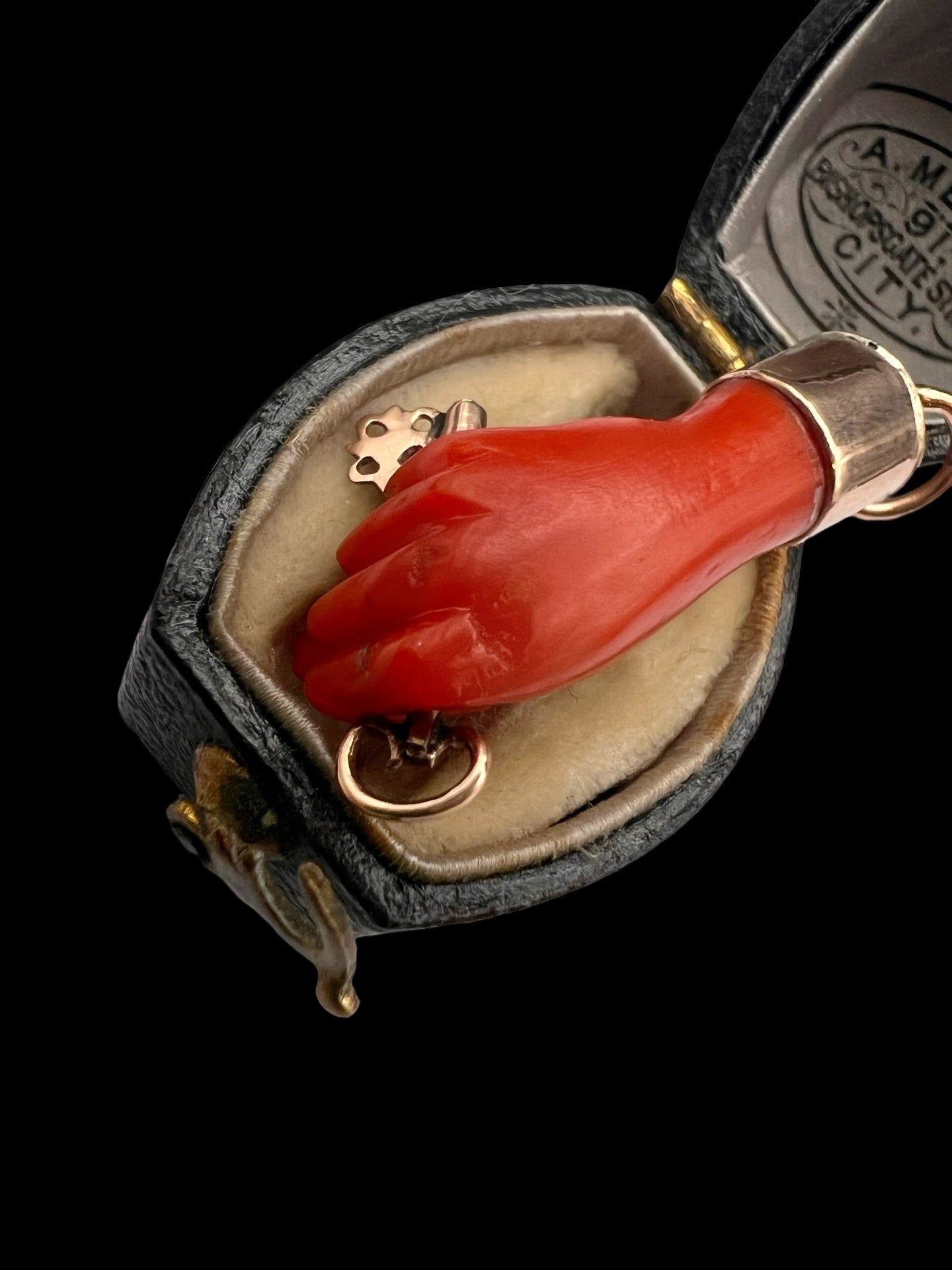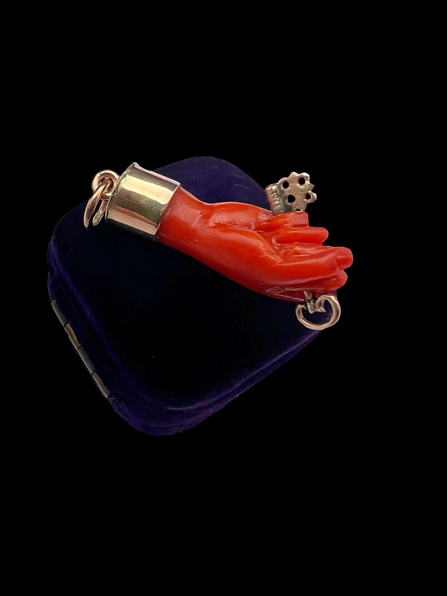 This is a super cool early 19th century carved coral figa hand pendant.