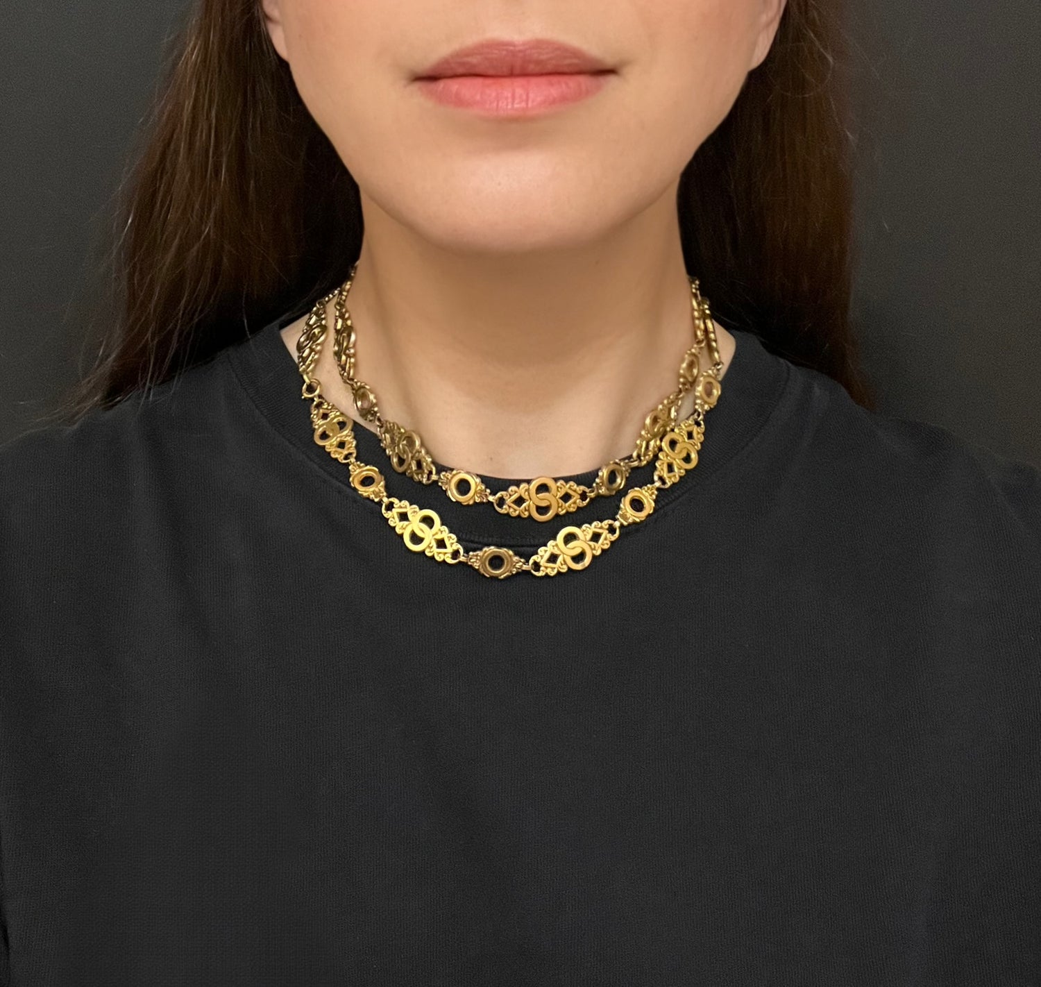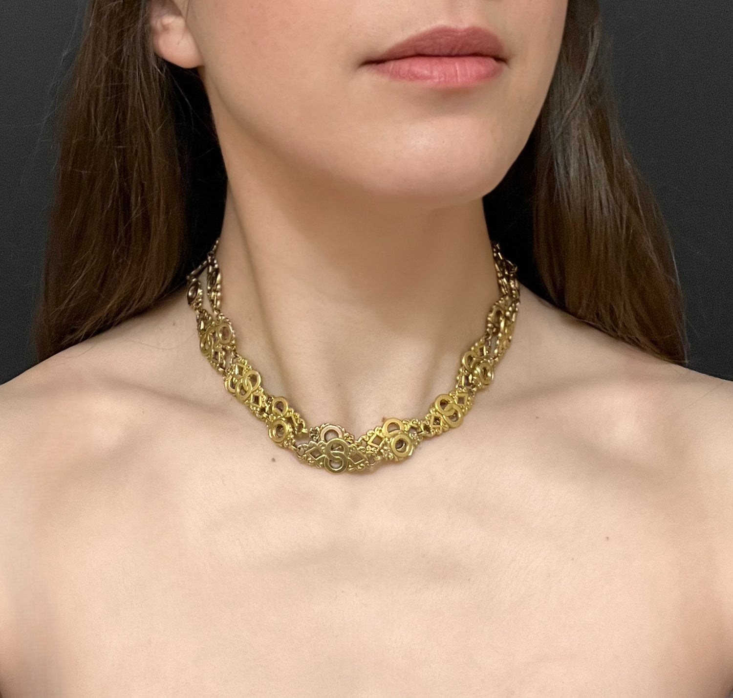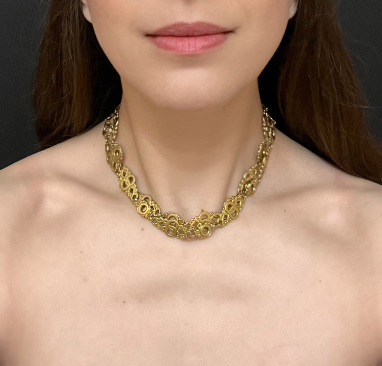 They sit beautifully against the neck, and catch the light perfectly to show off the beautiful patination of the gold.