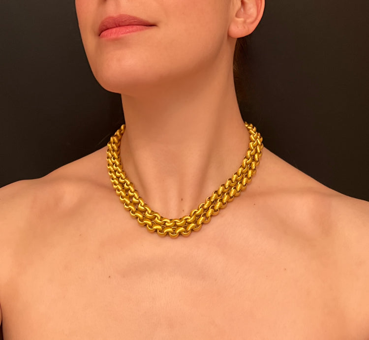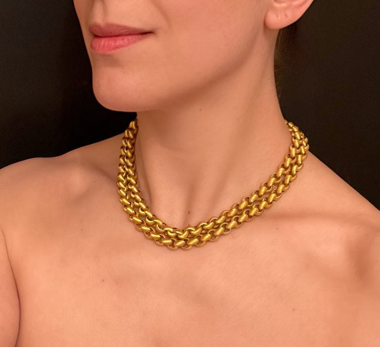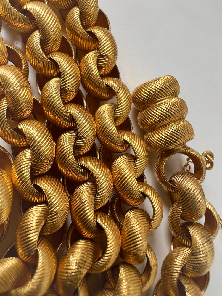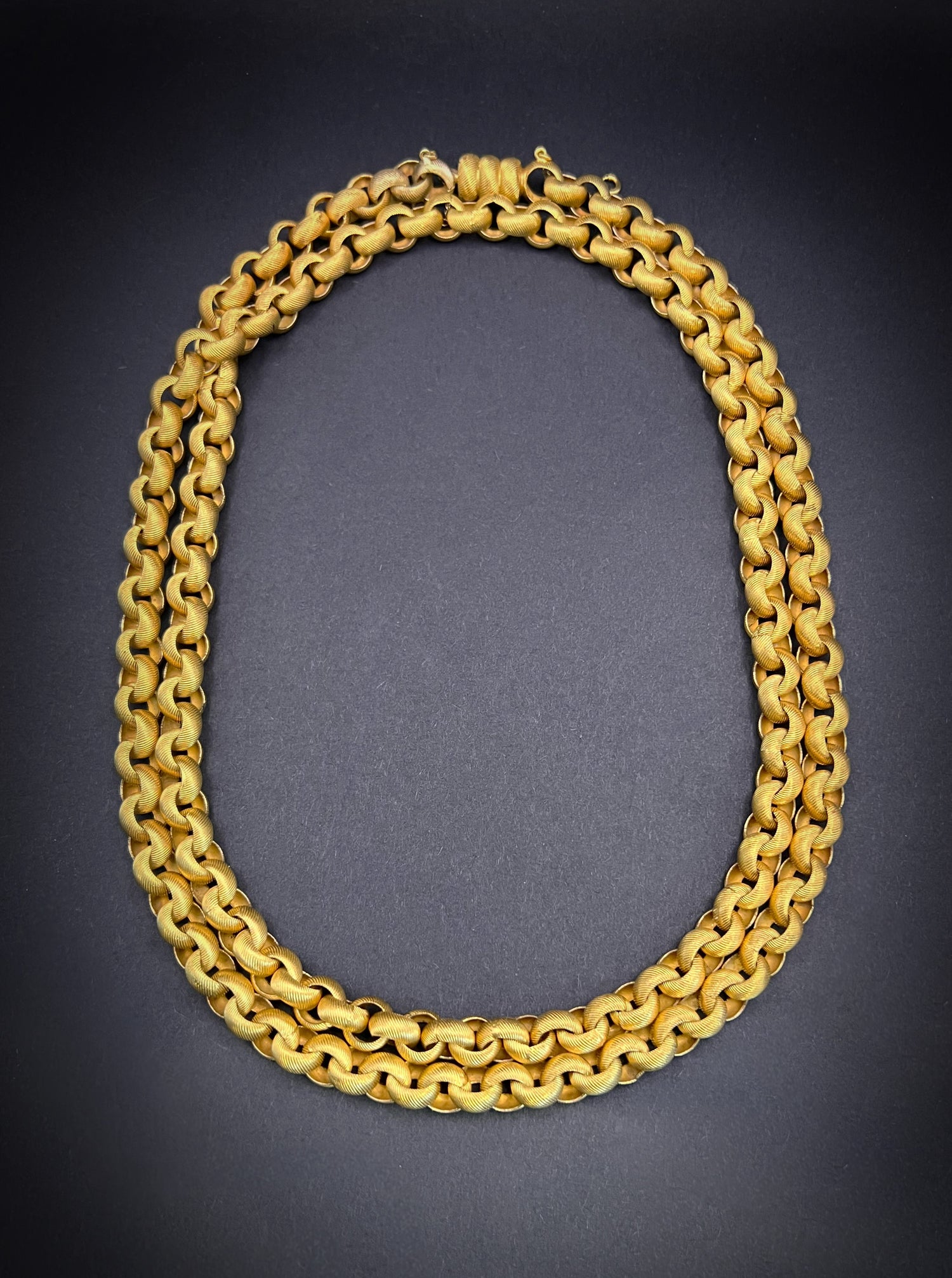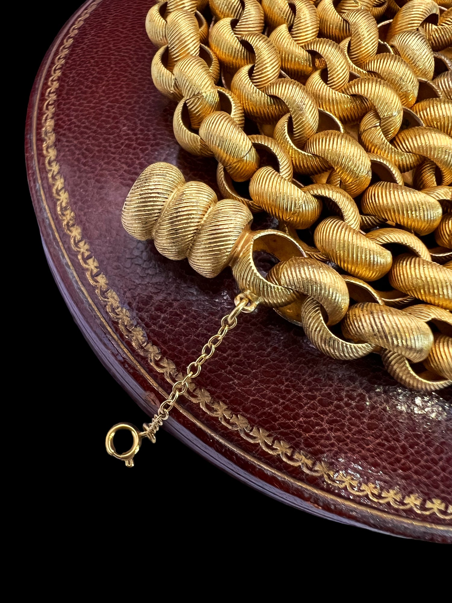 The links have beautiful striped chasing, giving the chain a gorgeous texture, which is also present on the large matching barrel clasp.