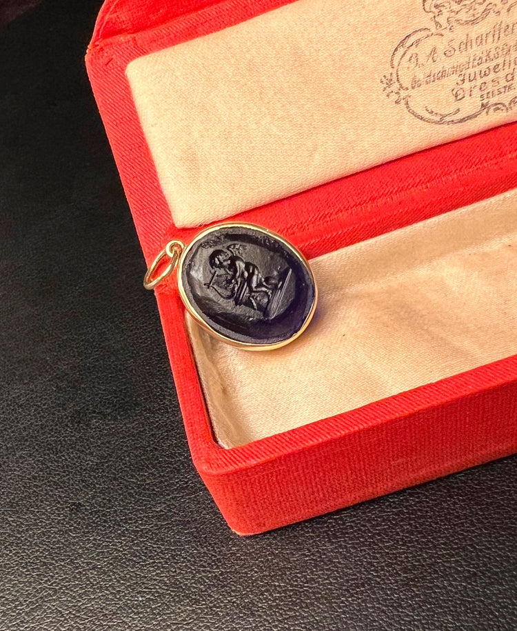 The intaglio has been set in a very simple 9ct gold setting, to allow the story of the piece to take centre stage.