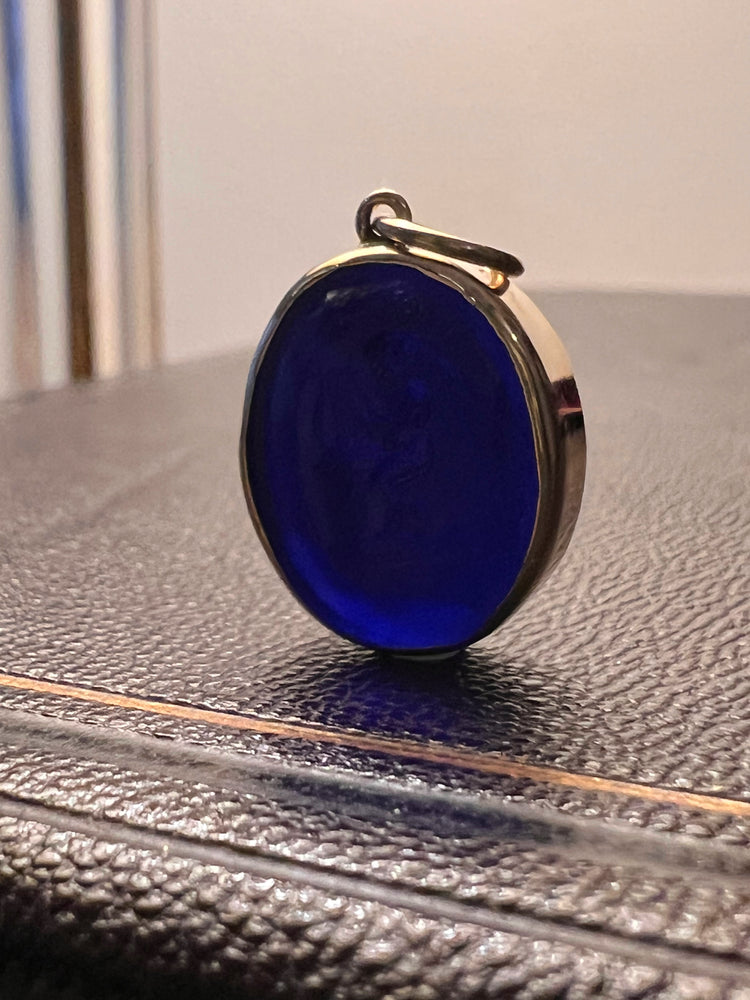 A gorgeous cobolt blue oval early Victorian ‘Tassie’ glass intaglio depicting a chubby Cupid playing a lyre.