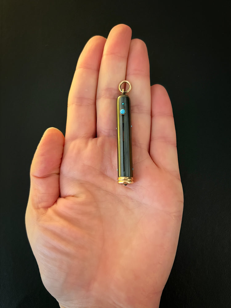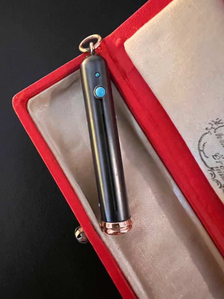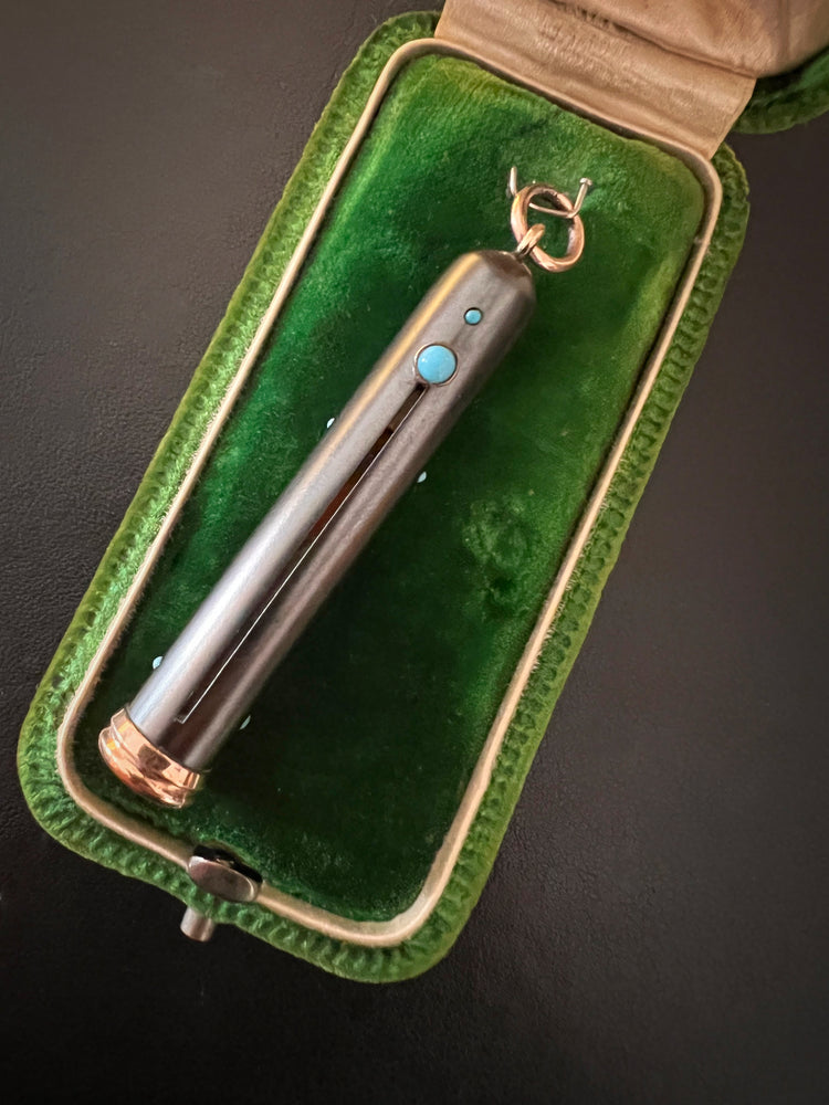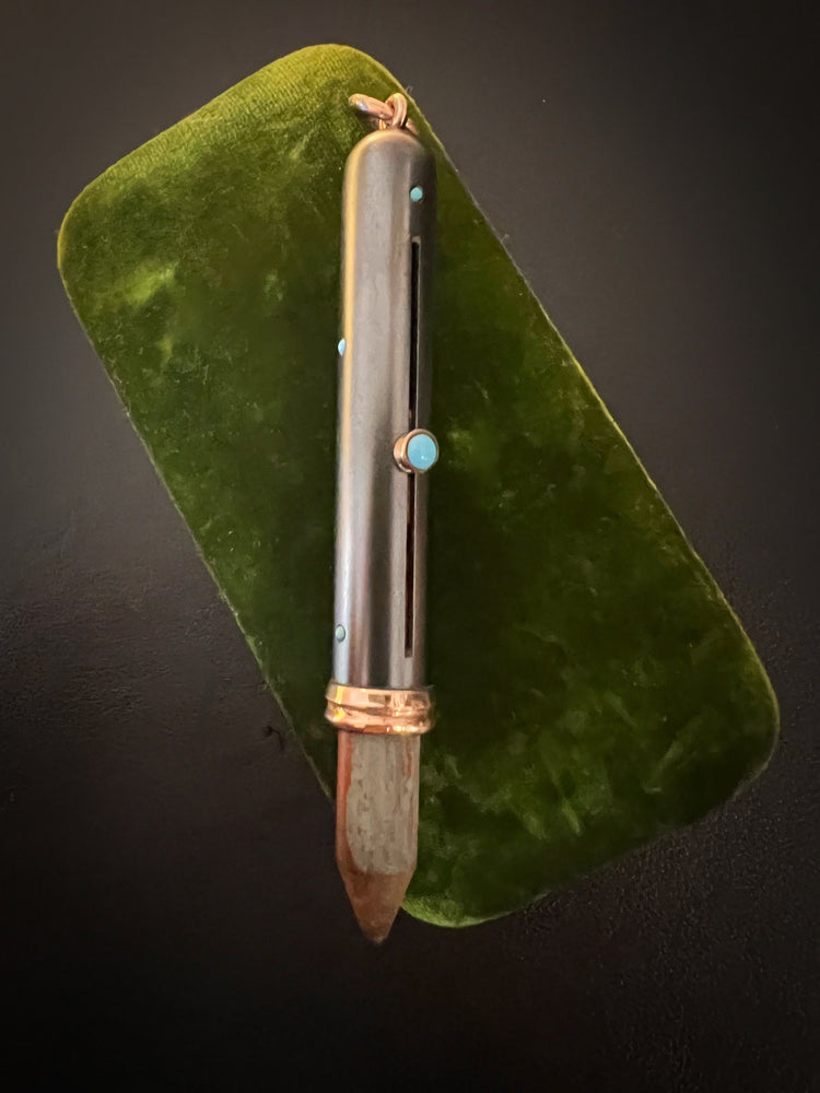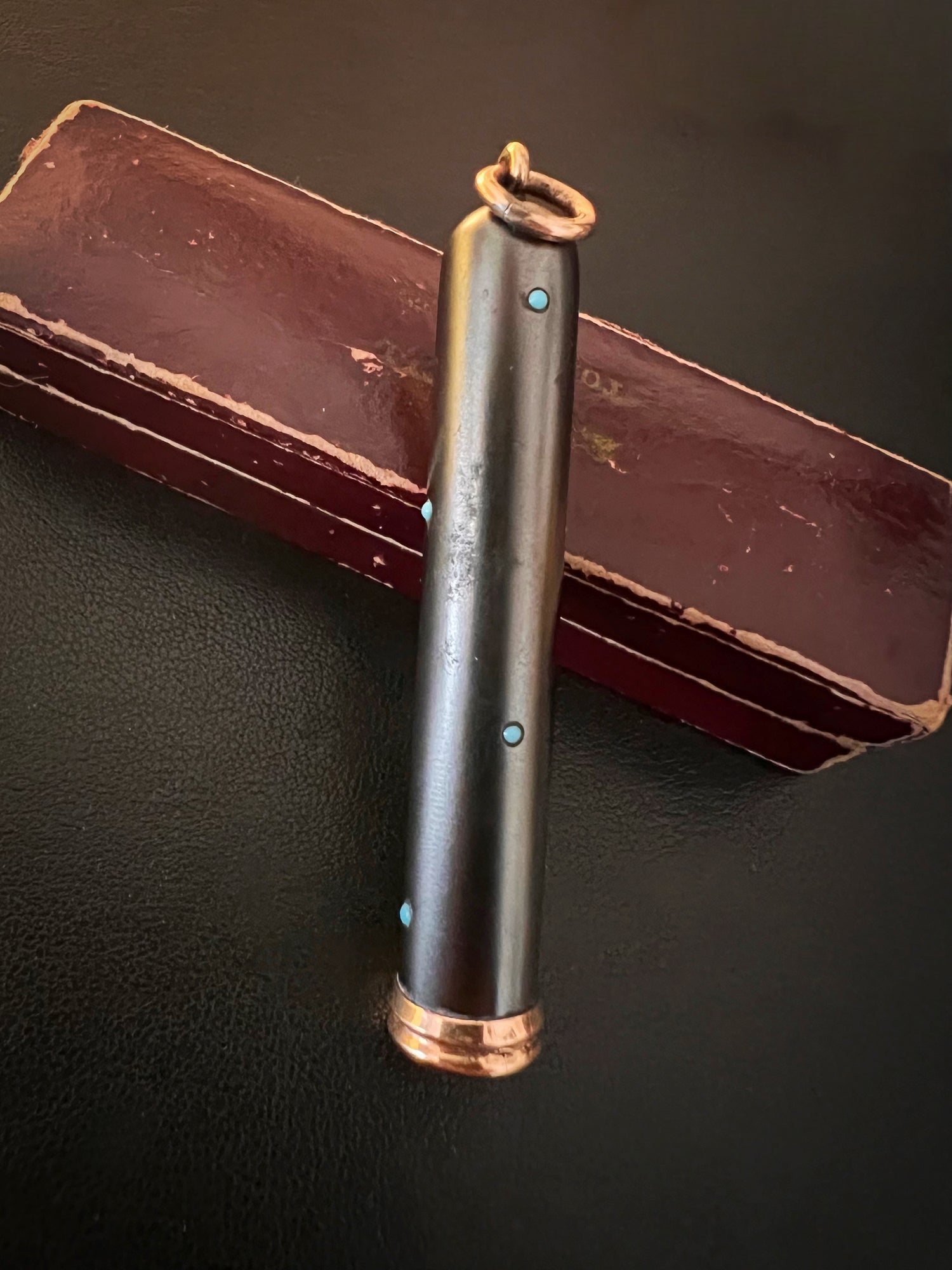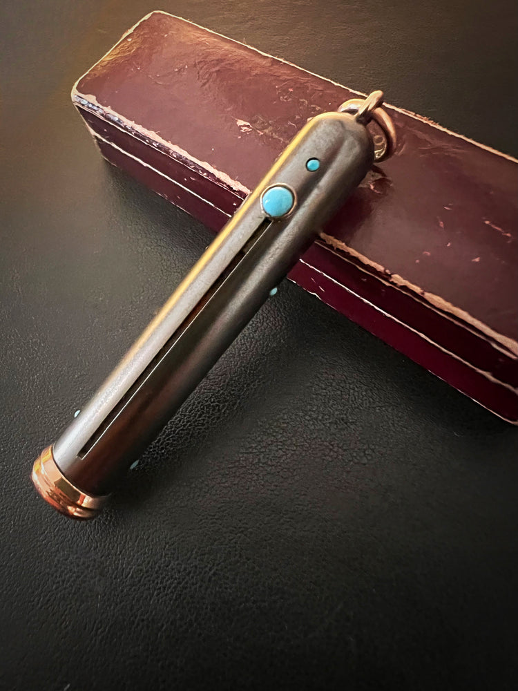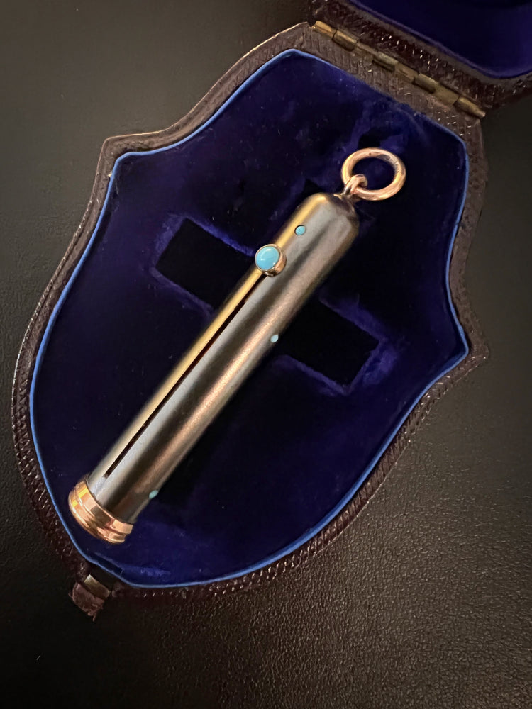 The pencil case is made of gunmetal and has tiny cabochon turquoise stones.