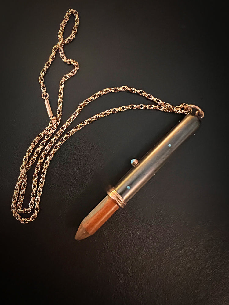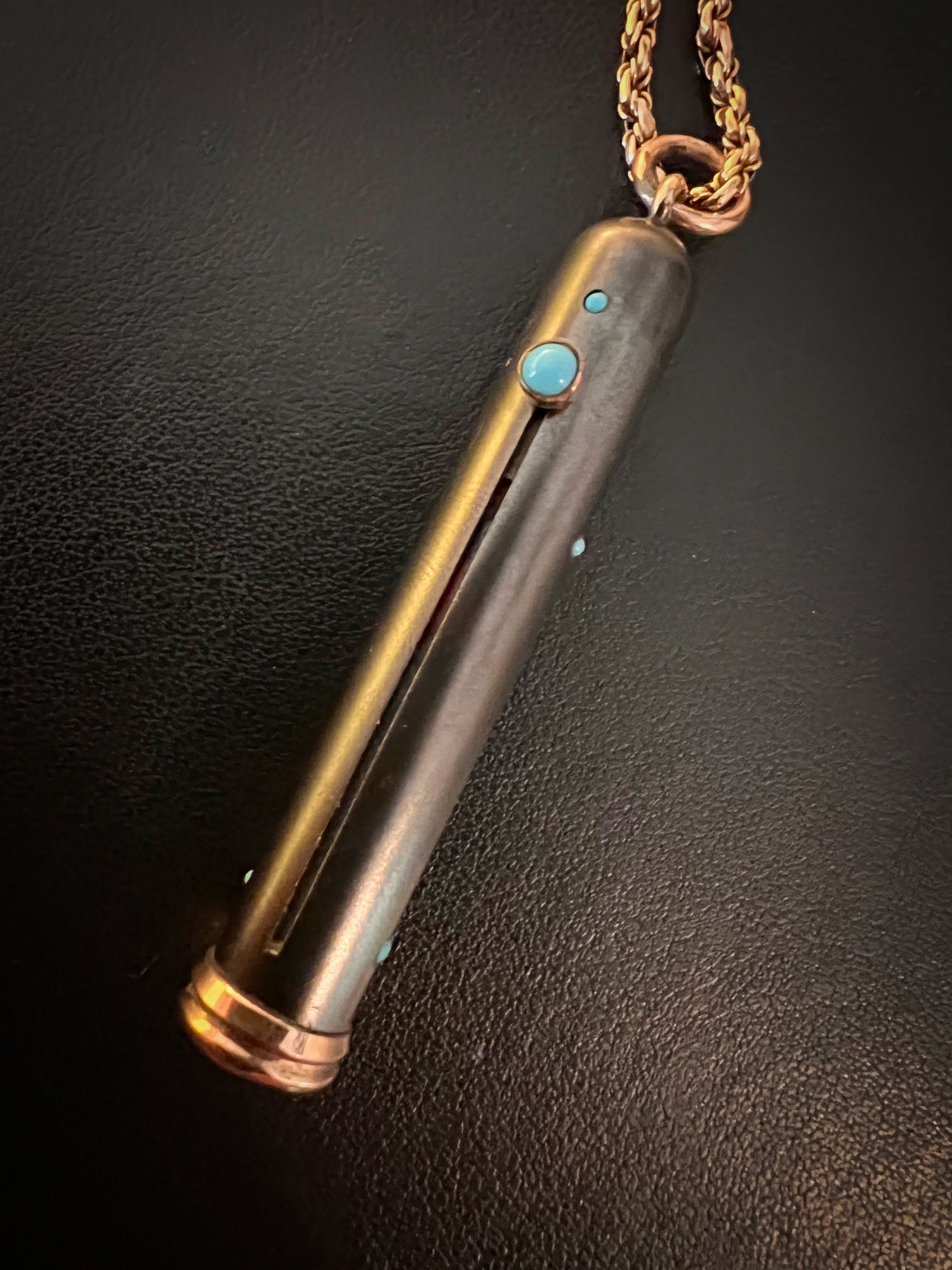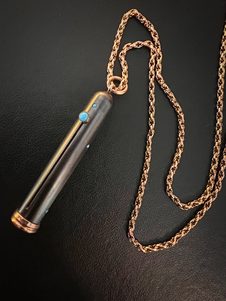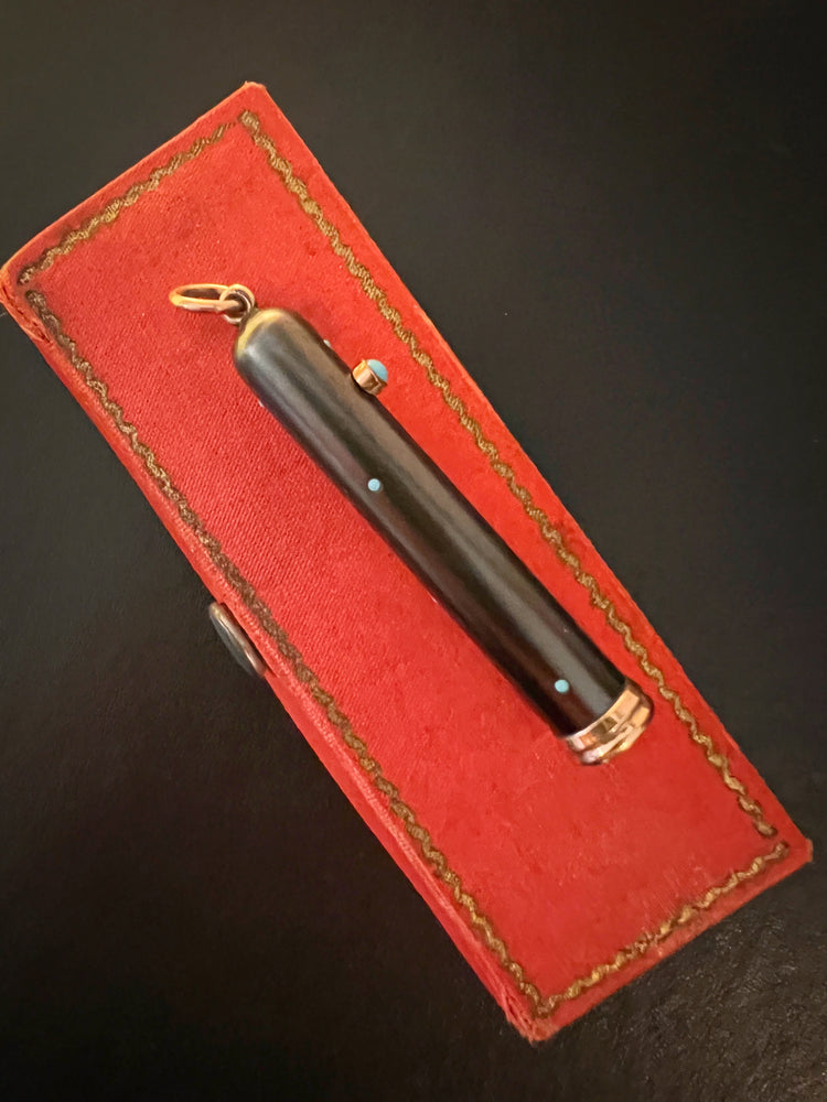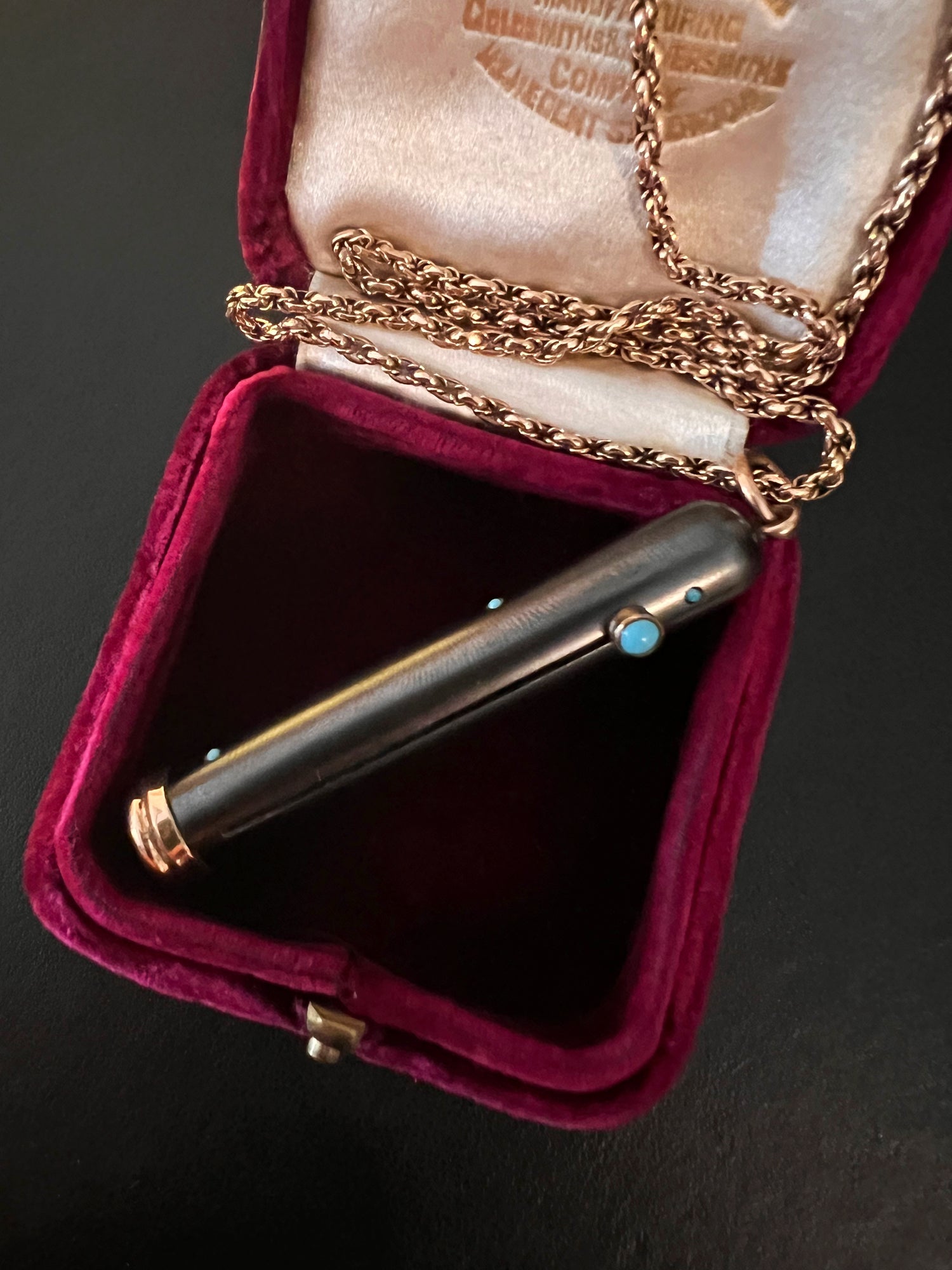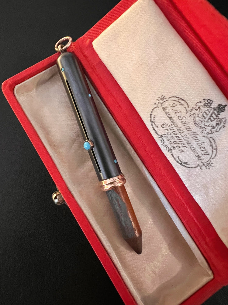 The pencil case is made of gunmetal and has tiny cabochon turquoise stones.