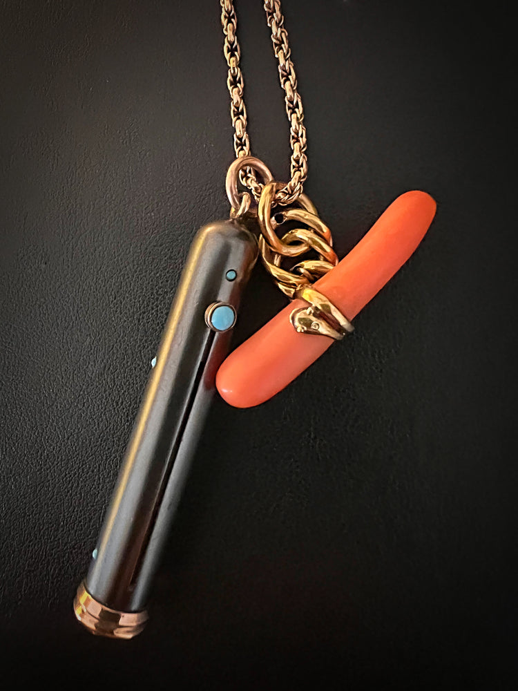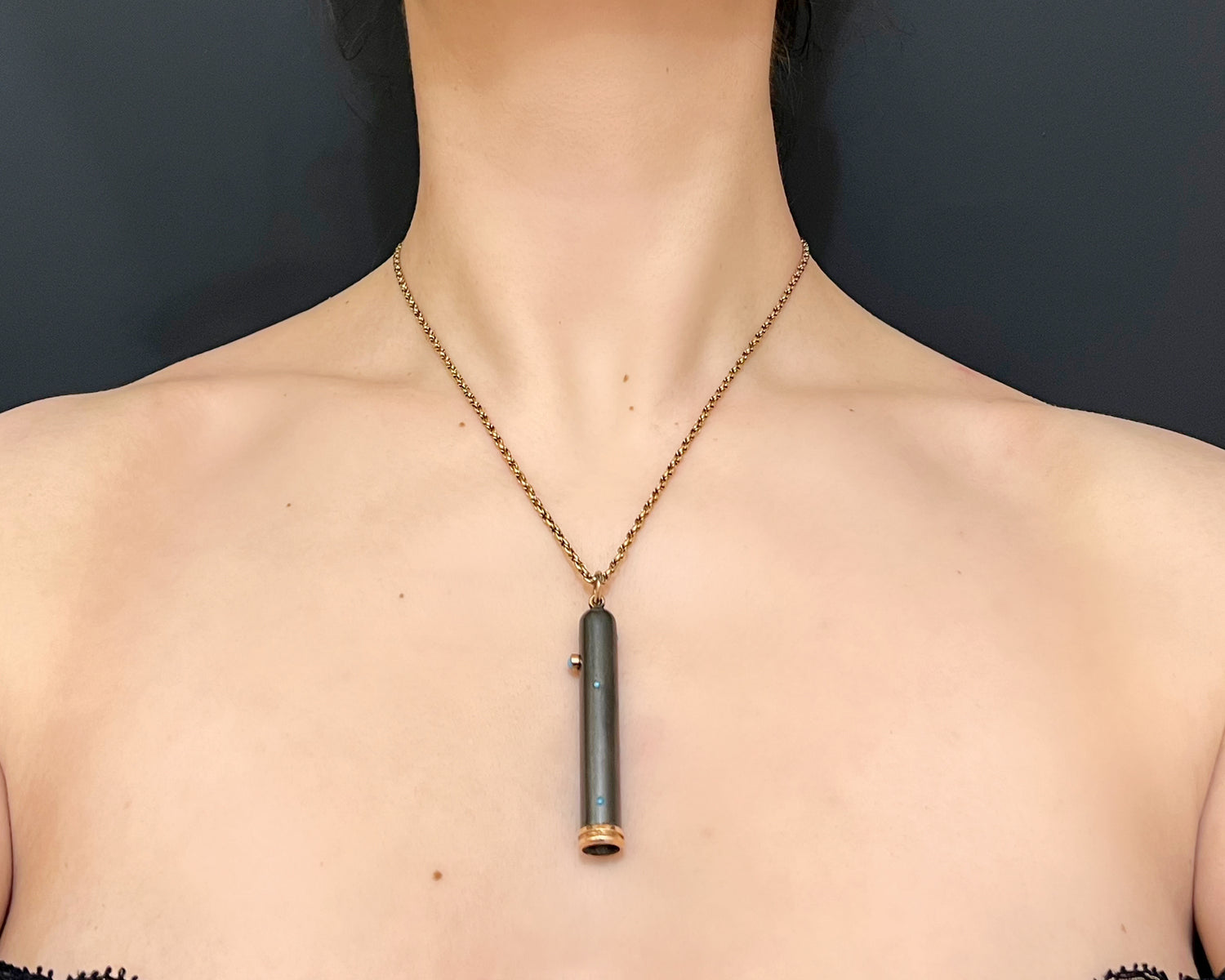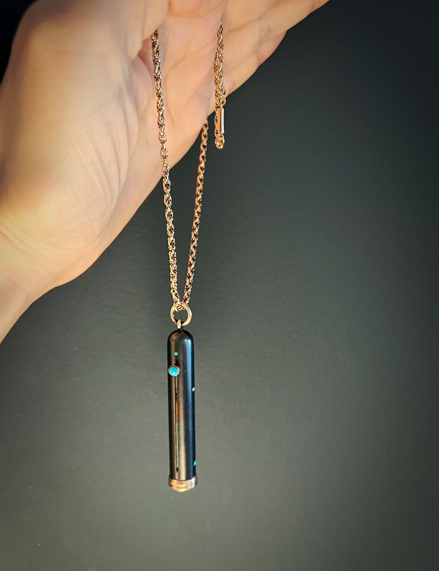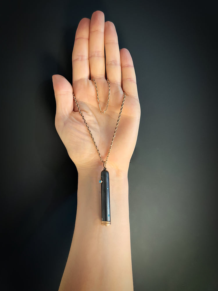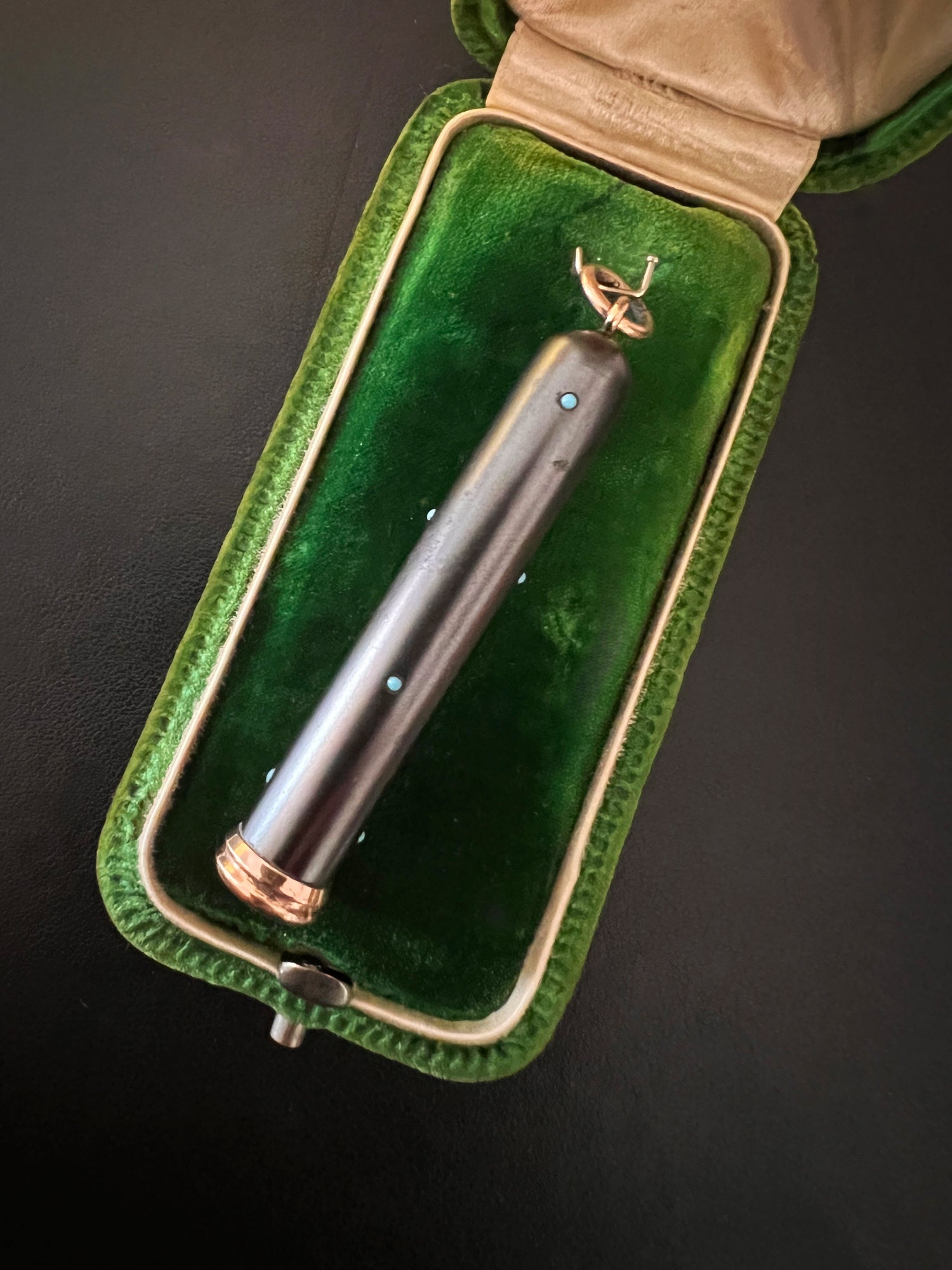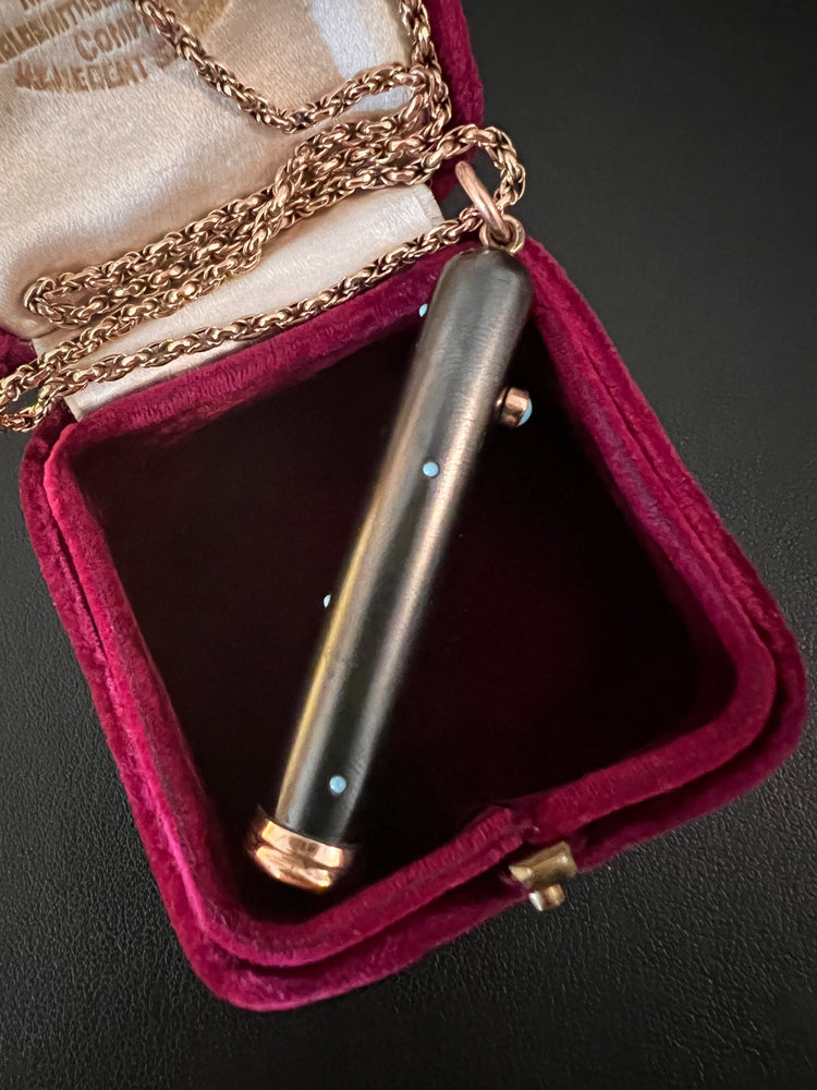 The pencil case is made of gunmetal and has tiny cabochon turquoise stones.