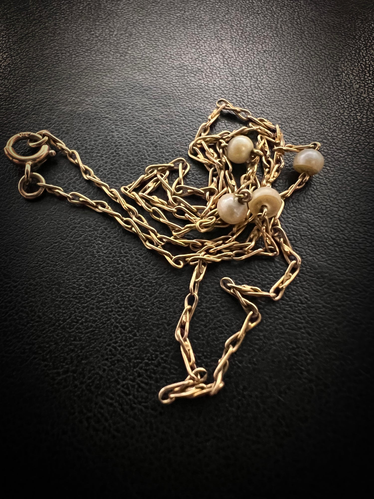 A lovely 9ct gold Edwardian chain with infinity links punctuated by four natural pearls