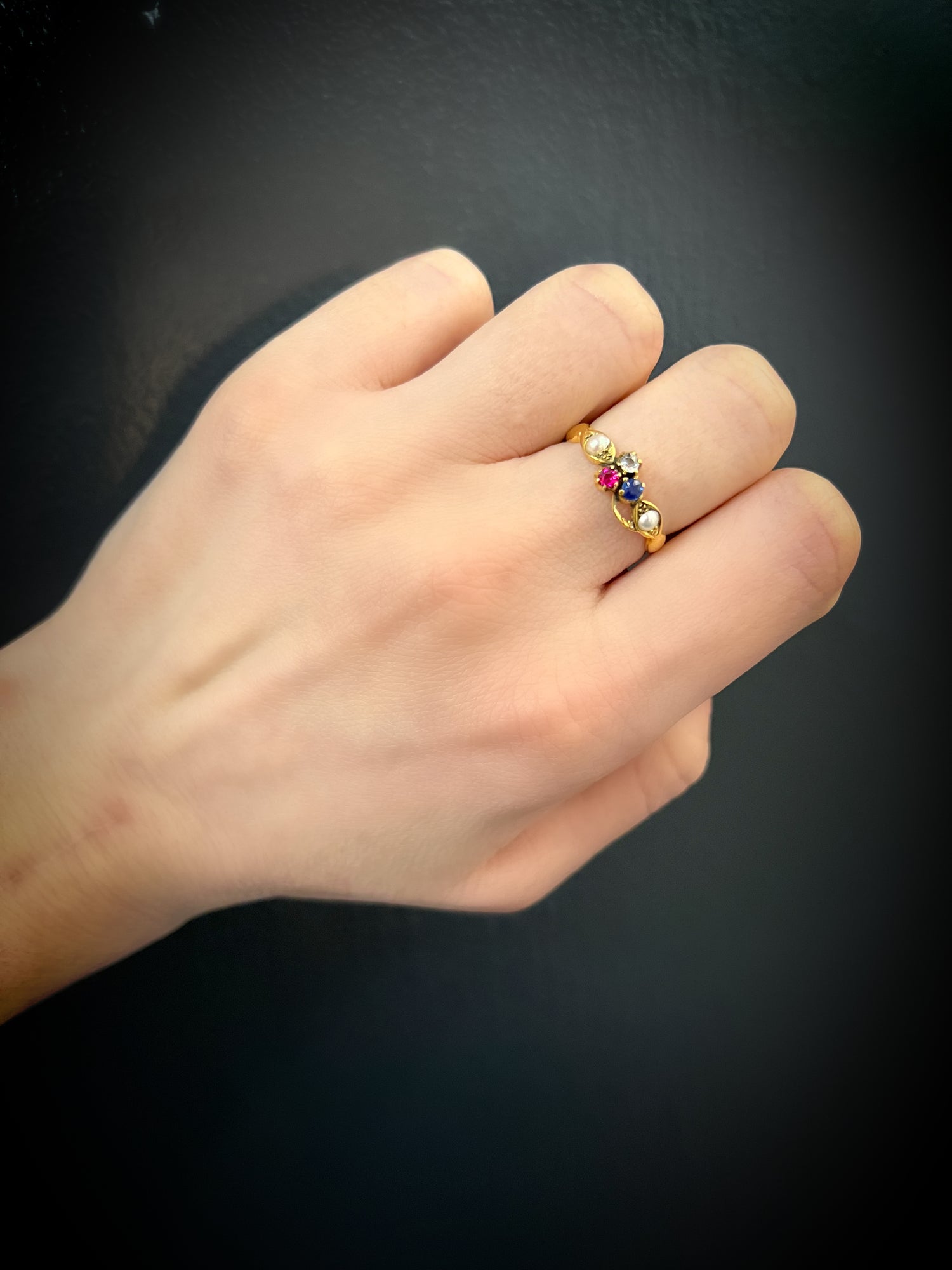 These are flanked by two antique pearls.
