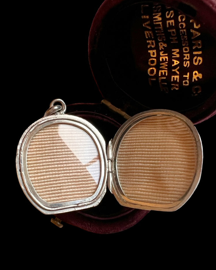 The pendant opens to reveal two glass lockets, which have cream silk grosgrain linings.
