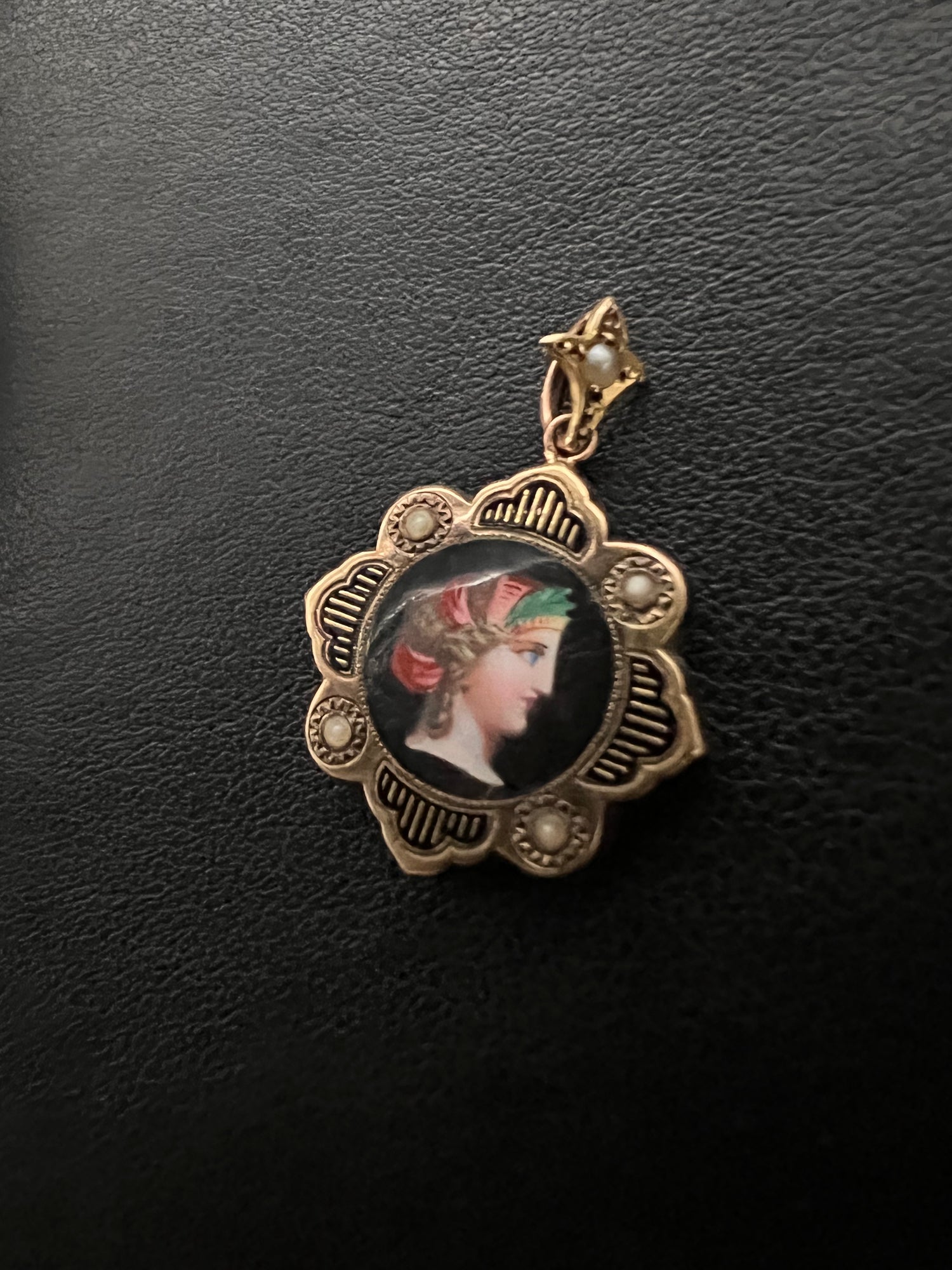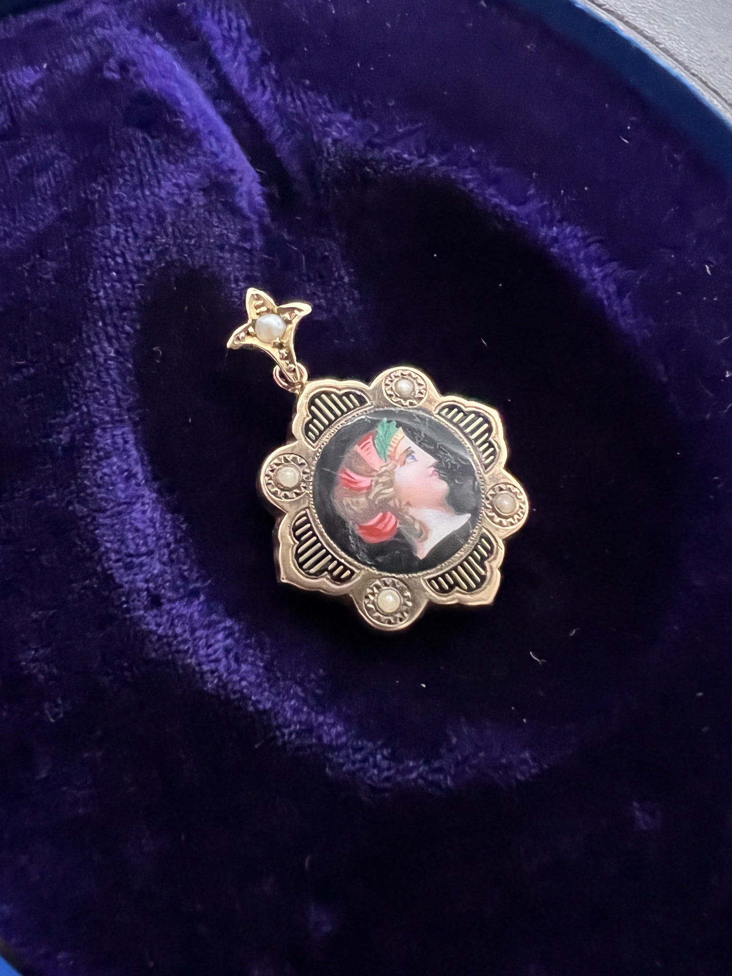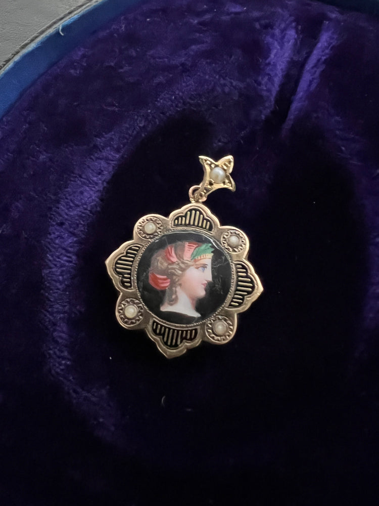 A 15ct and enamel portrait pendant with 4 seed pearls!