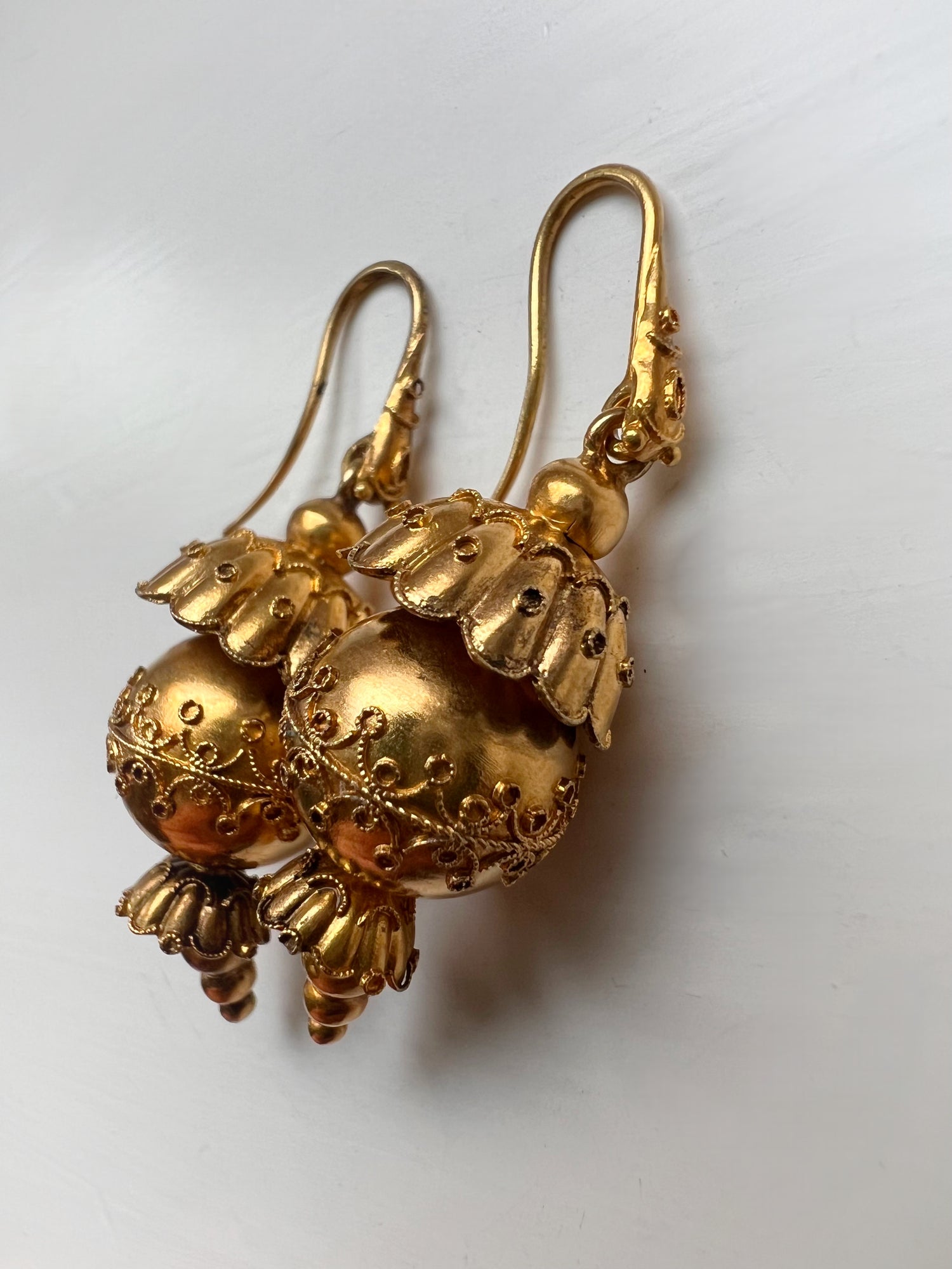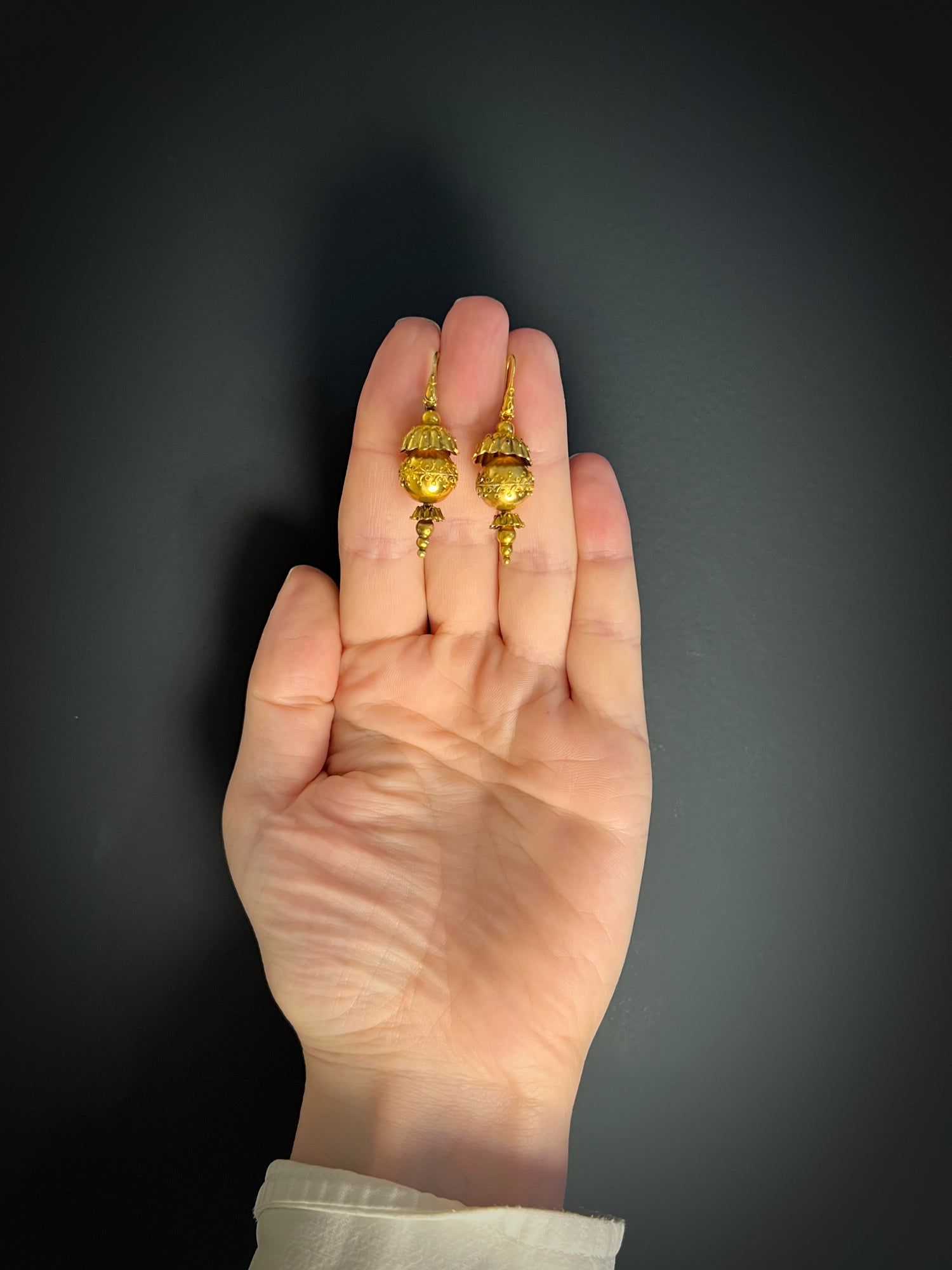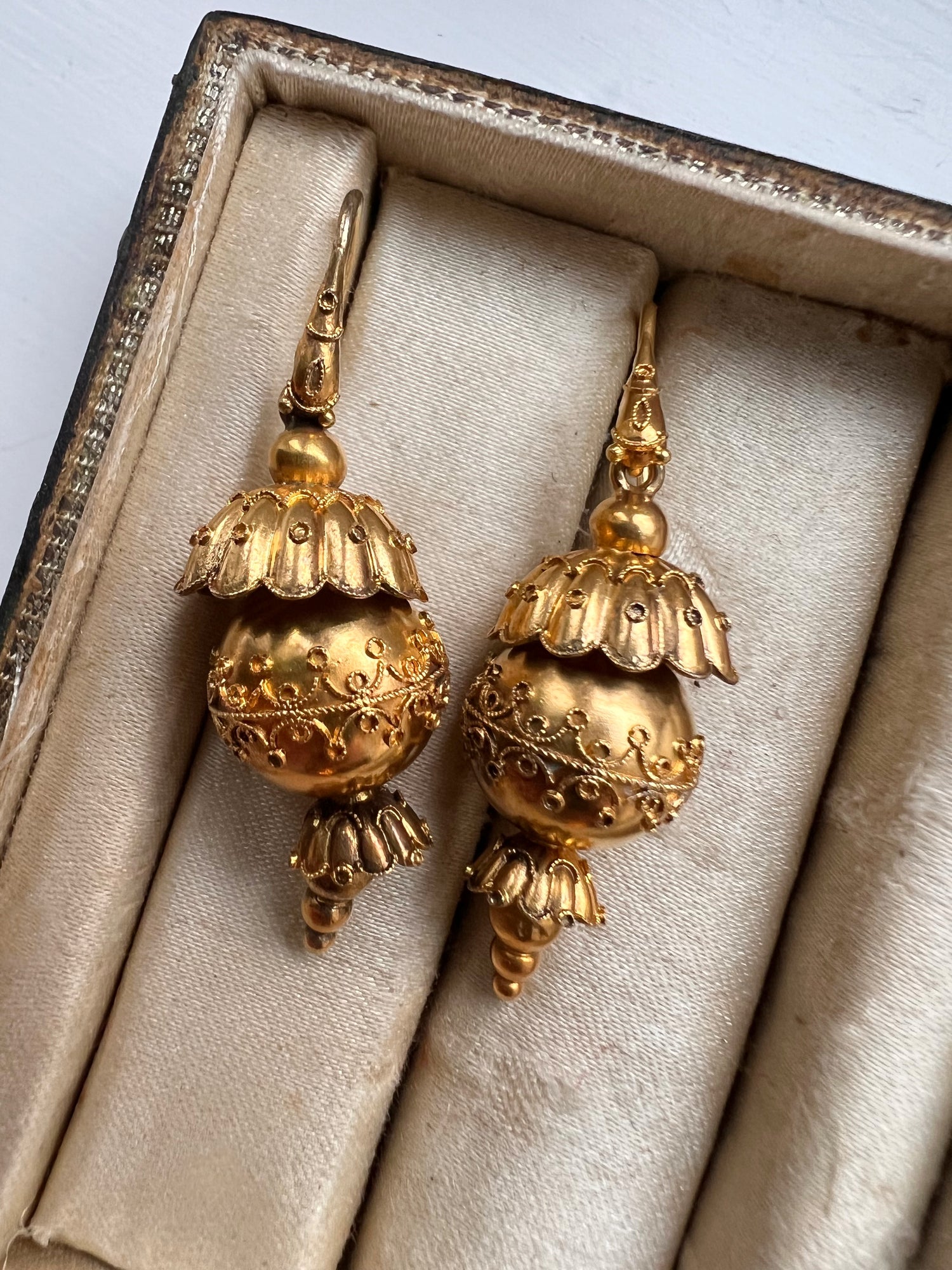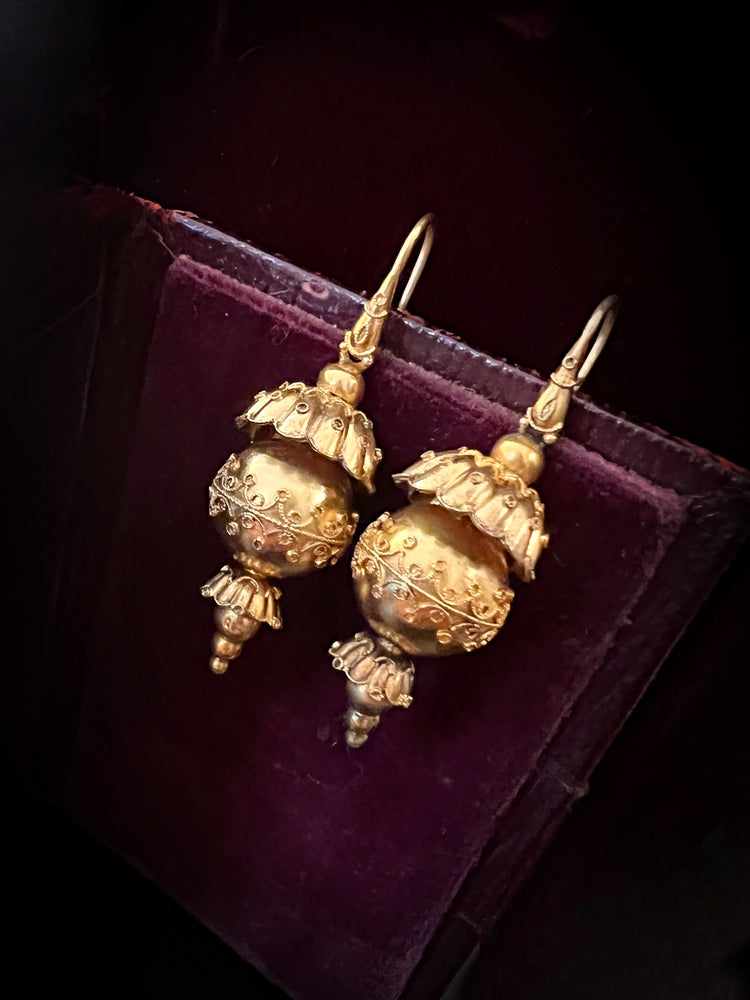 A stunning pair of Etruscan Revival 15ct gold snake & sphere earrings.