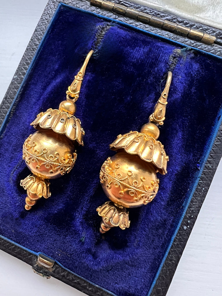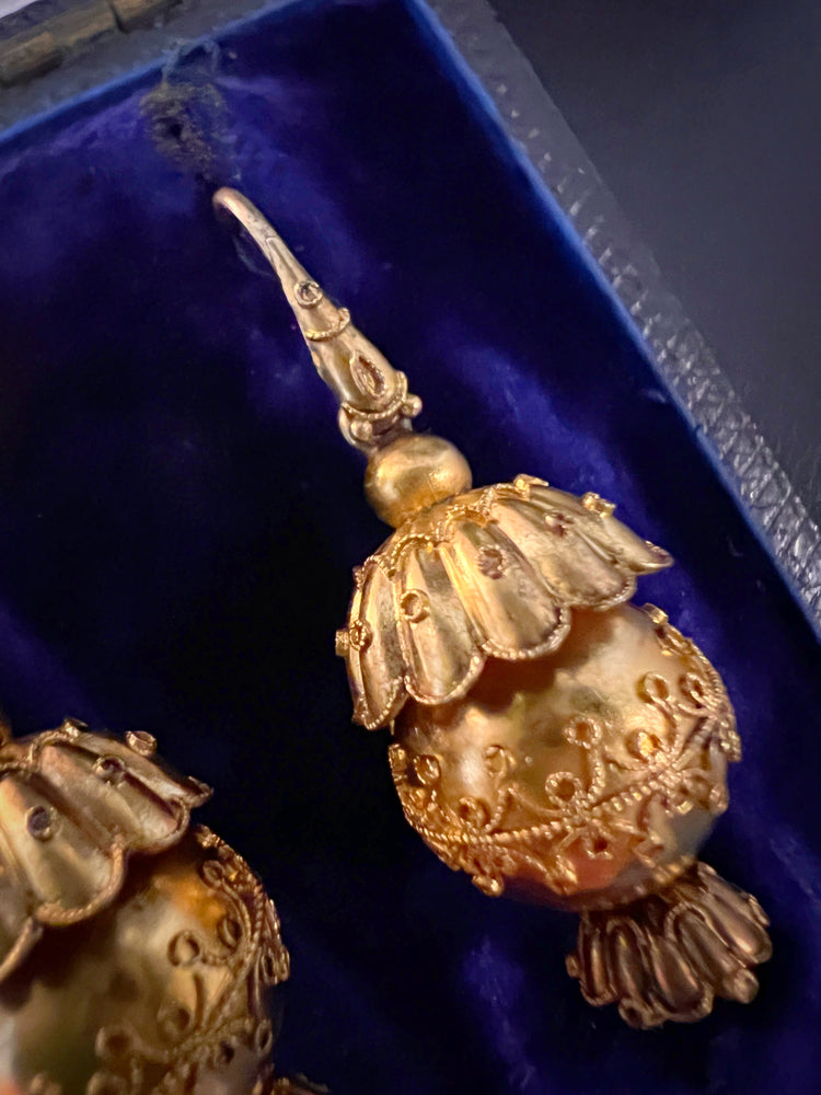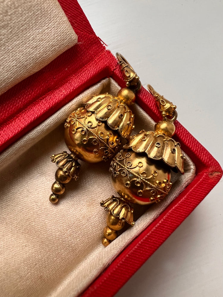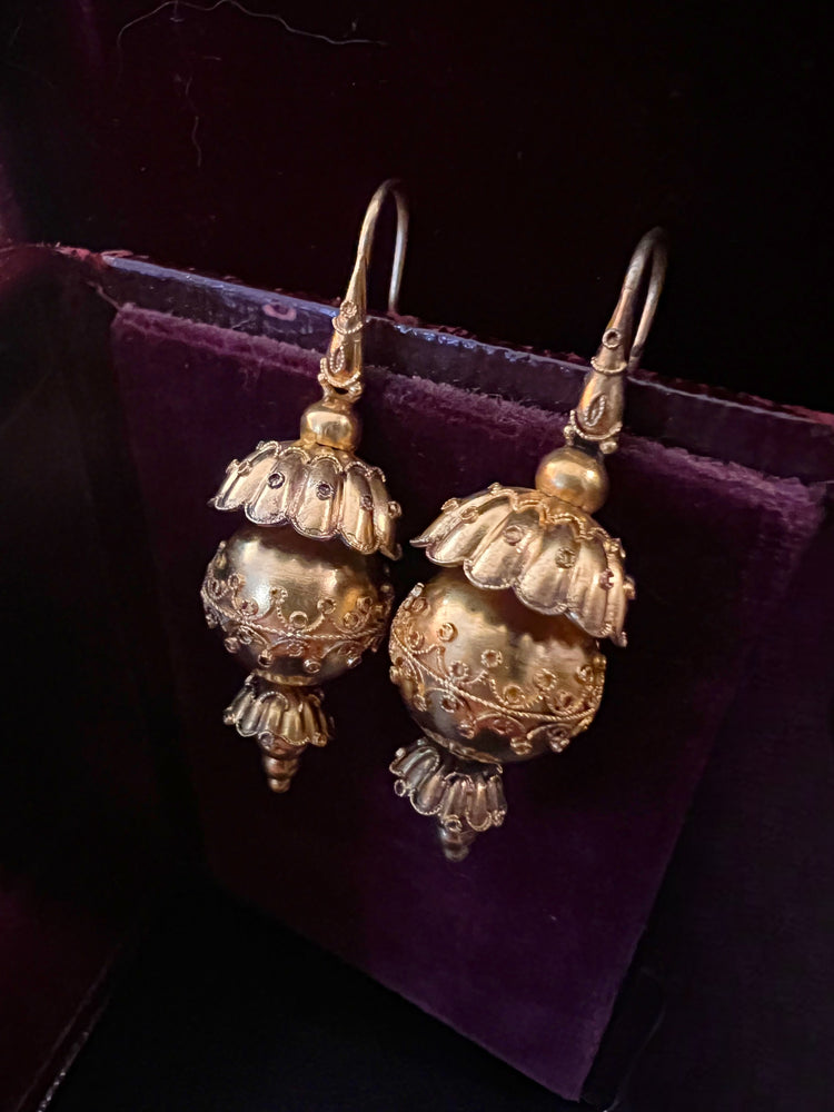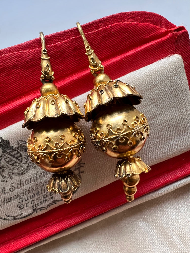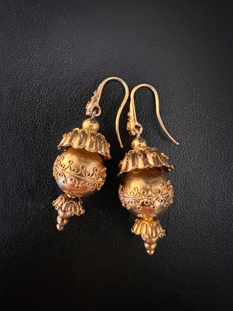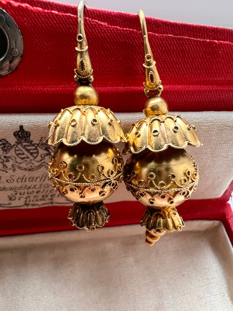 A stunning pair of Etruscan Revival 15ct gold snake & sphere earrings.