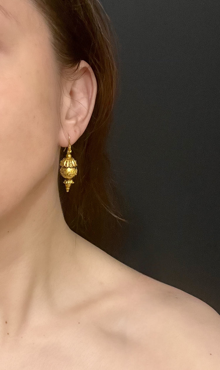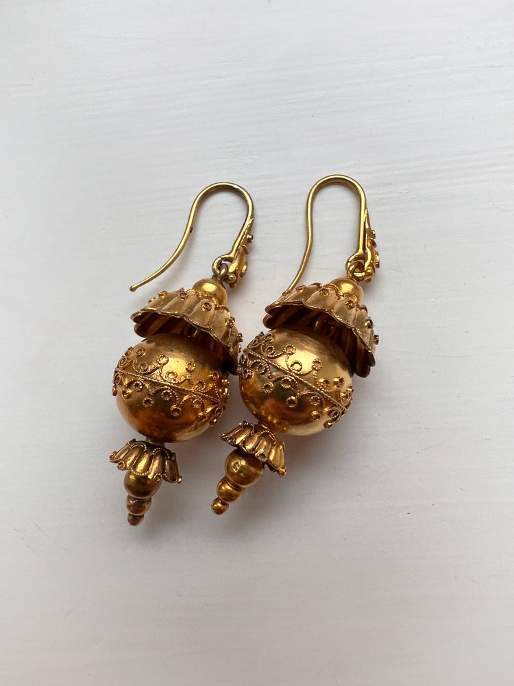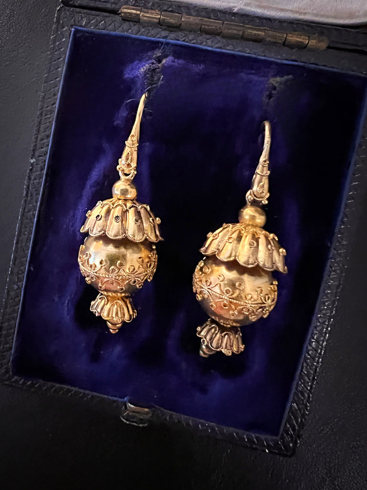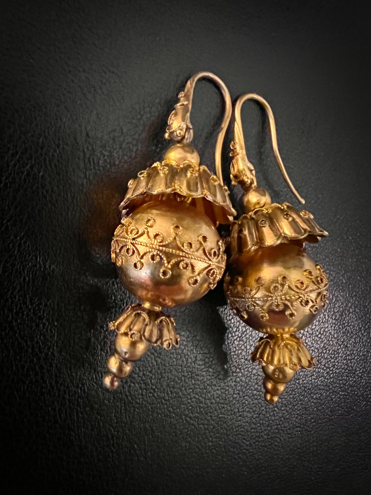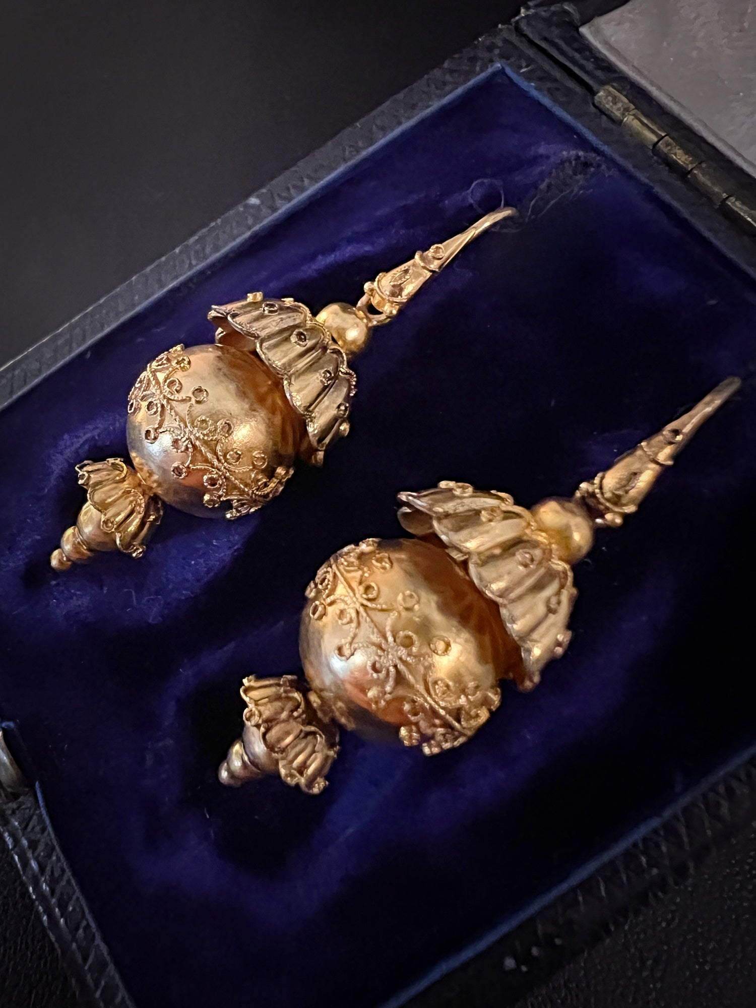 A stunning pair of Etruscan Revival 15ct gold snake & sphere earrings.