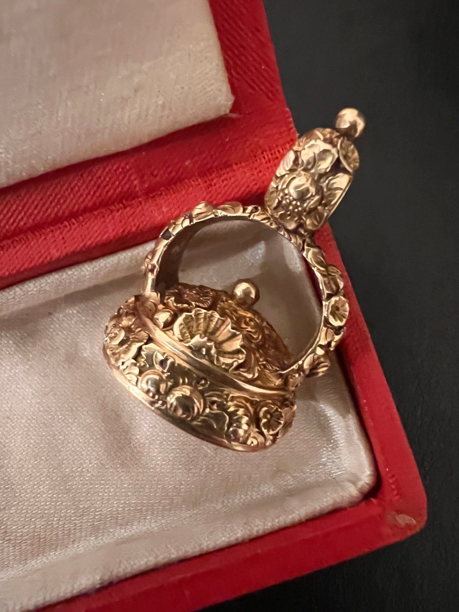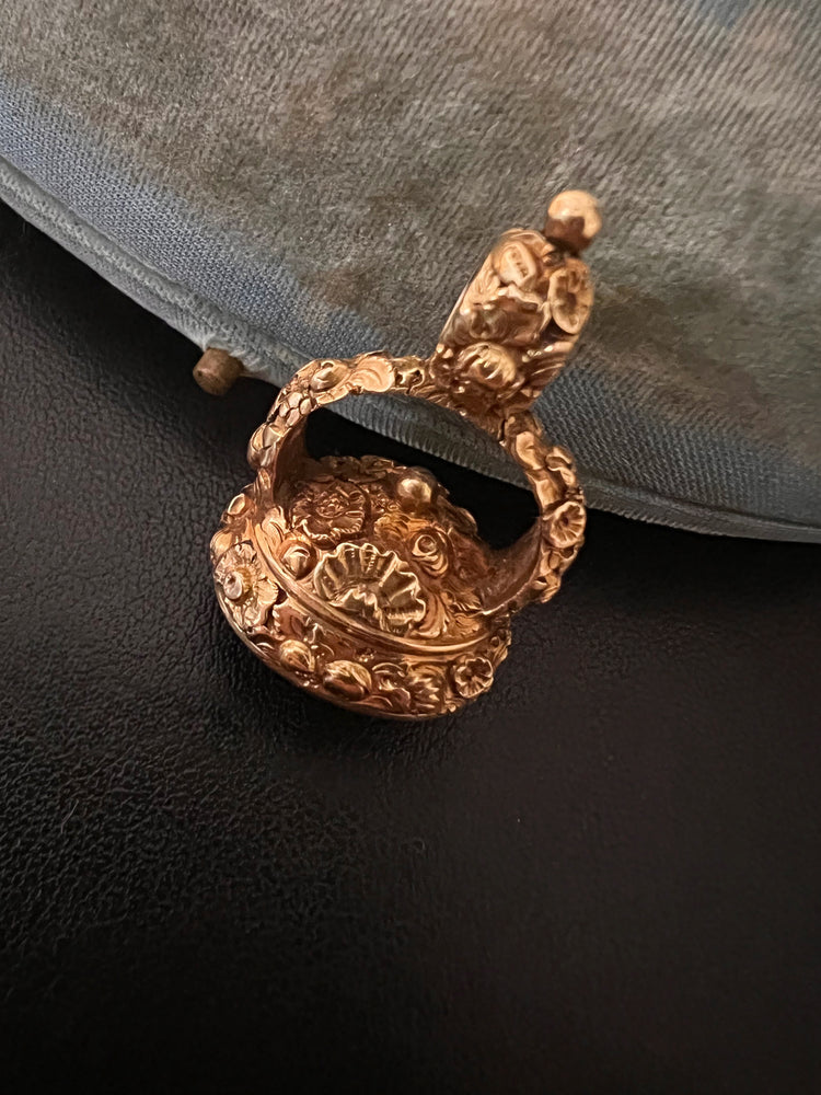 The heavy, gorgeously crunchy chasing covers the entire fob and bail with patterns of shells and flora & forna.