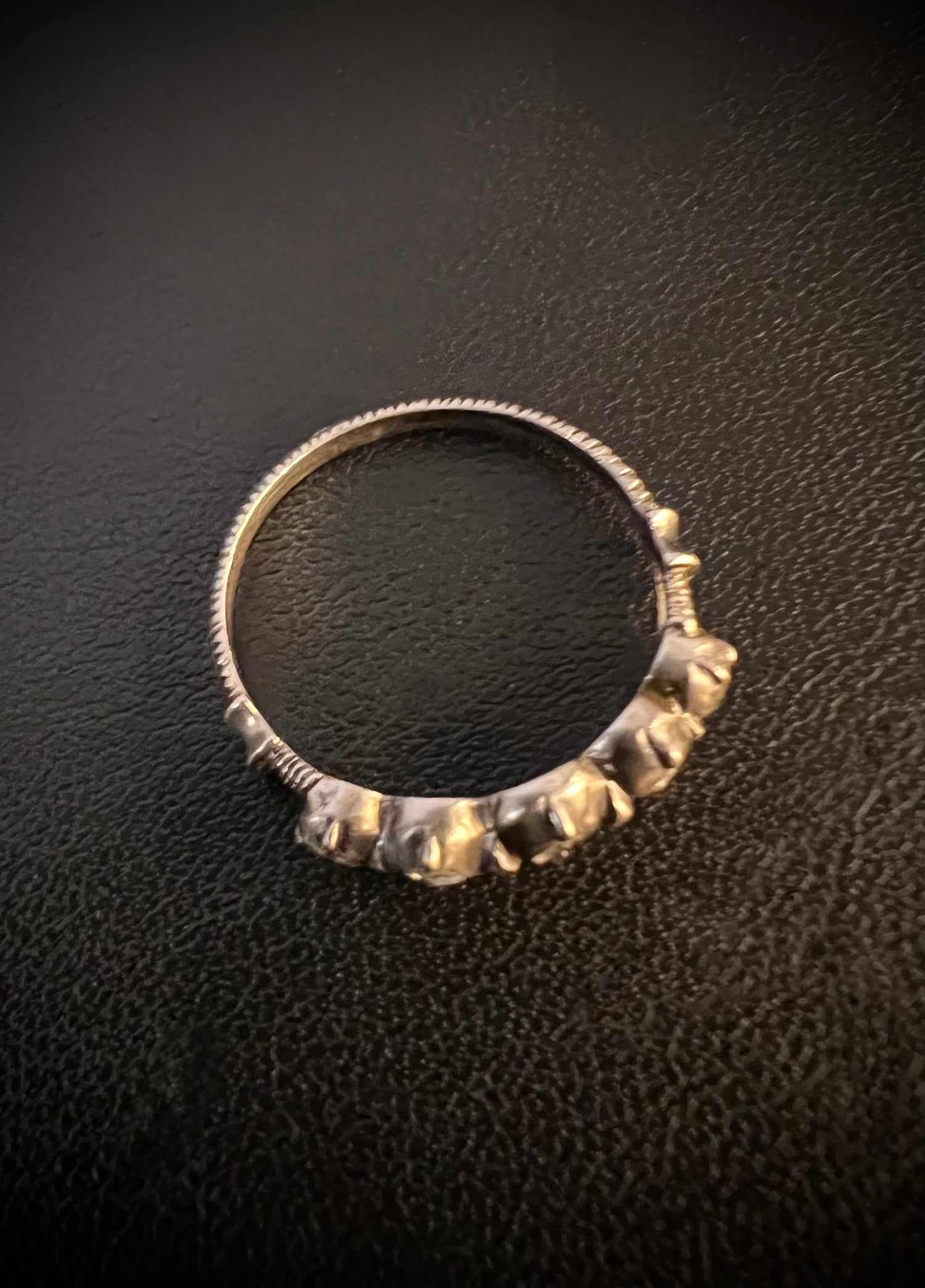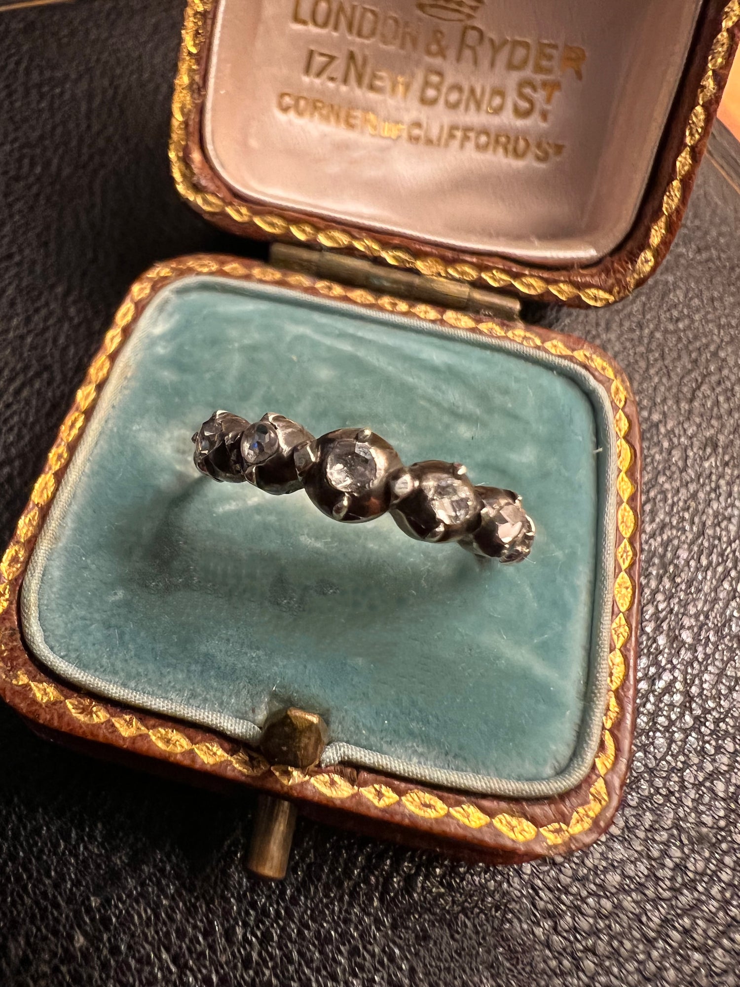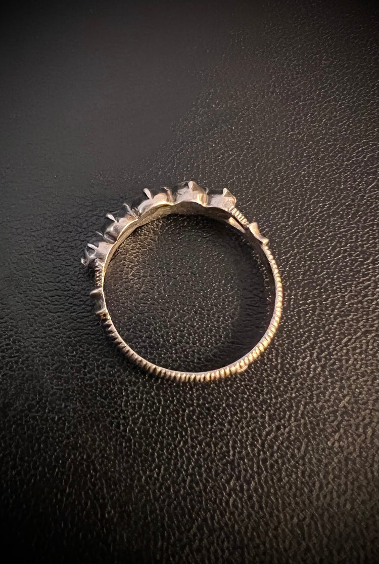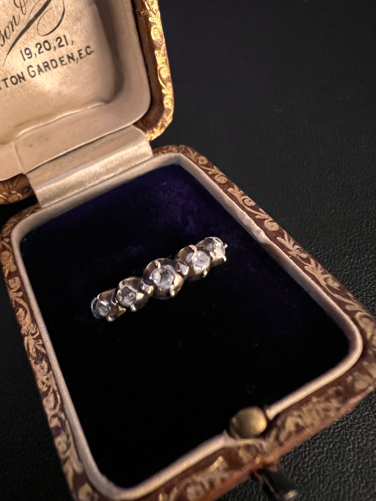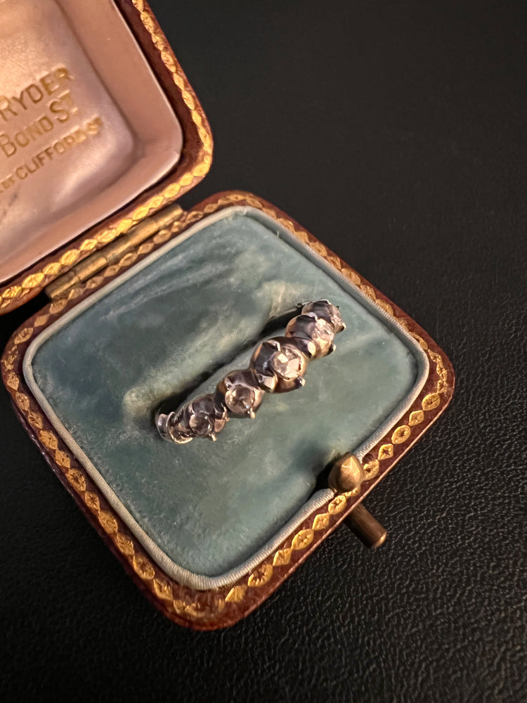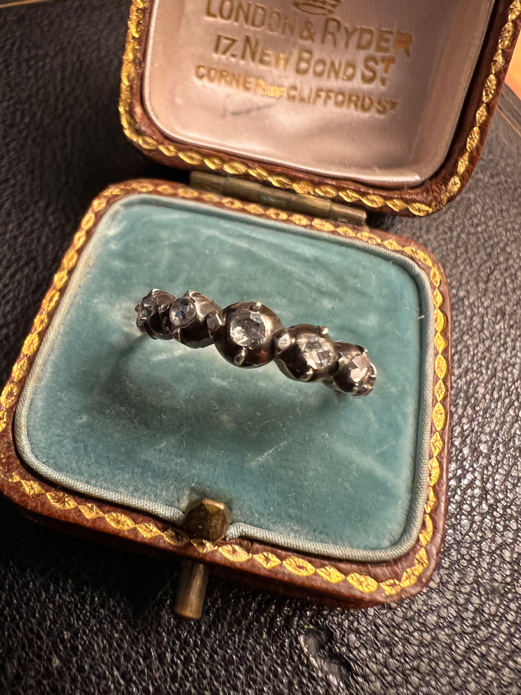 This is a gorgeous French late 19th century silver band set with five rose cut diamonds.