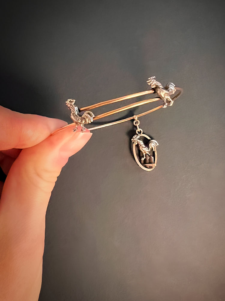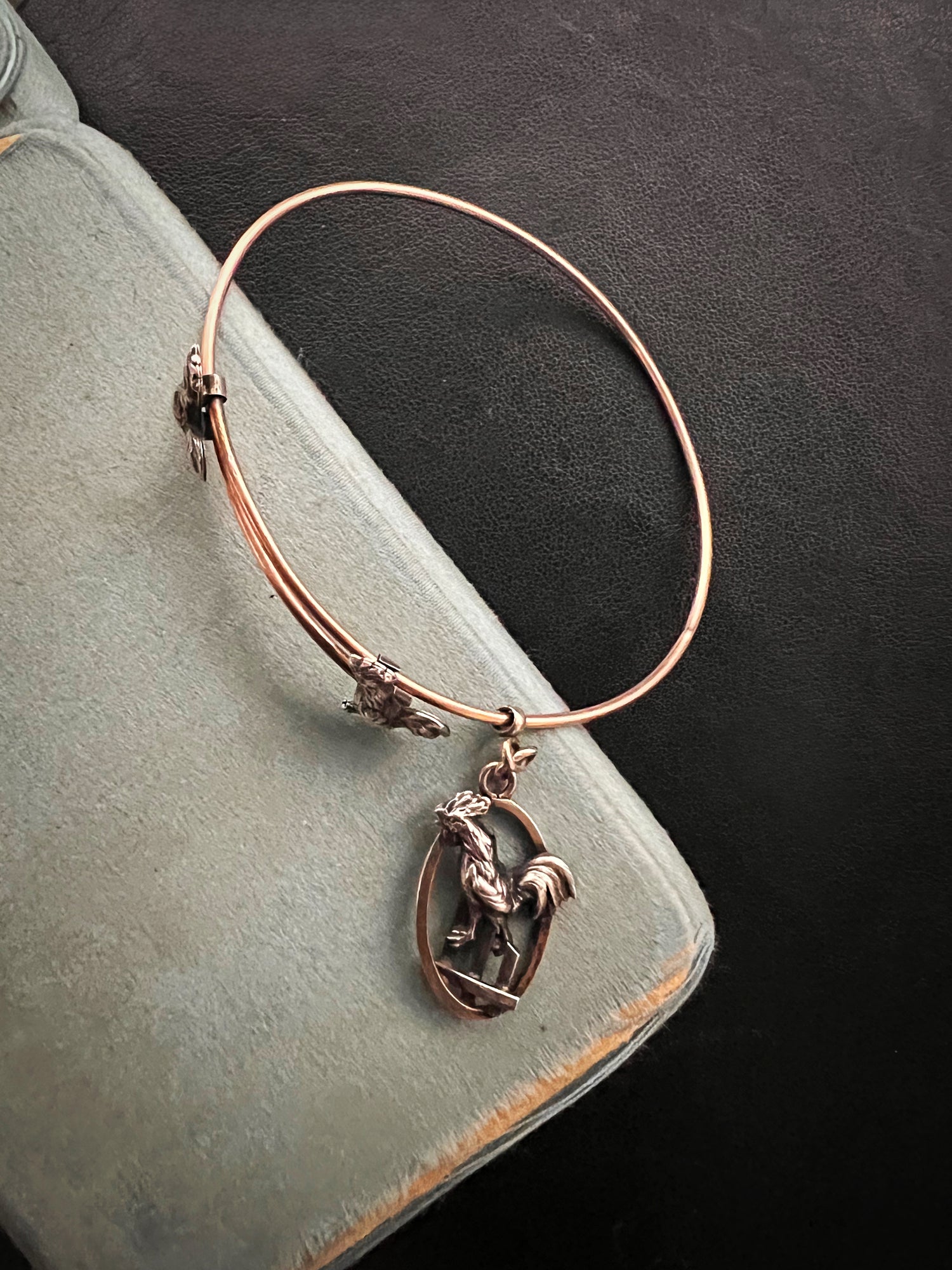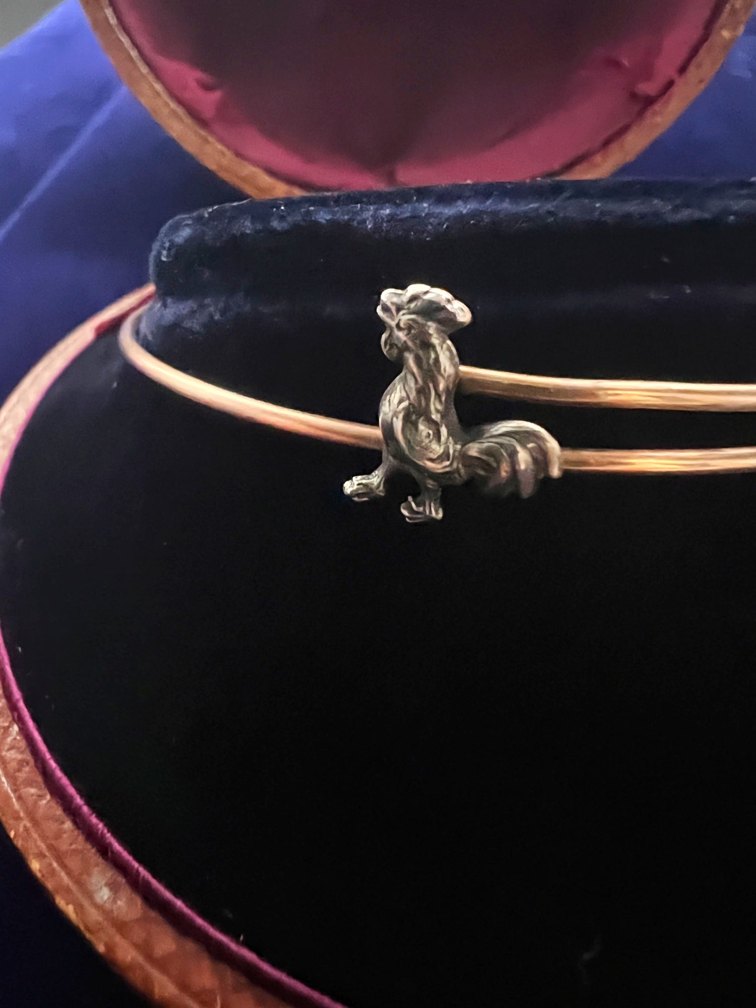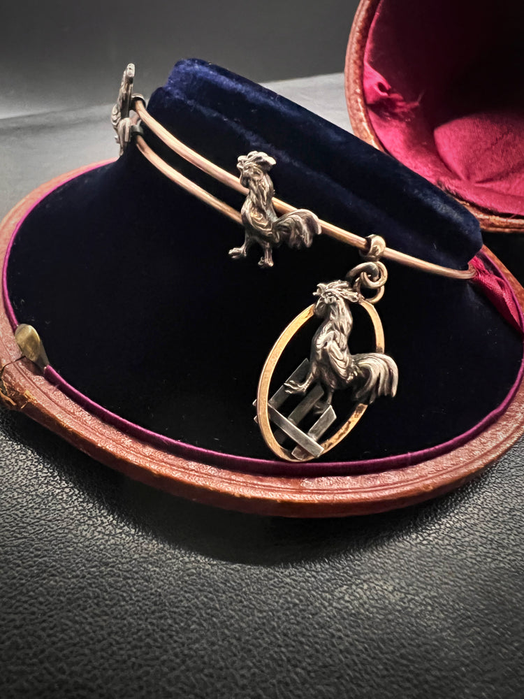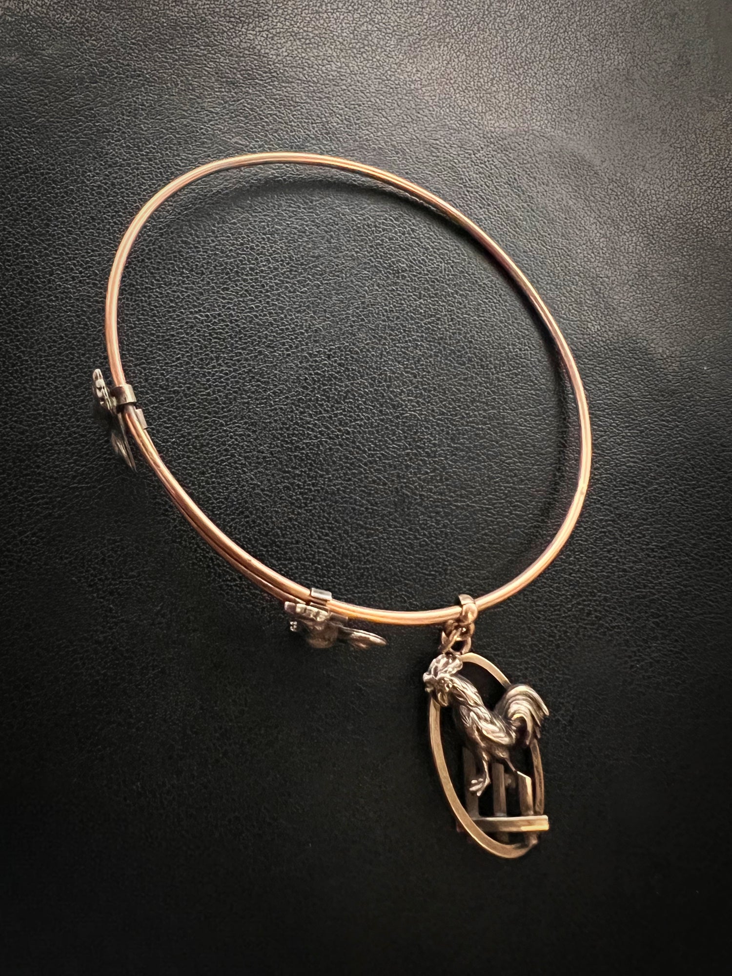 A lovely rose gold fine bangle with two silver Rooster finials, and a large Rooster pendant charm.