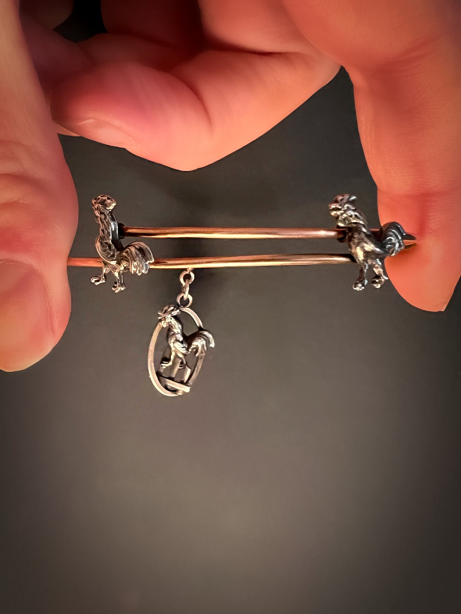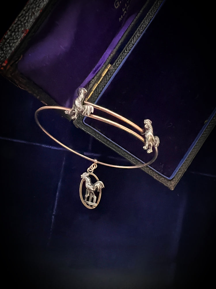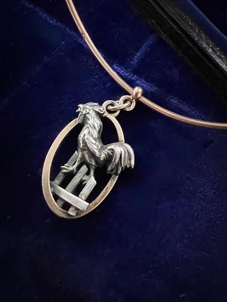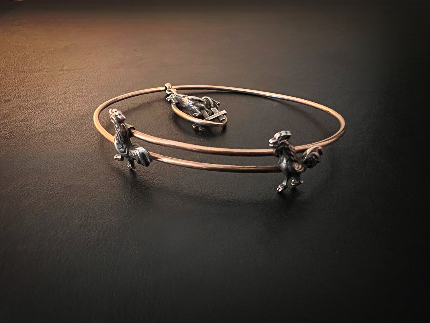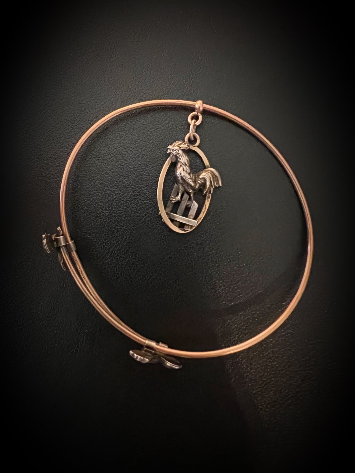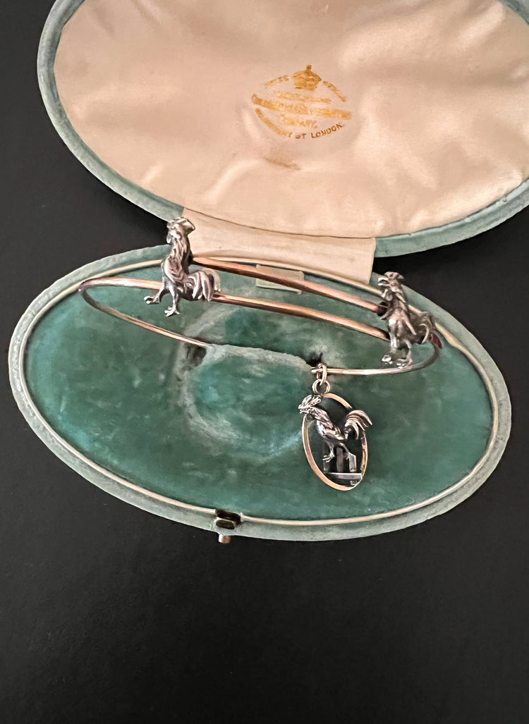 A lovely rose gold fine bangle with two silver Rooster finials, and a large Rooster pendant charm.