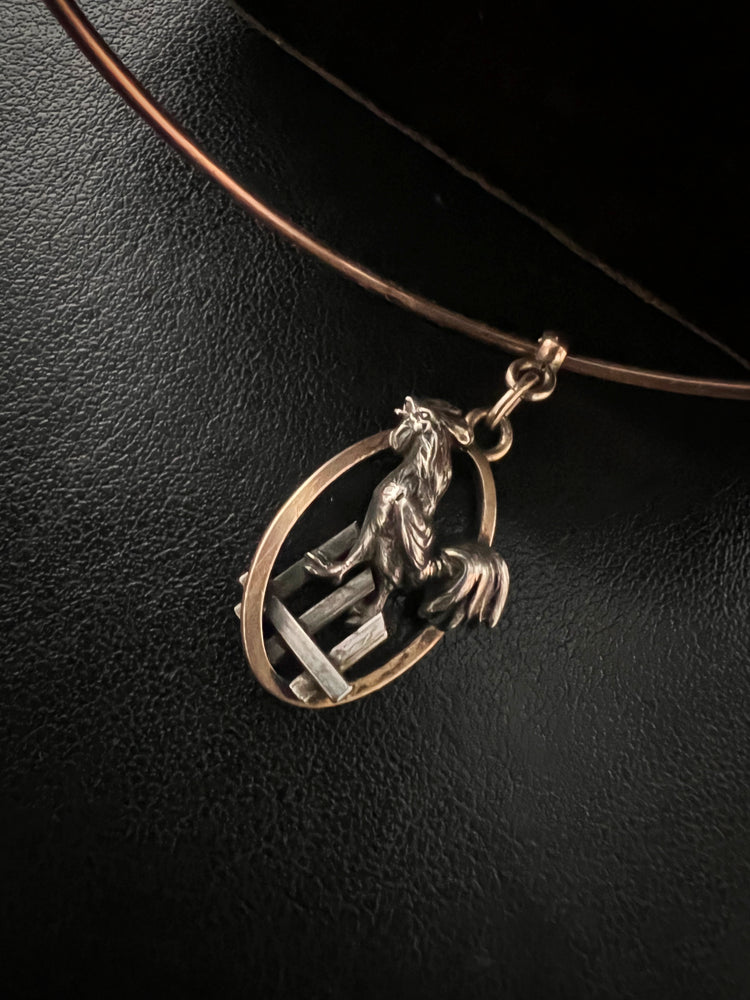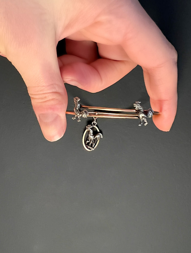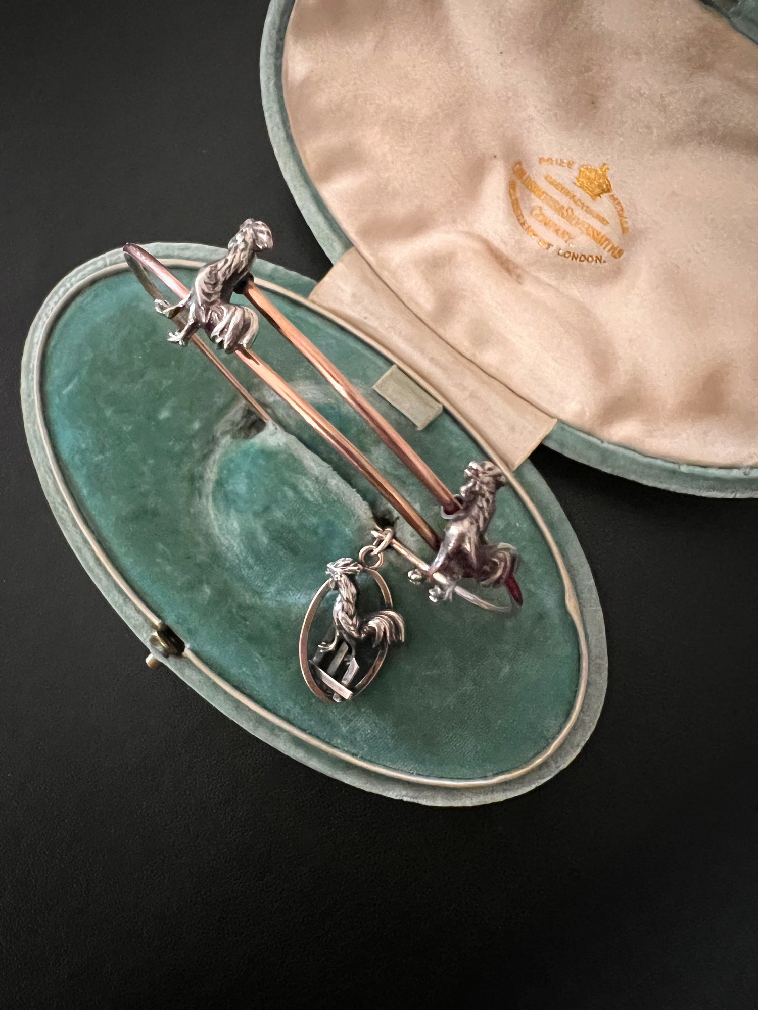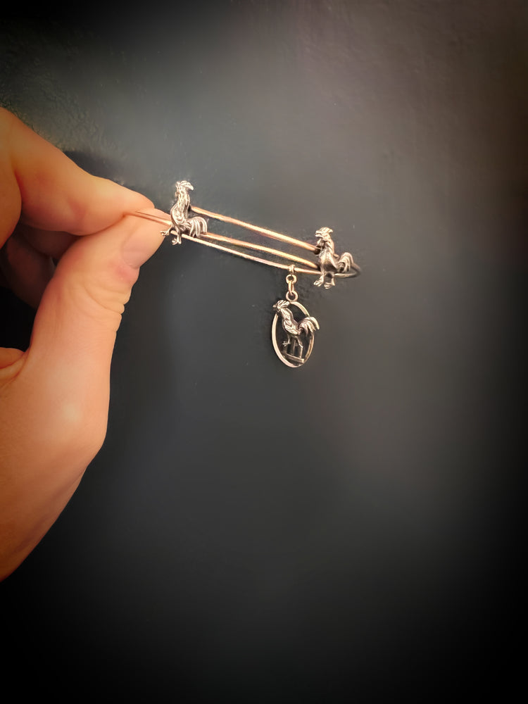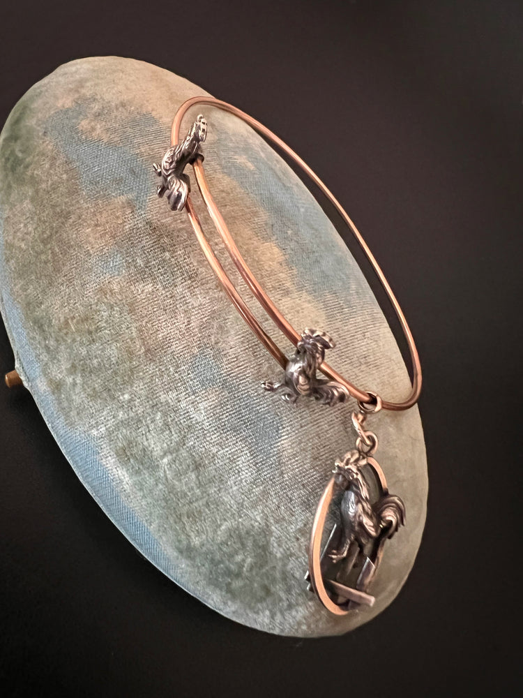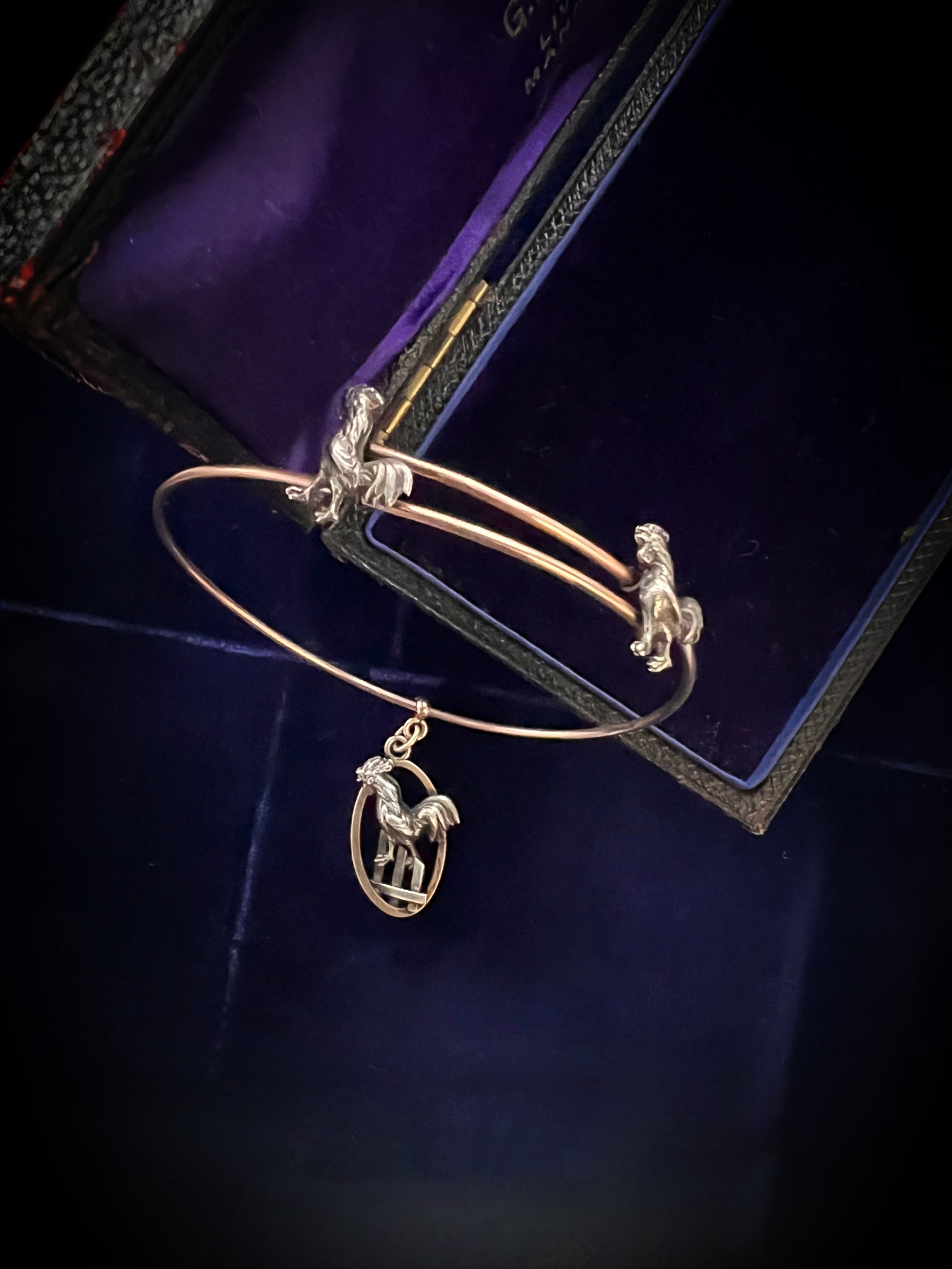 A lovely rose gold fine bangle with two silver Rooster finials, and a large Rooster pendant charm.
