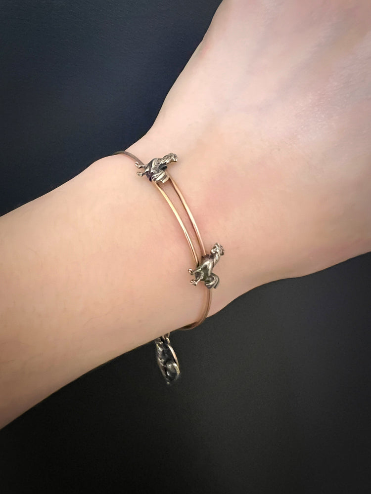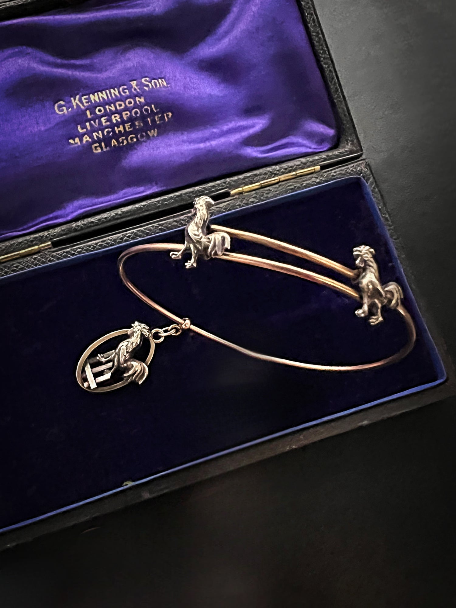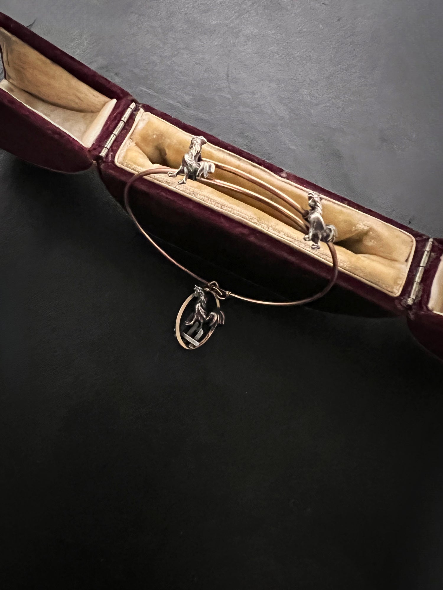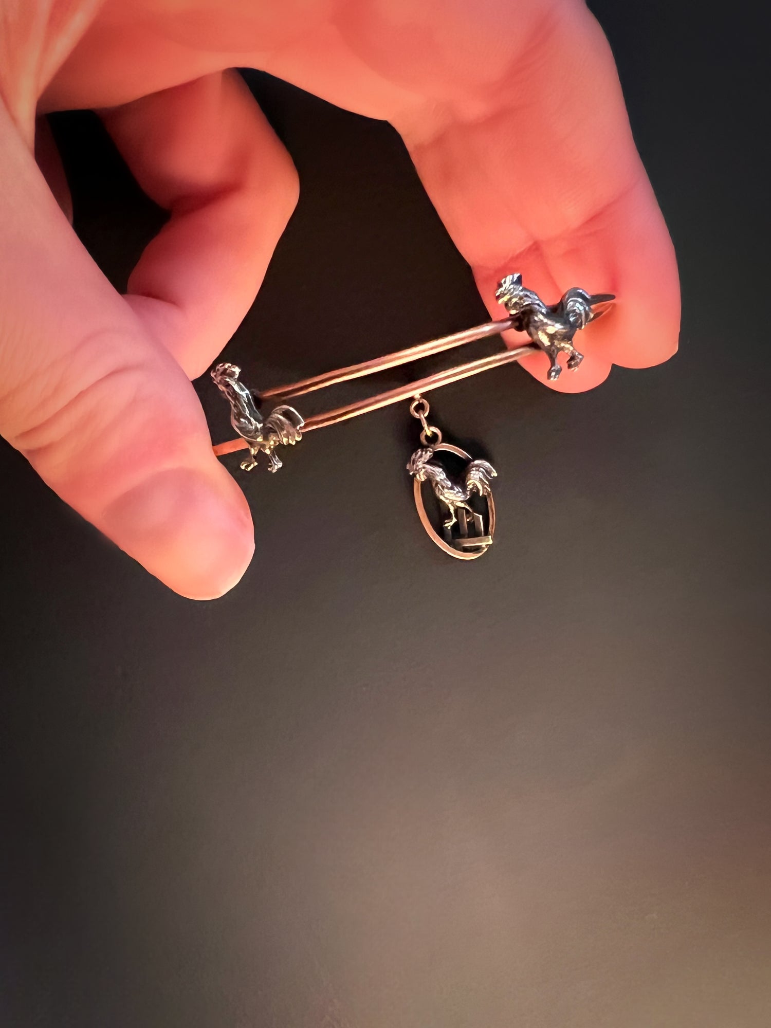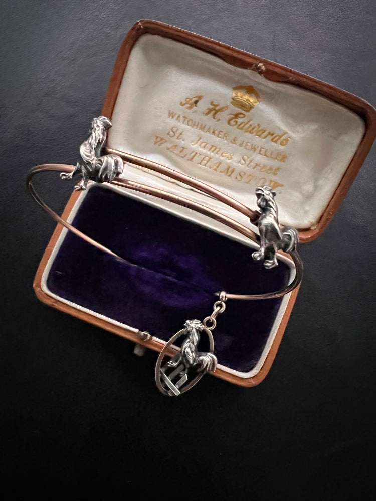 A lovely rose gold fine bangle with two silver Rooster finials, and a large Rooster pendant charm.