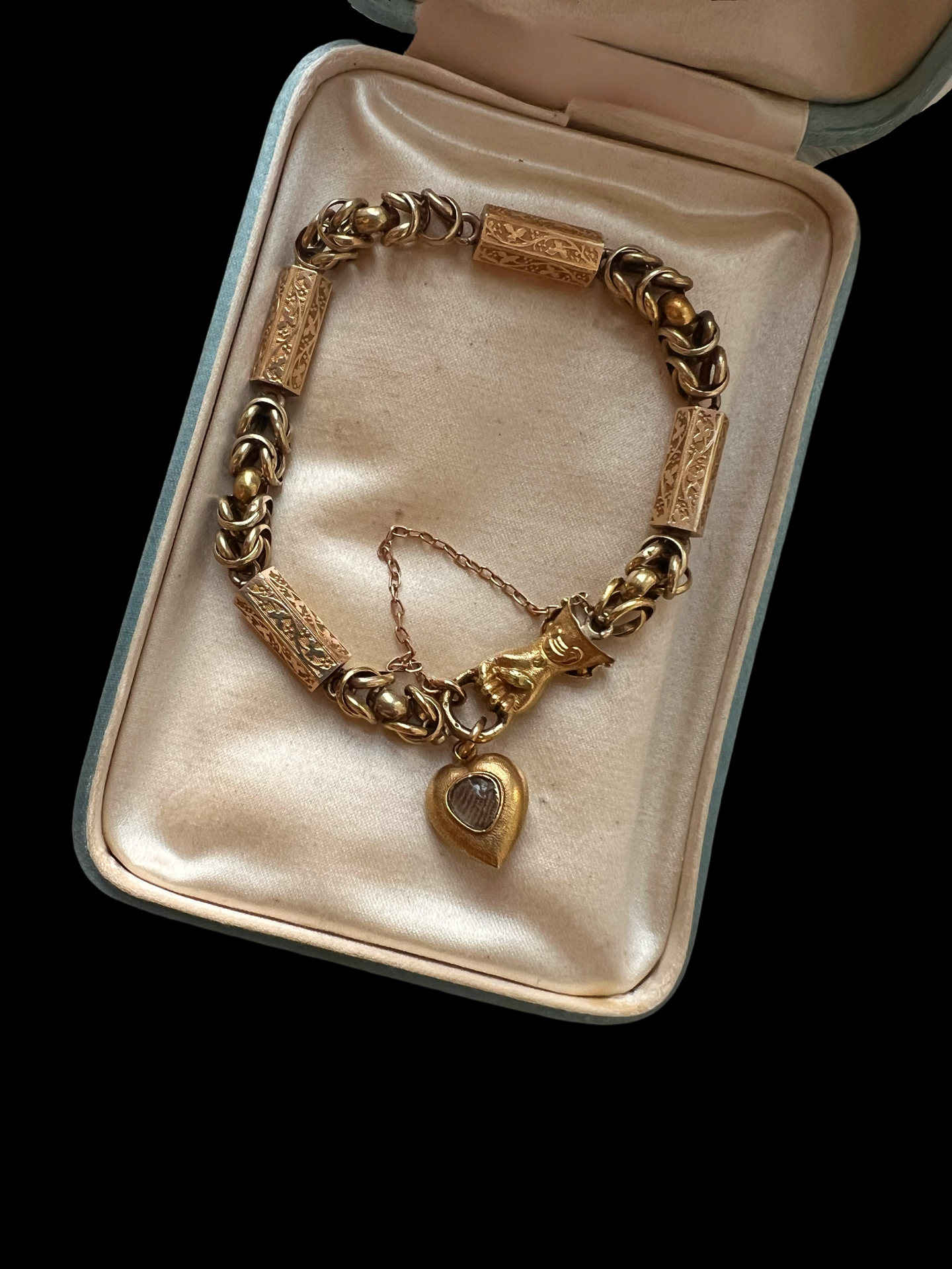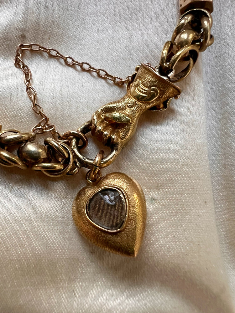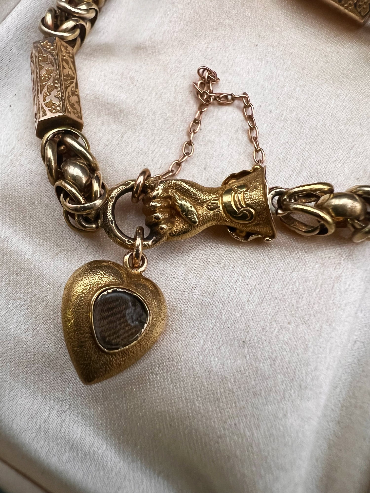 An absolutely stunning Georgian 15ct gold bracelet with a finely modelled hand and snake clasp, with matching puffy heart charm.